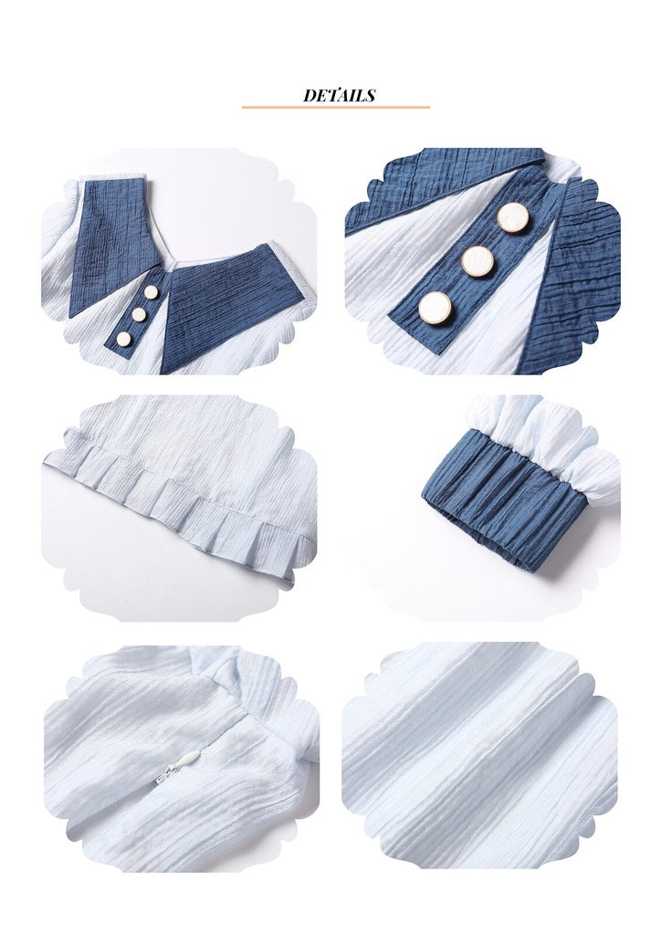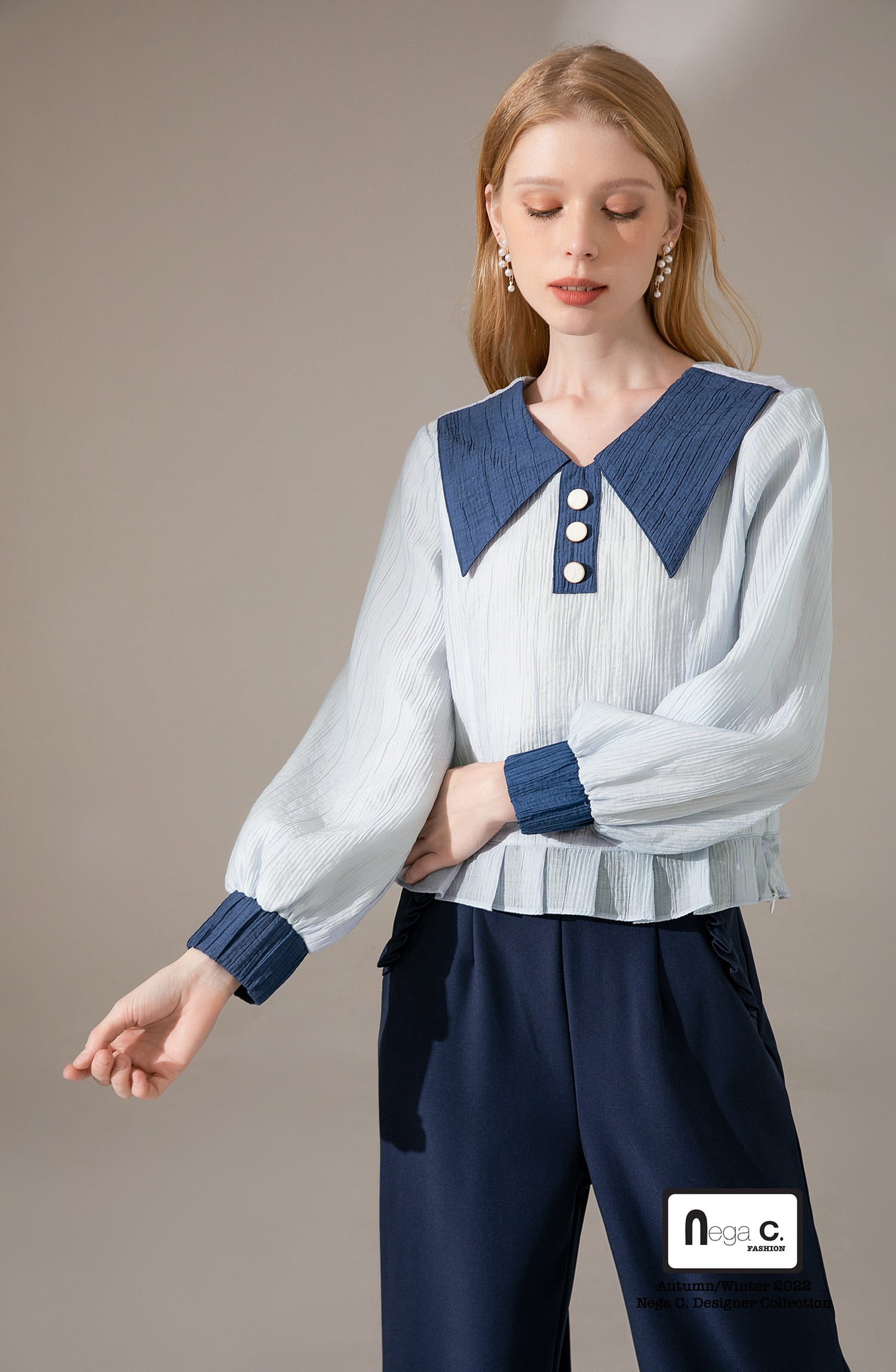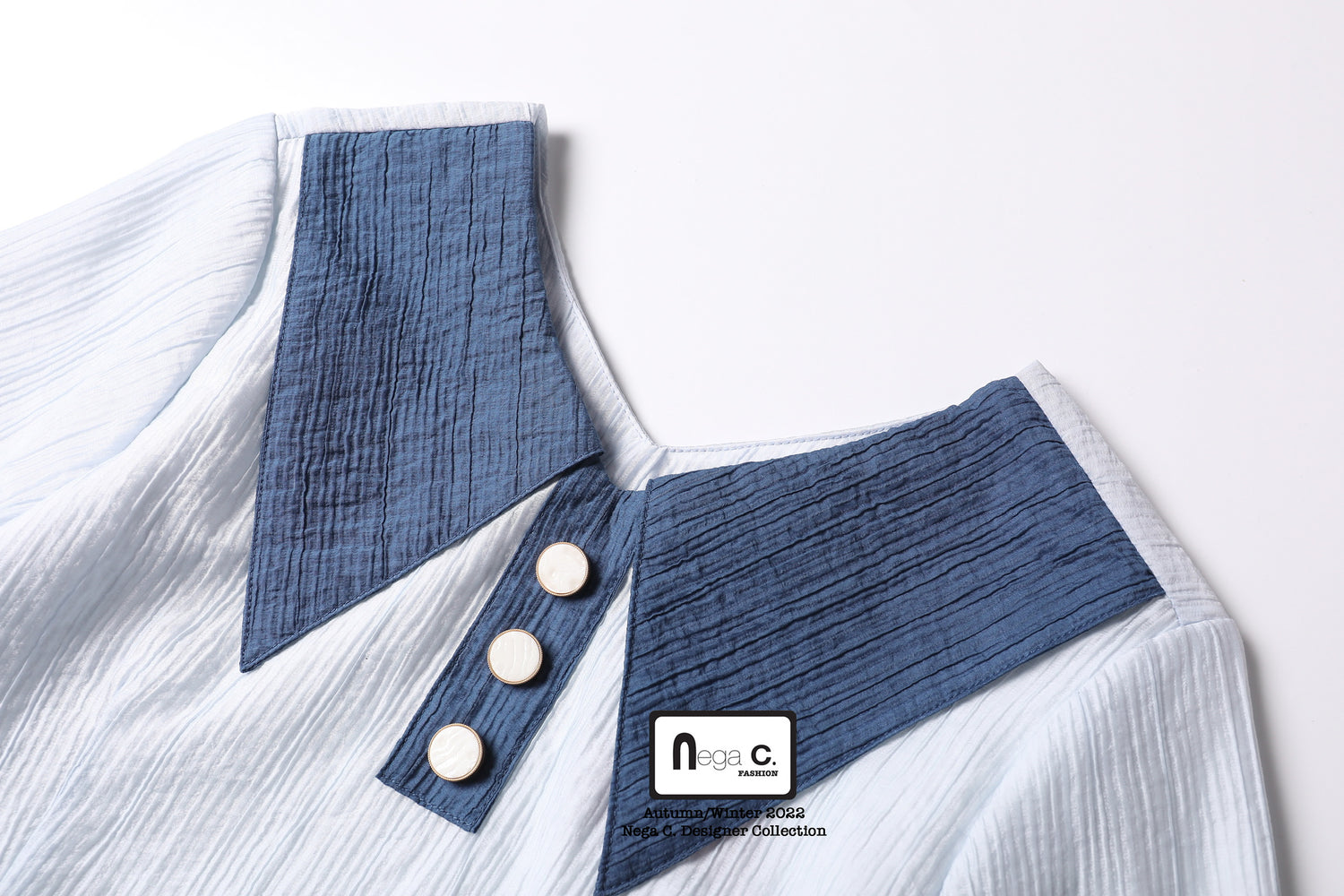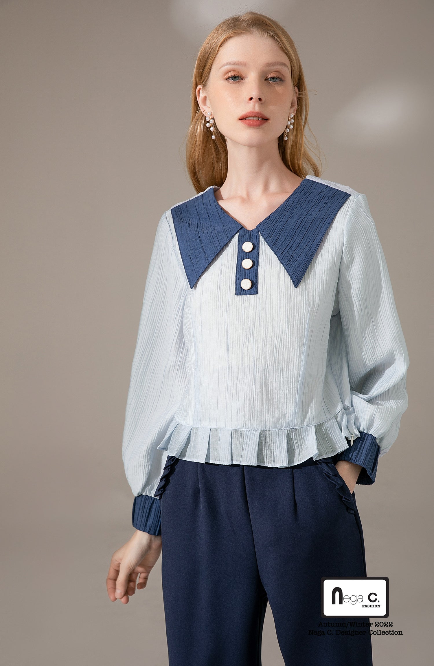 Nega C. 拼色尖領壓摺上衣|藍色|無彈|有裡襯
