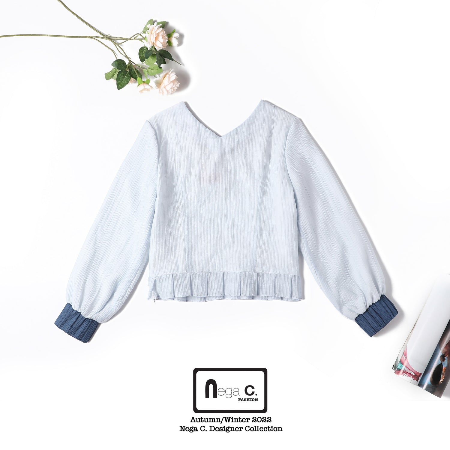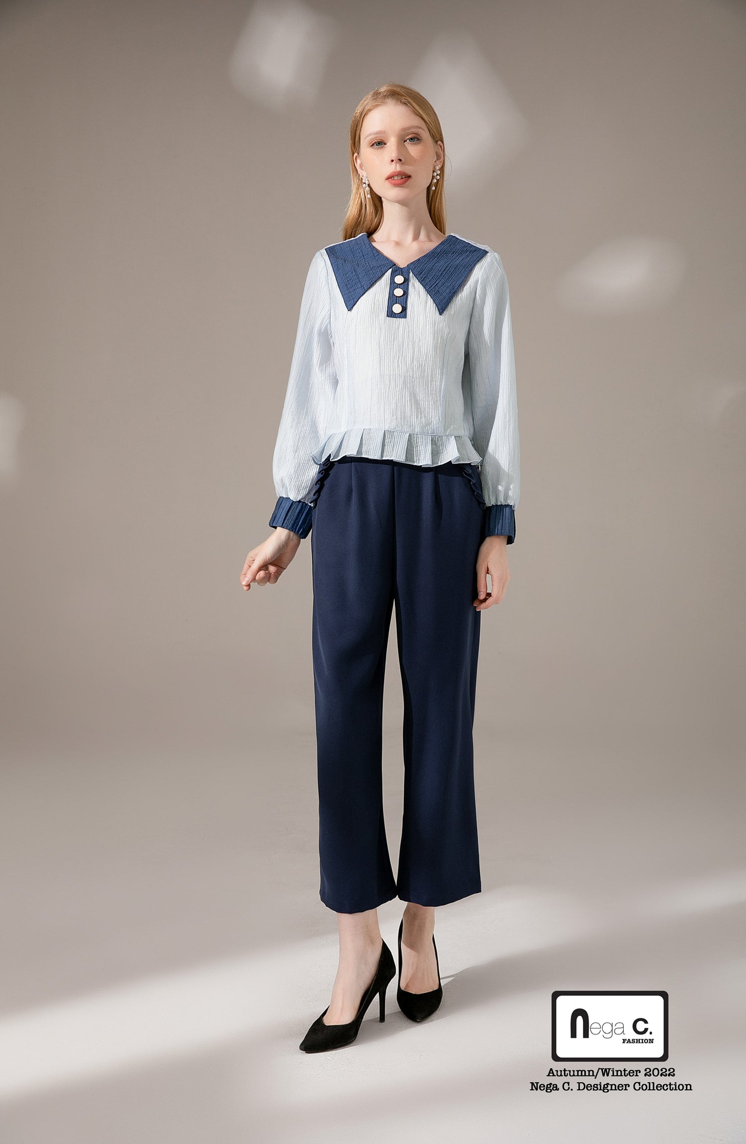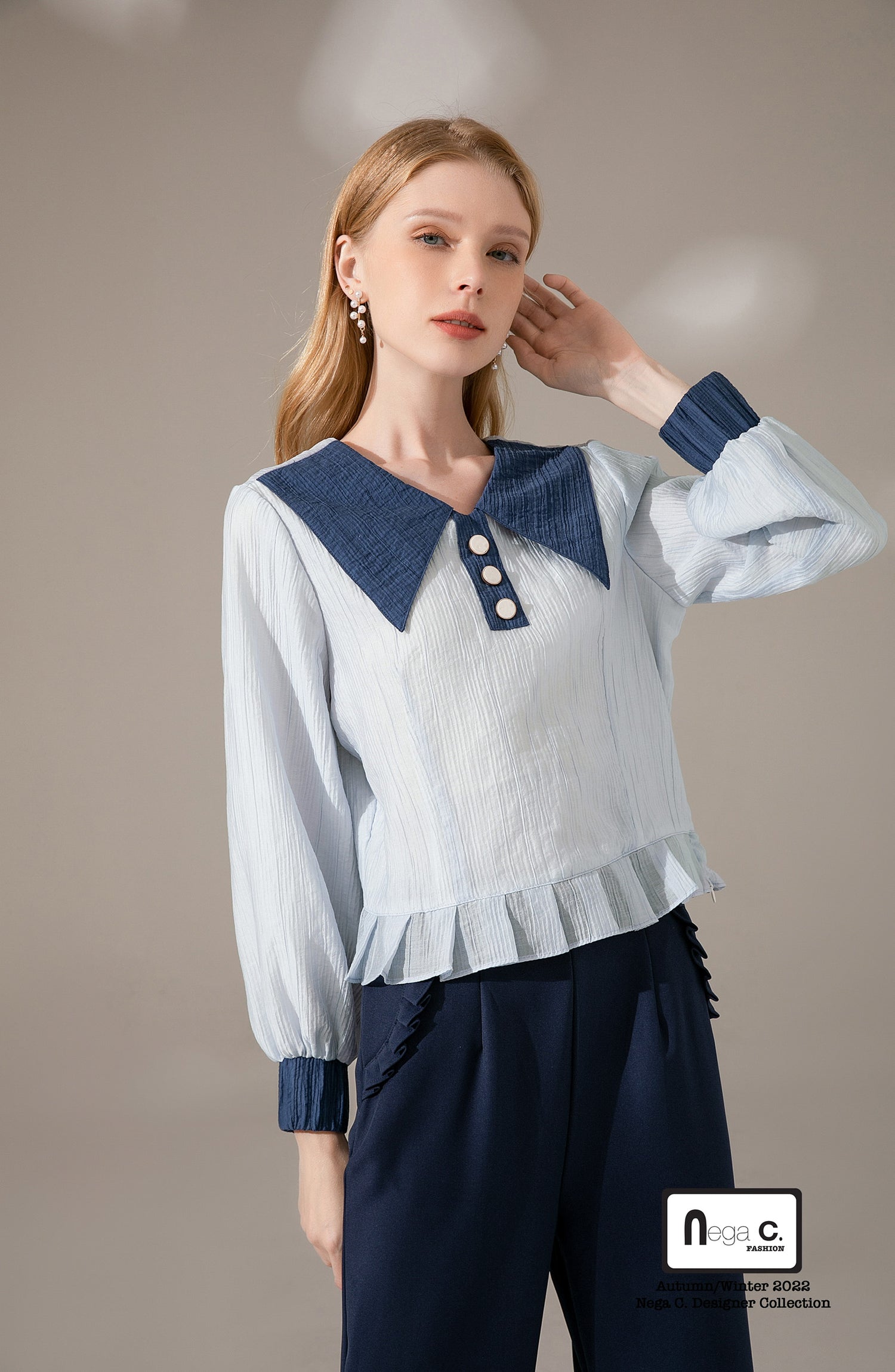 + Nega C. 拼色尖領壓摺上衣|藍色|無彈|有裡襯 +