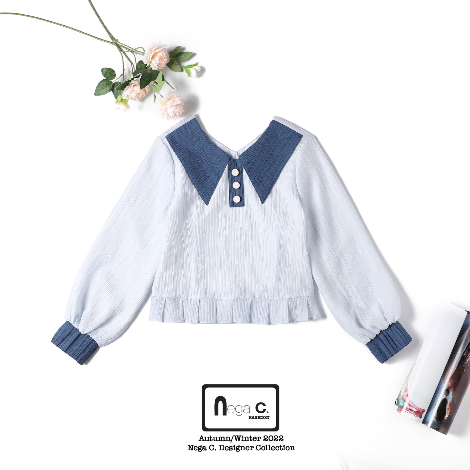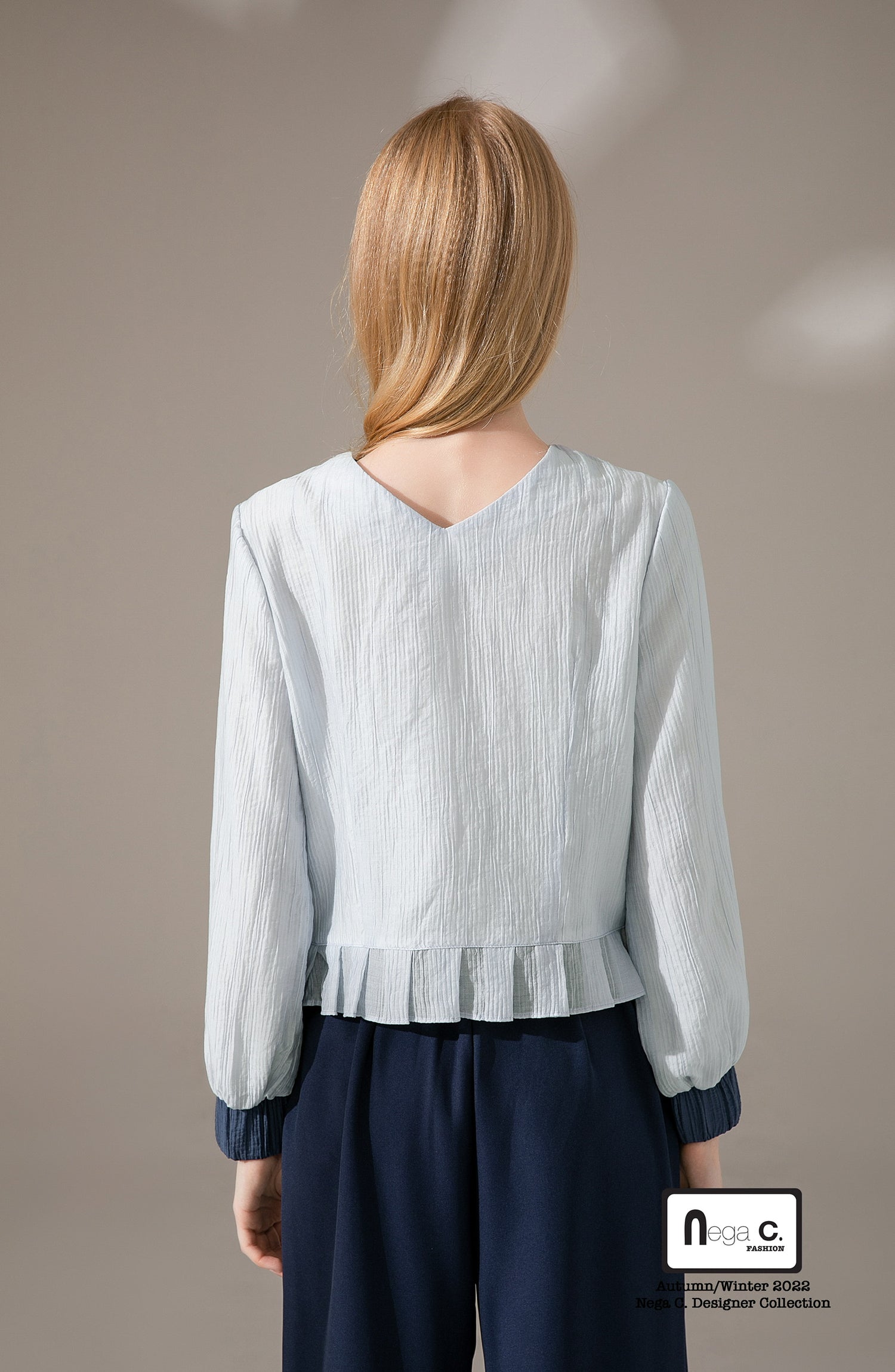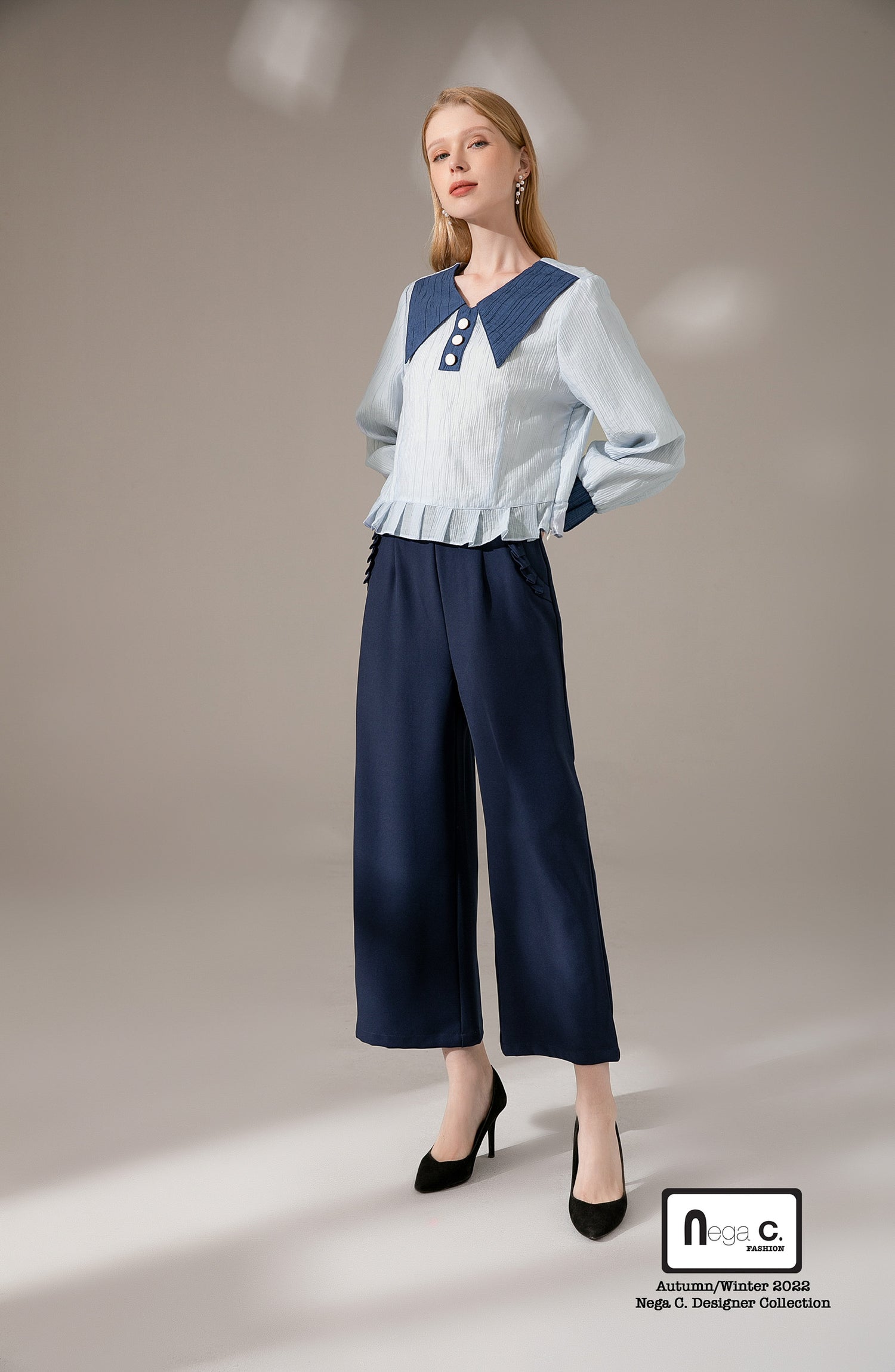 + Nega C. 拼色尖領壓摺上衣|藍色|無彈|有裡襯 +
