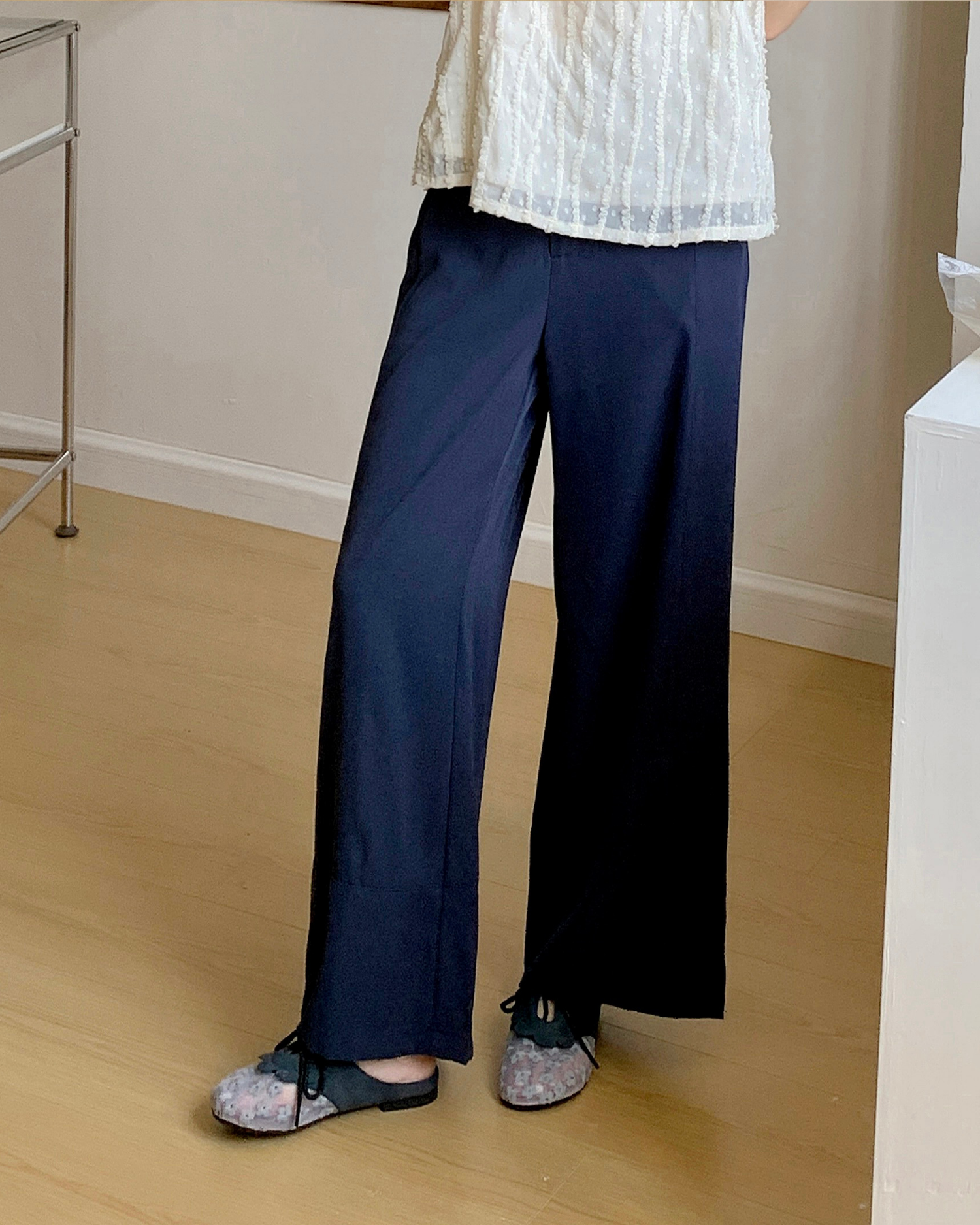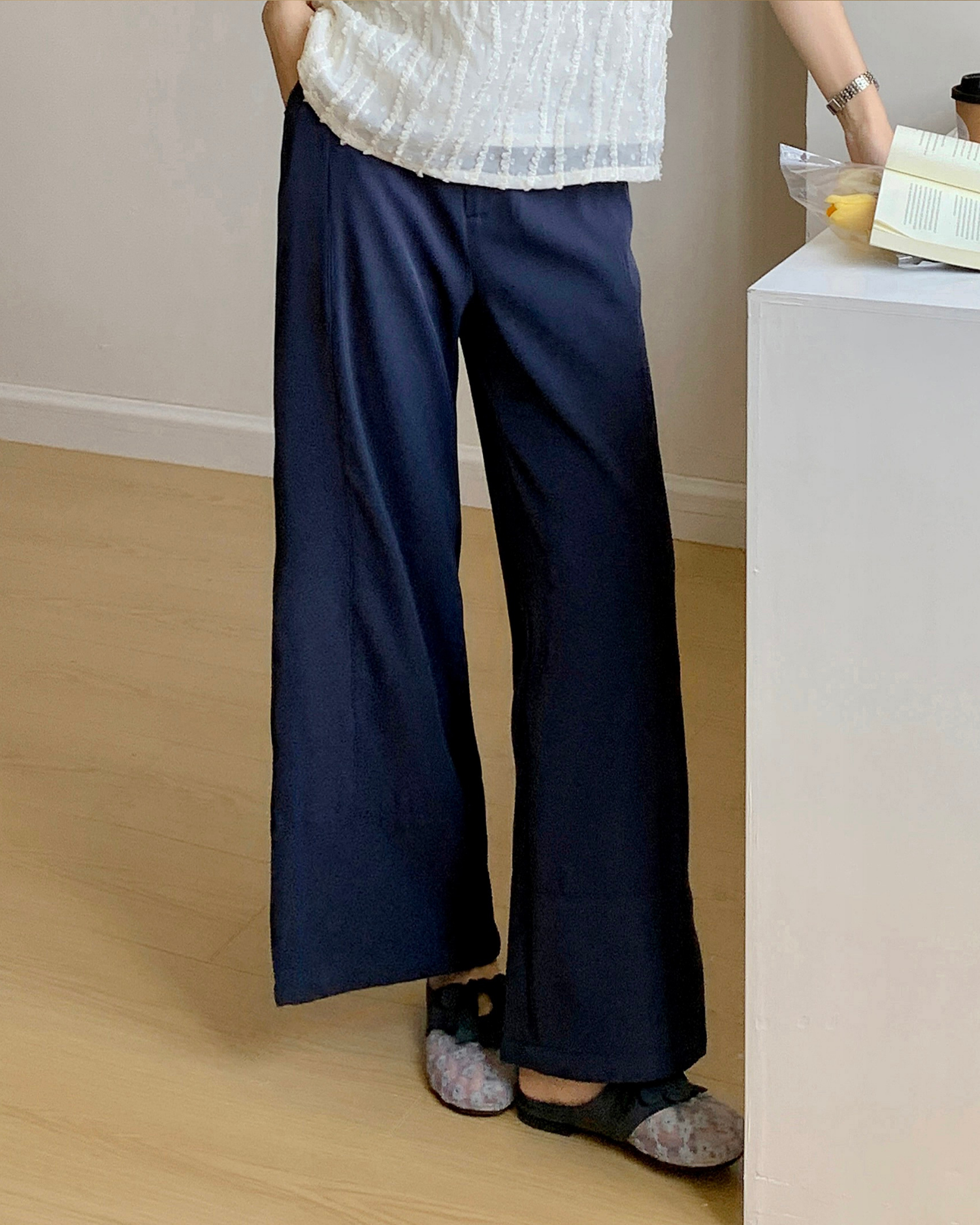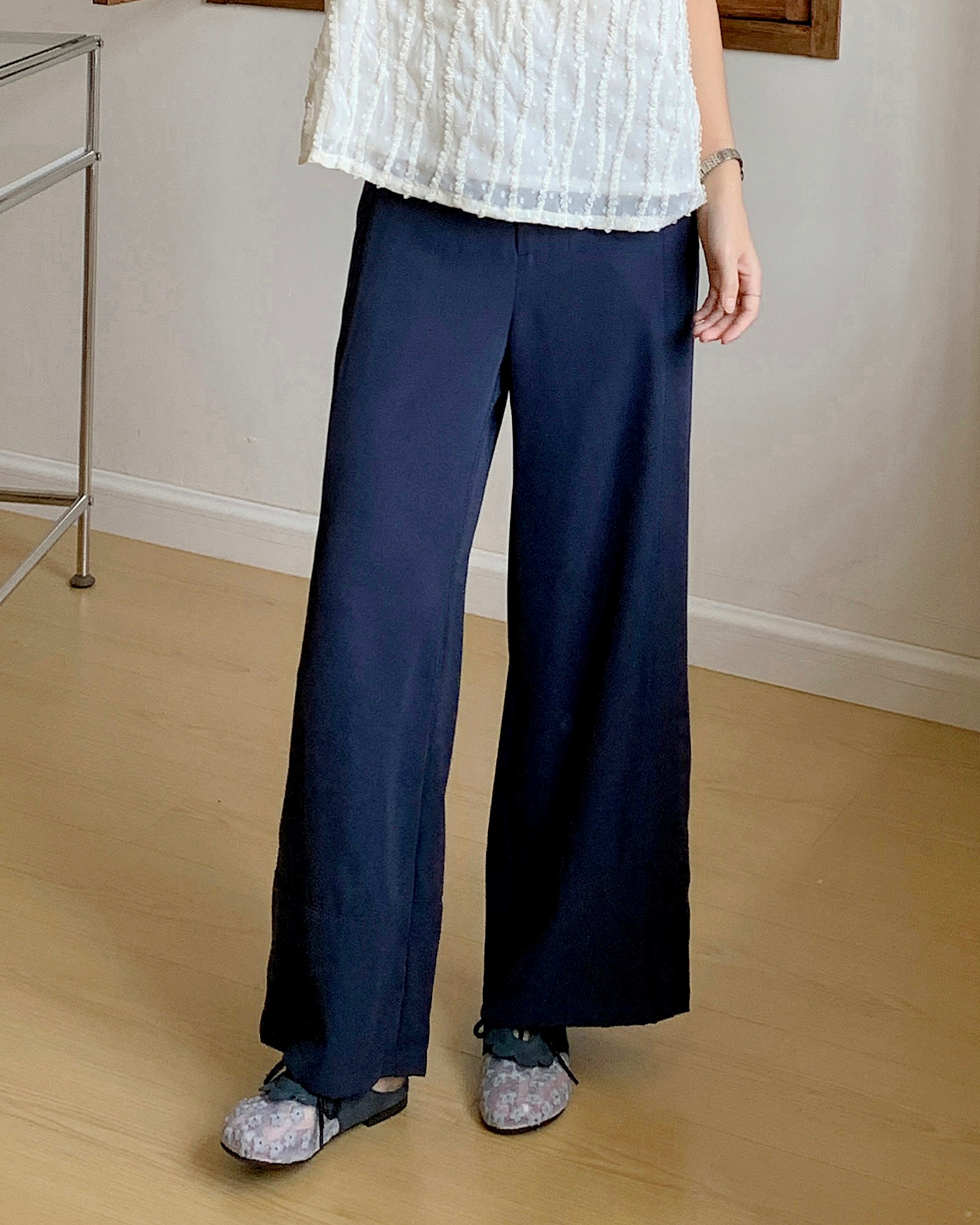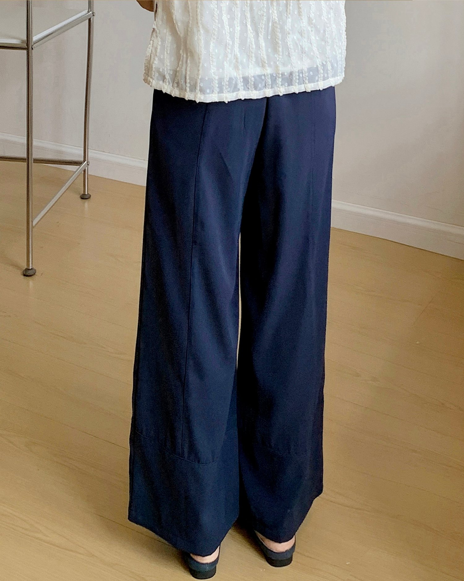 |車線寬腿西褲| 深藍色| 無彈|垂感| 後腰橡筋