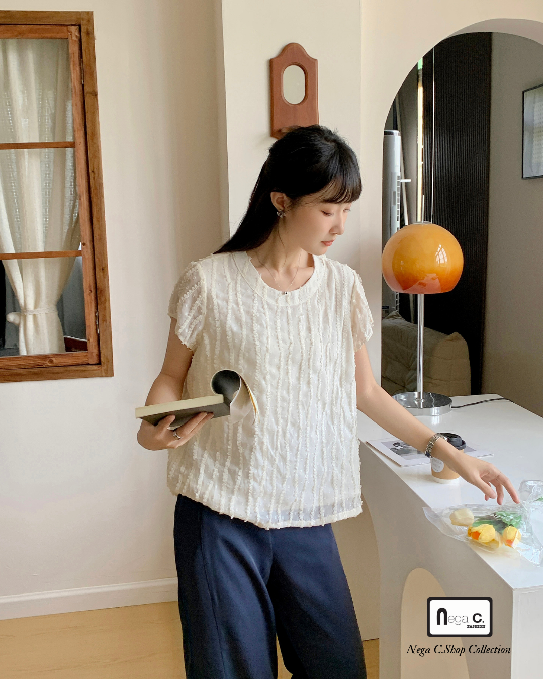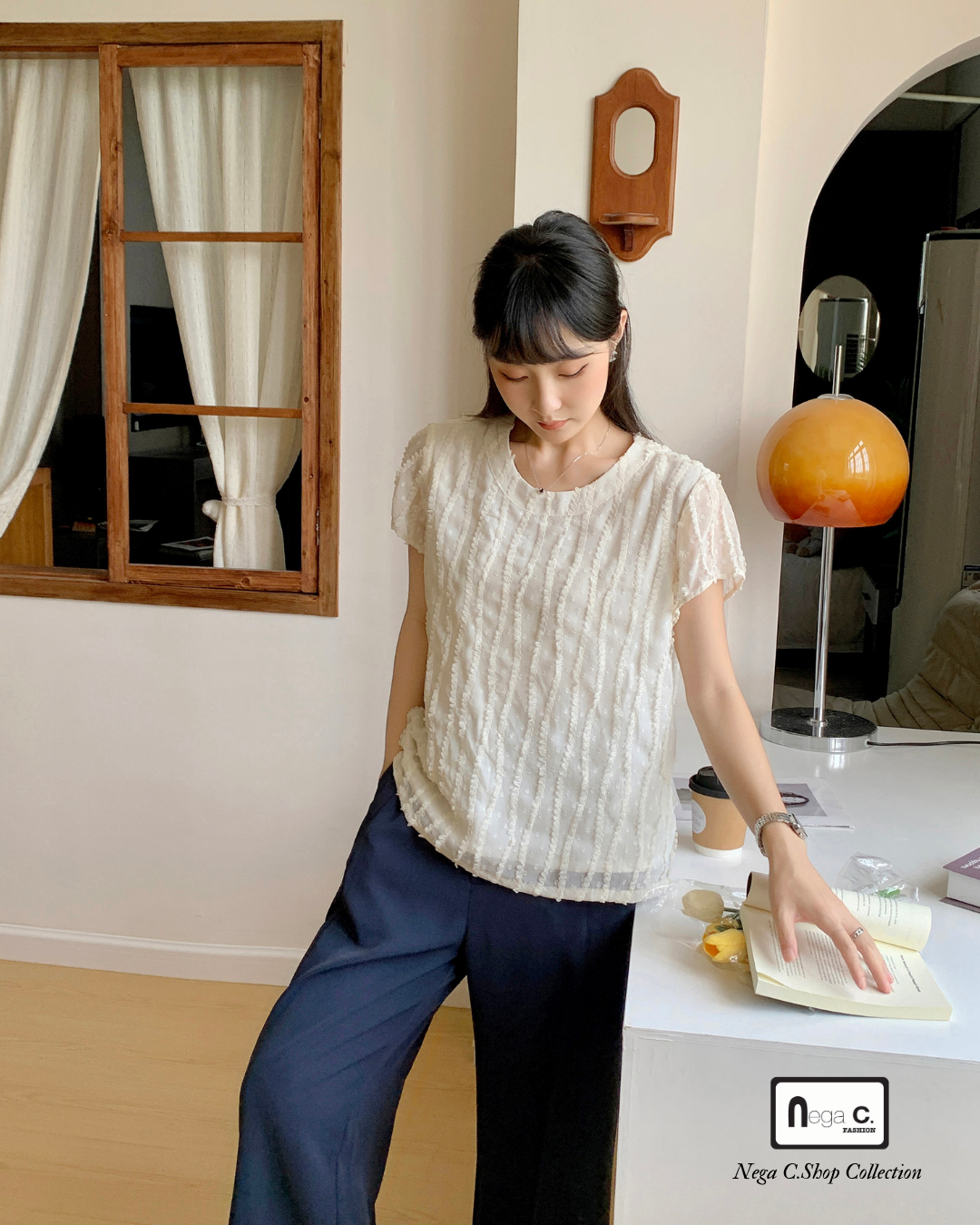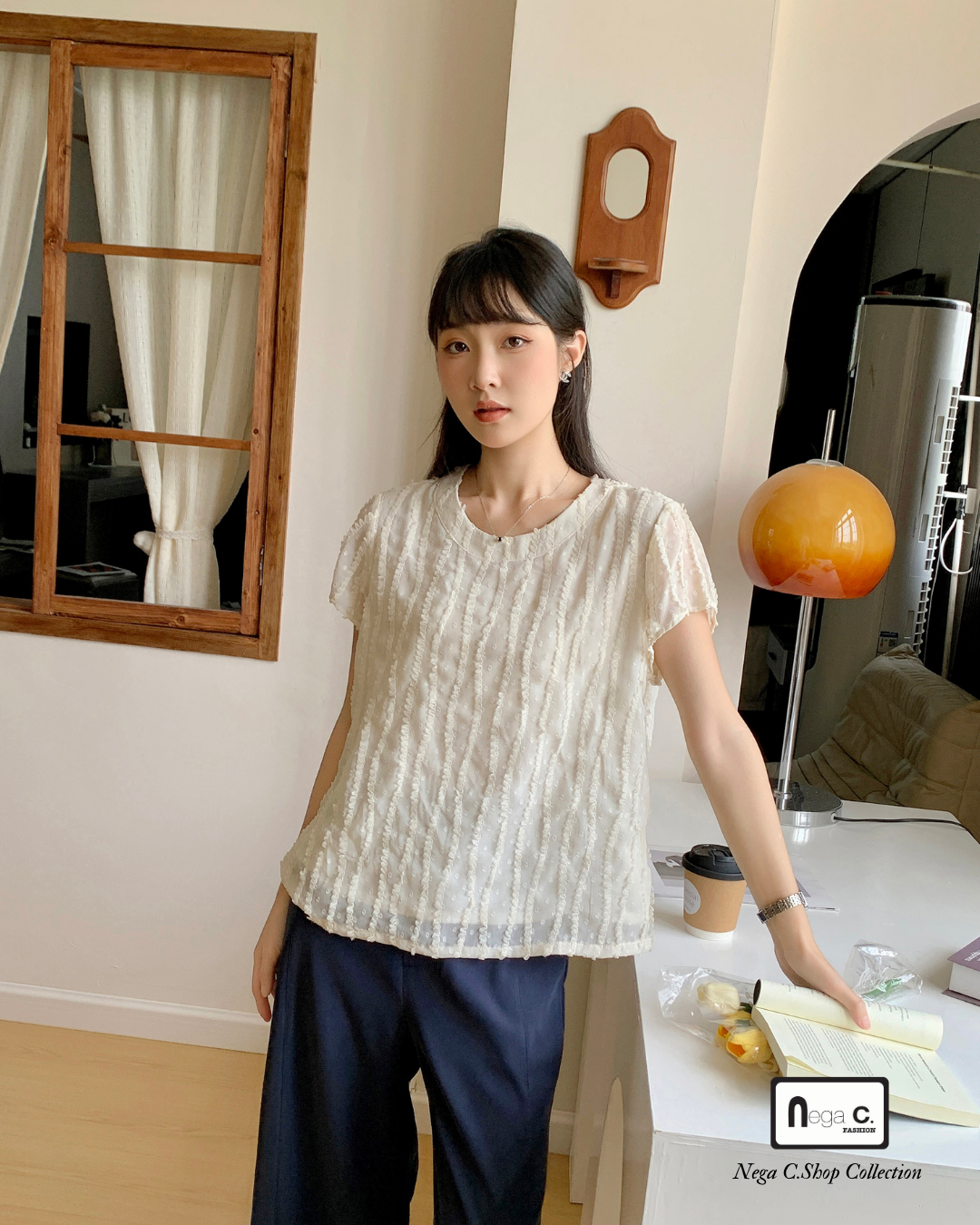 | 蕾絲暗紋壓摺上衣|米色|有裡襯|無彈|不透明
