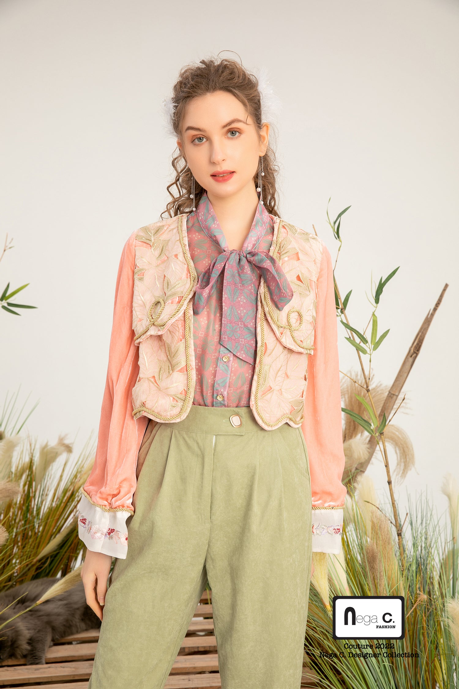顏色: 粉紅色/粉綠色, 面料: 100% 真絲 & 100% 聚酯纖維, 手工刺繡,電子印花
