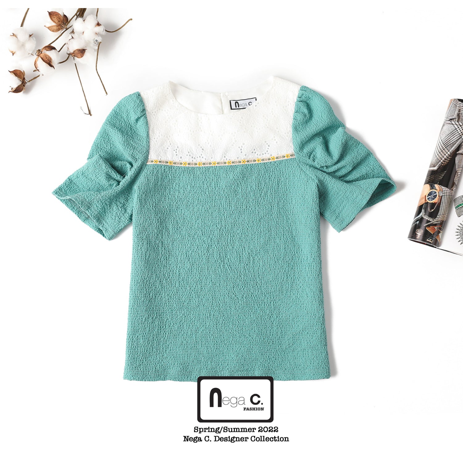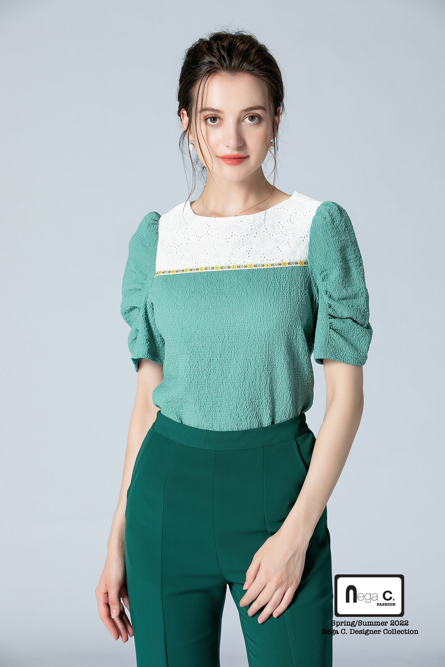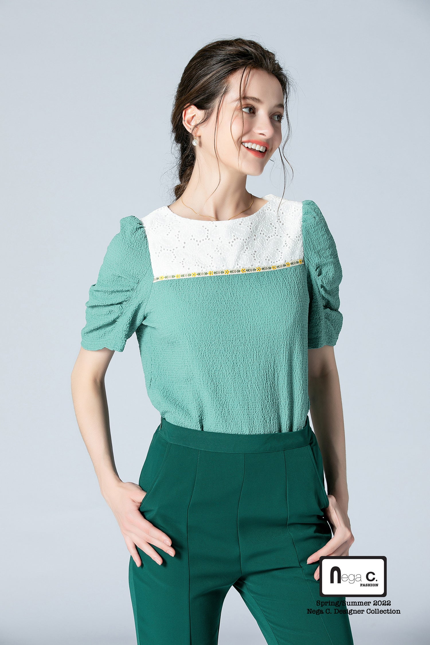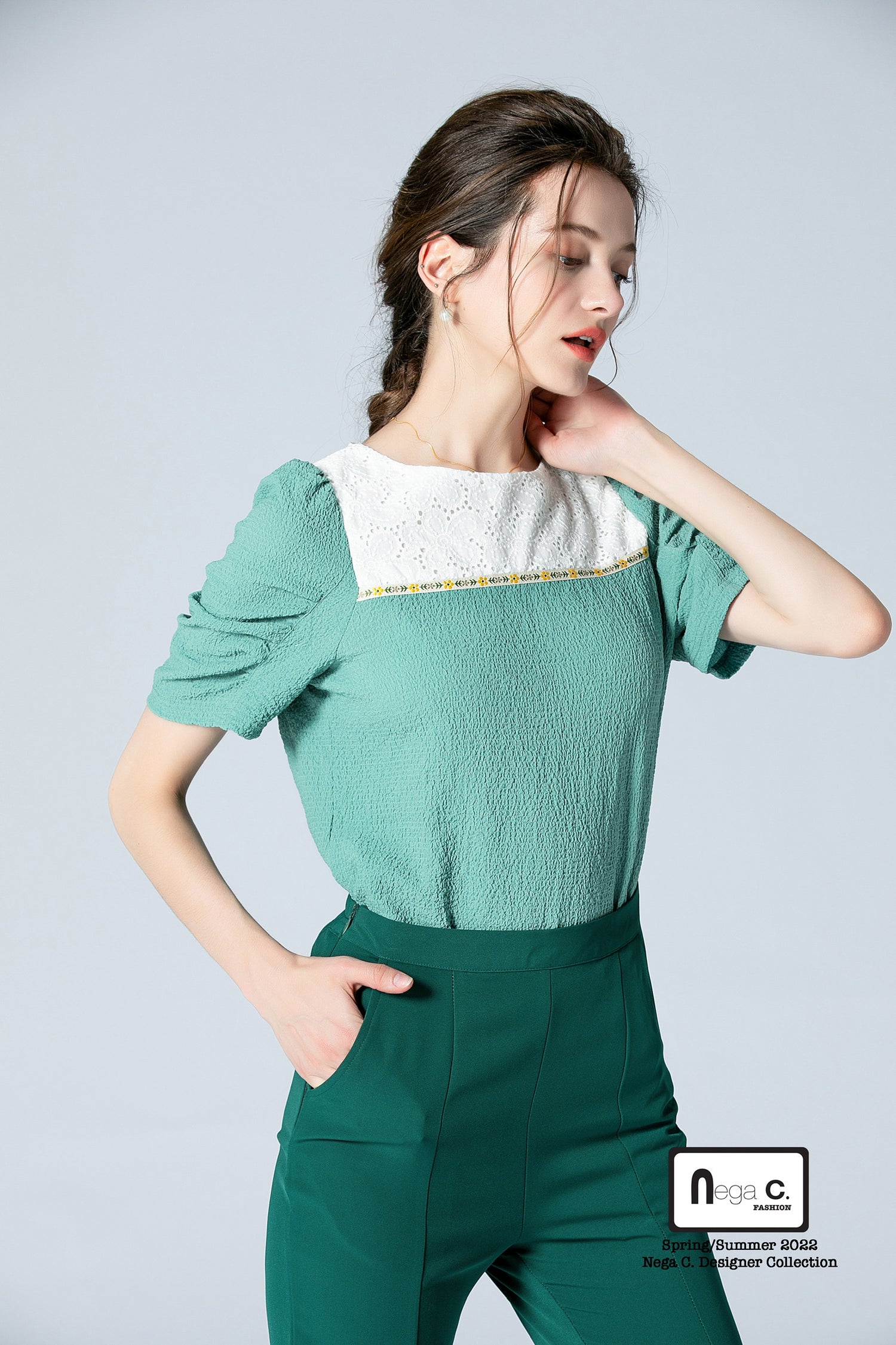 Nega C. 蕾絲拼布泡泡袖上衣|綠色|無裡襯