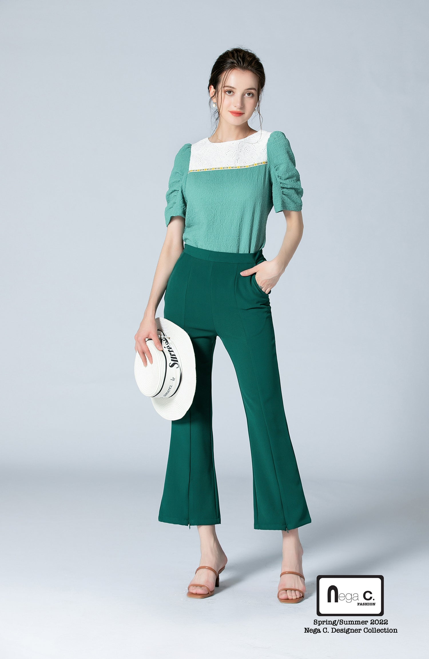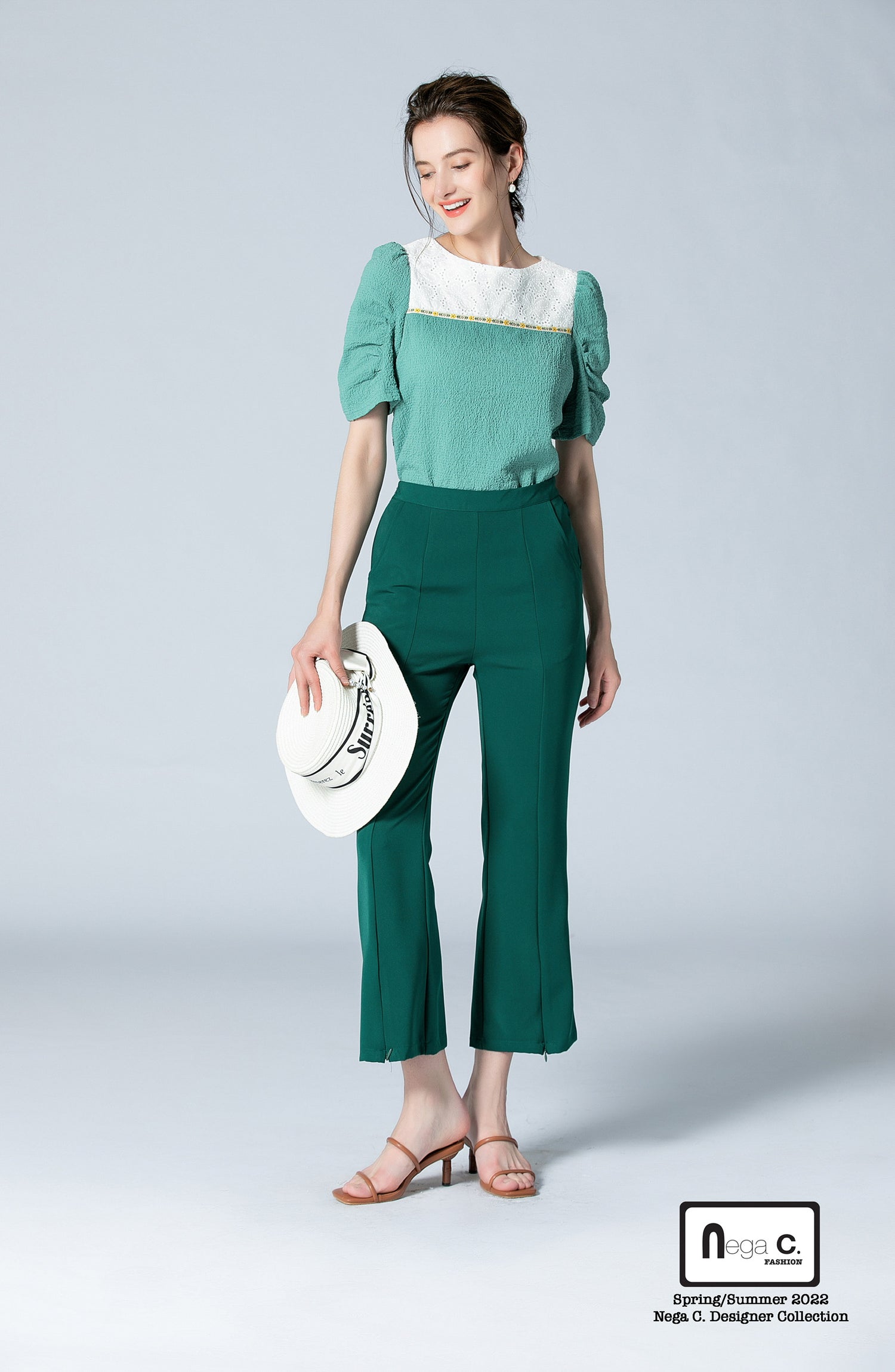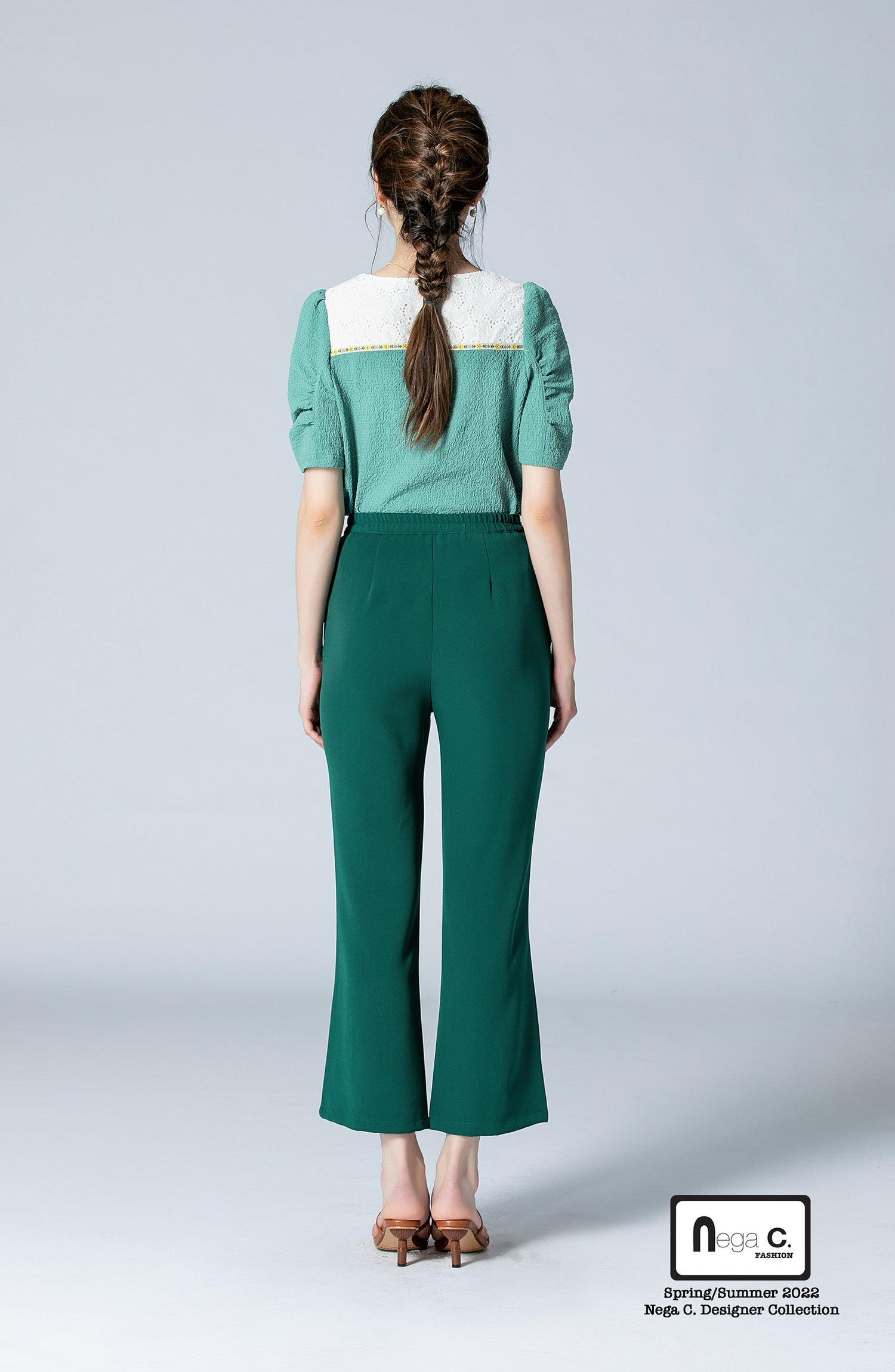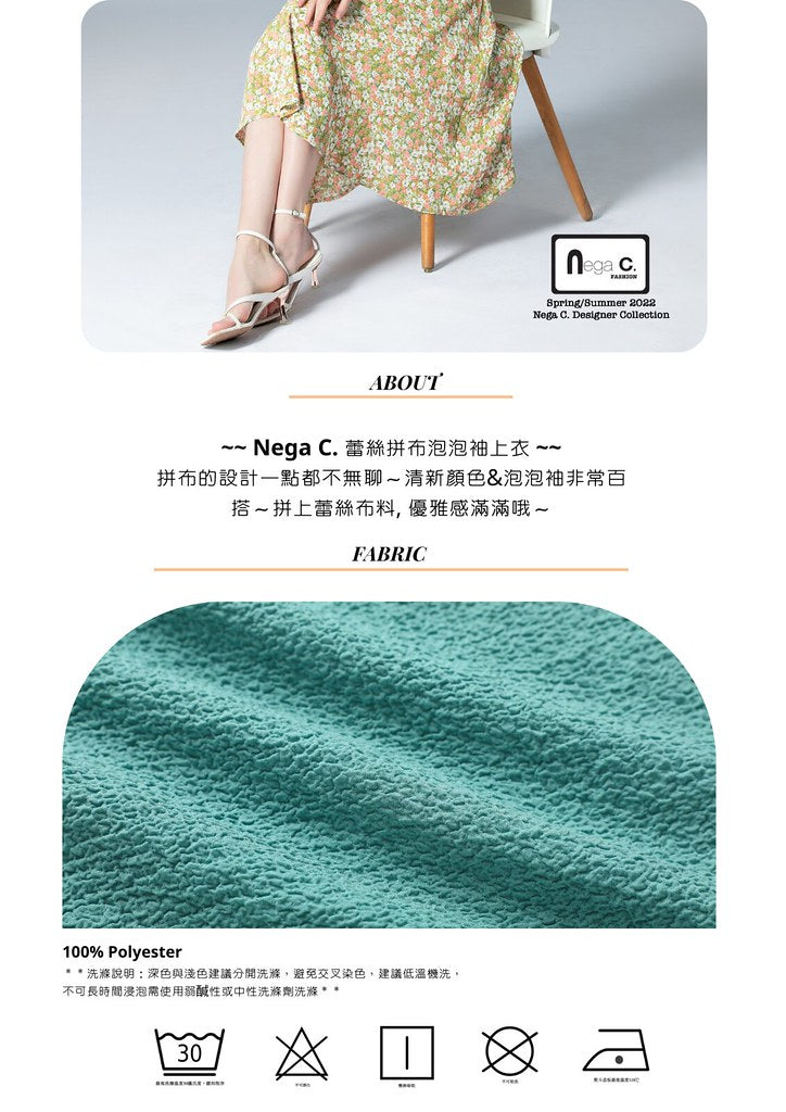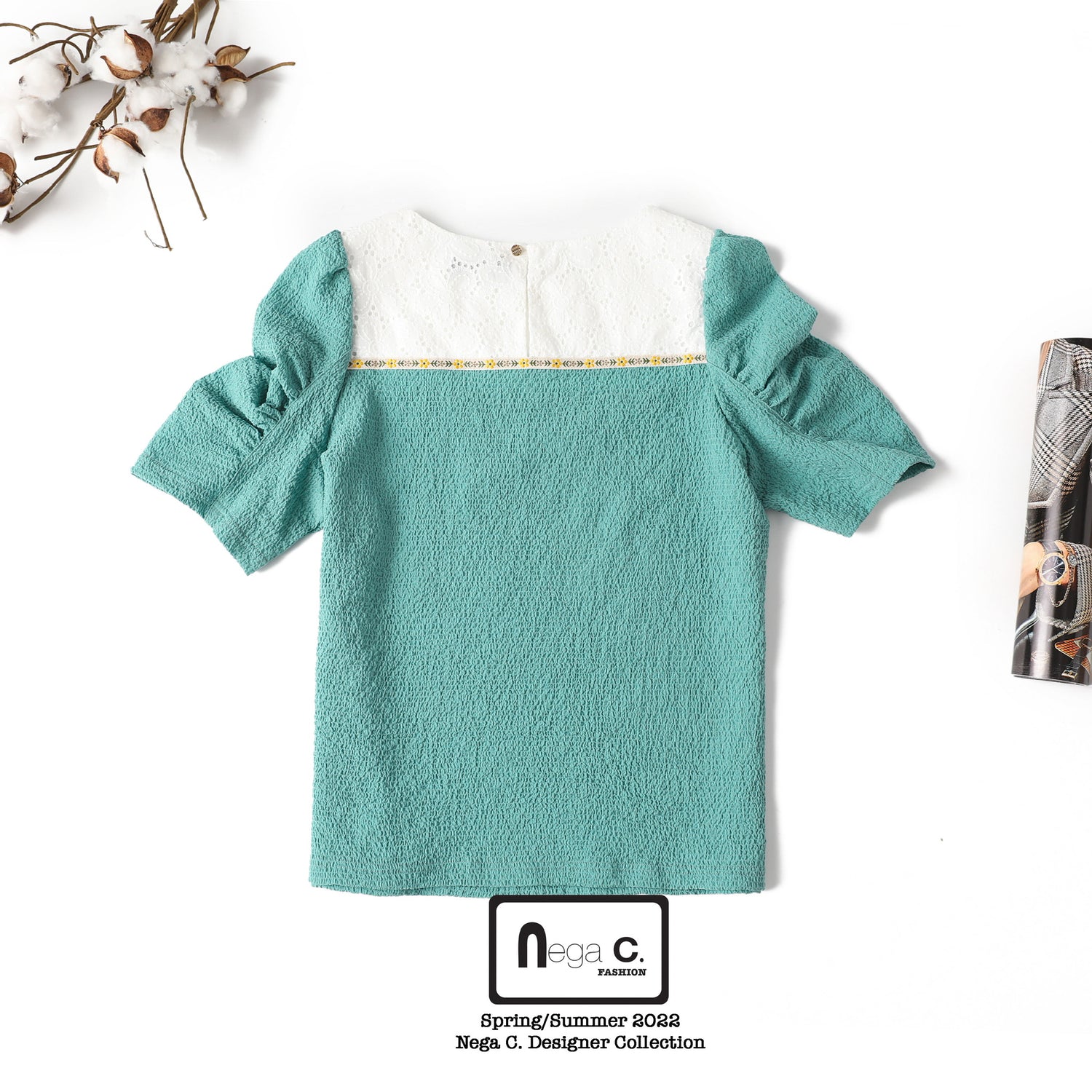Nega C. 蕾絲拼布泡泡袖上衣|綠色|無裡襯