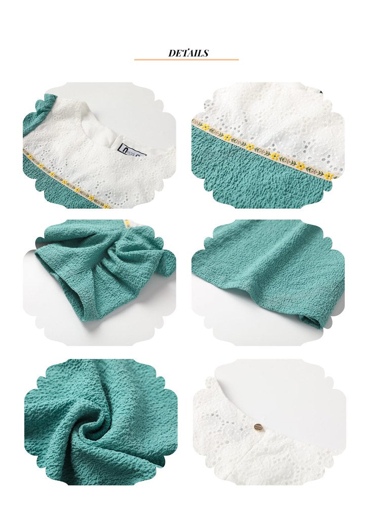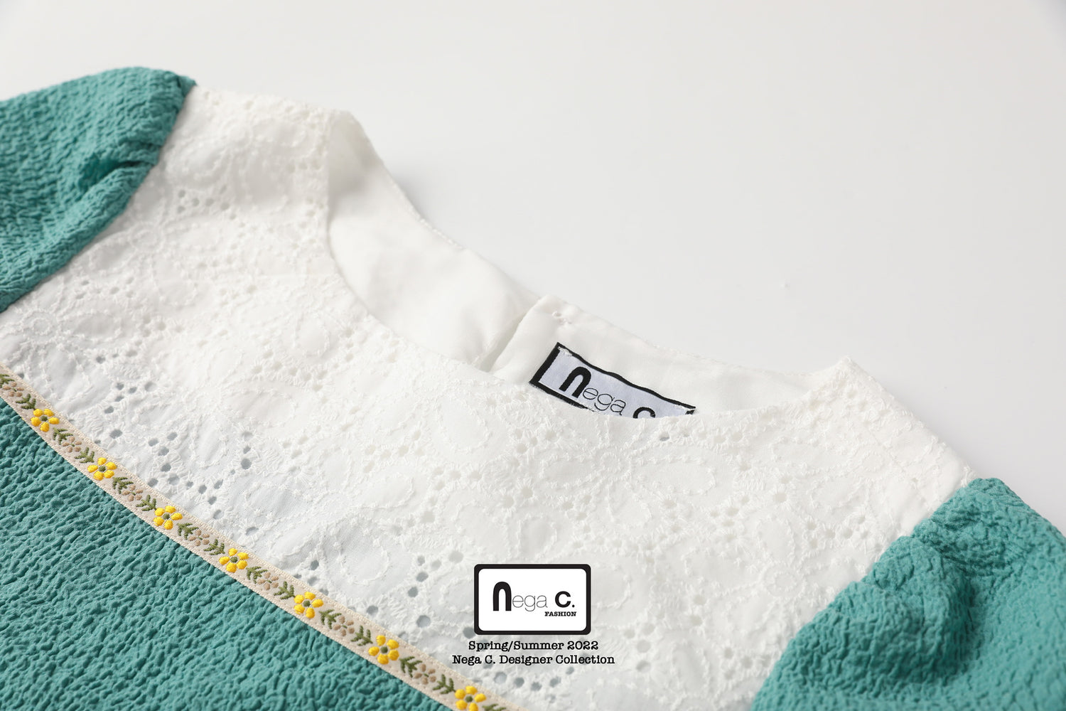 拼布的設計一點都不無聊~清新的綠色&泡泡袖非常百搭~拼上蕾絲布優雅感滿滿哦~