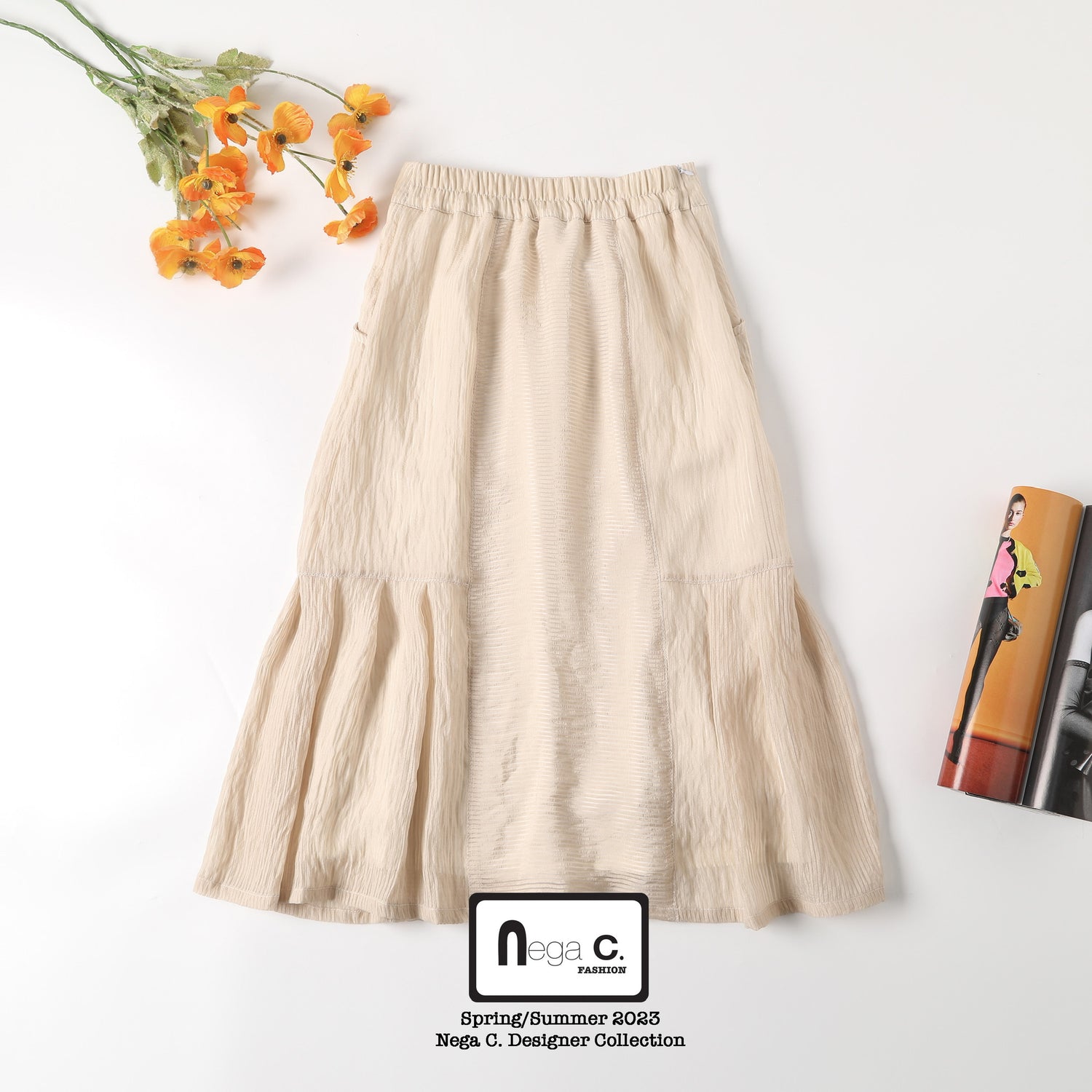+Nega C. 優雅壓褶腳中長半截裙|米色|無彈|有裡襯+