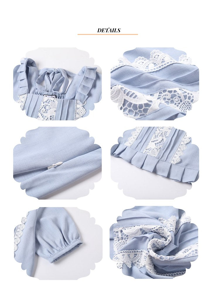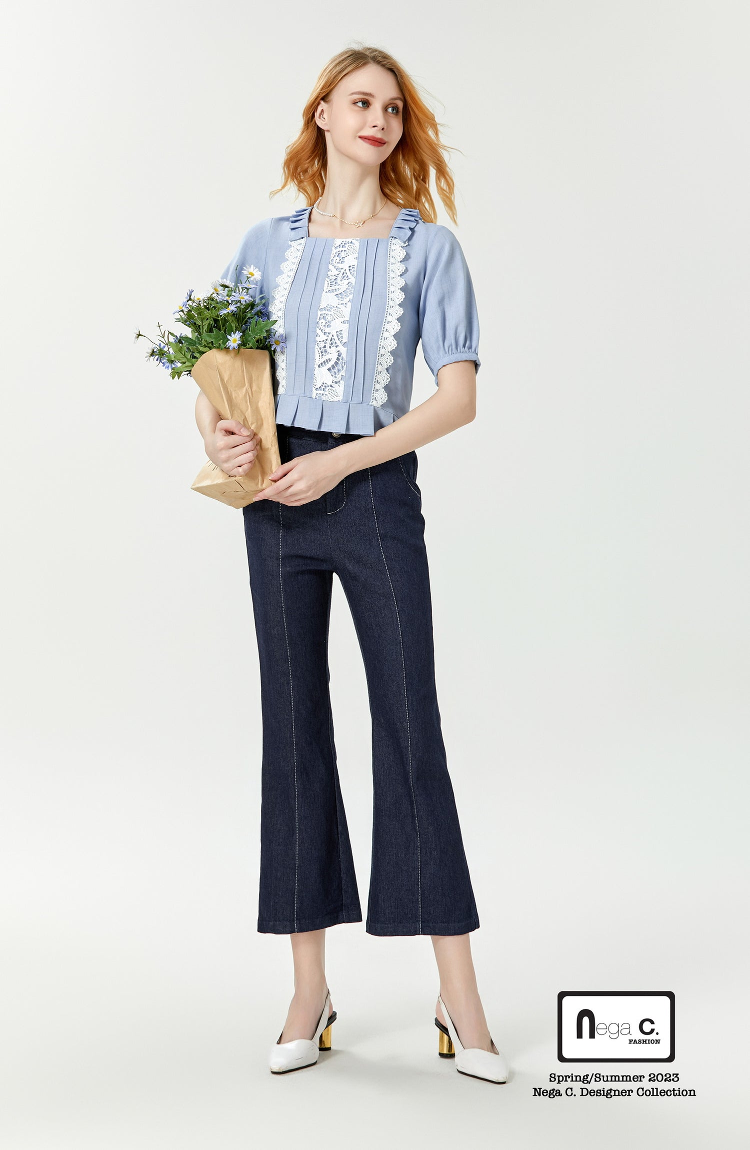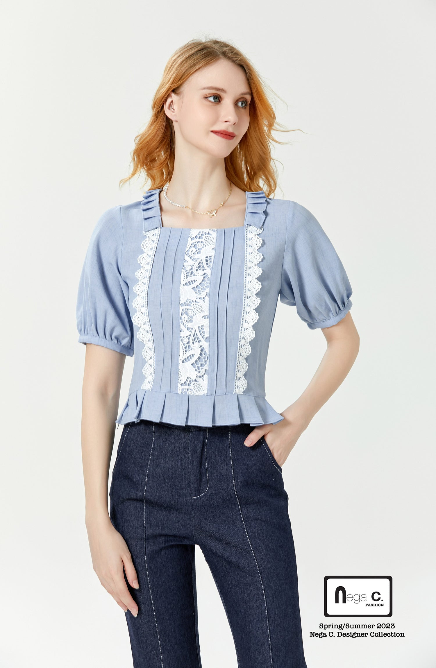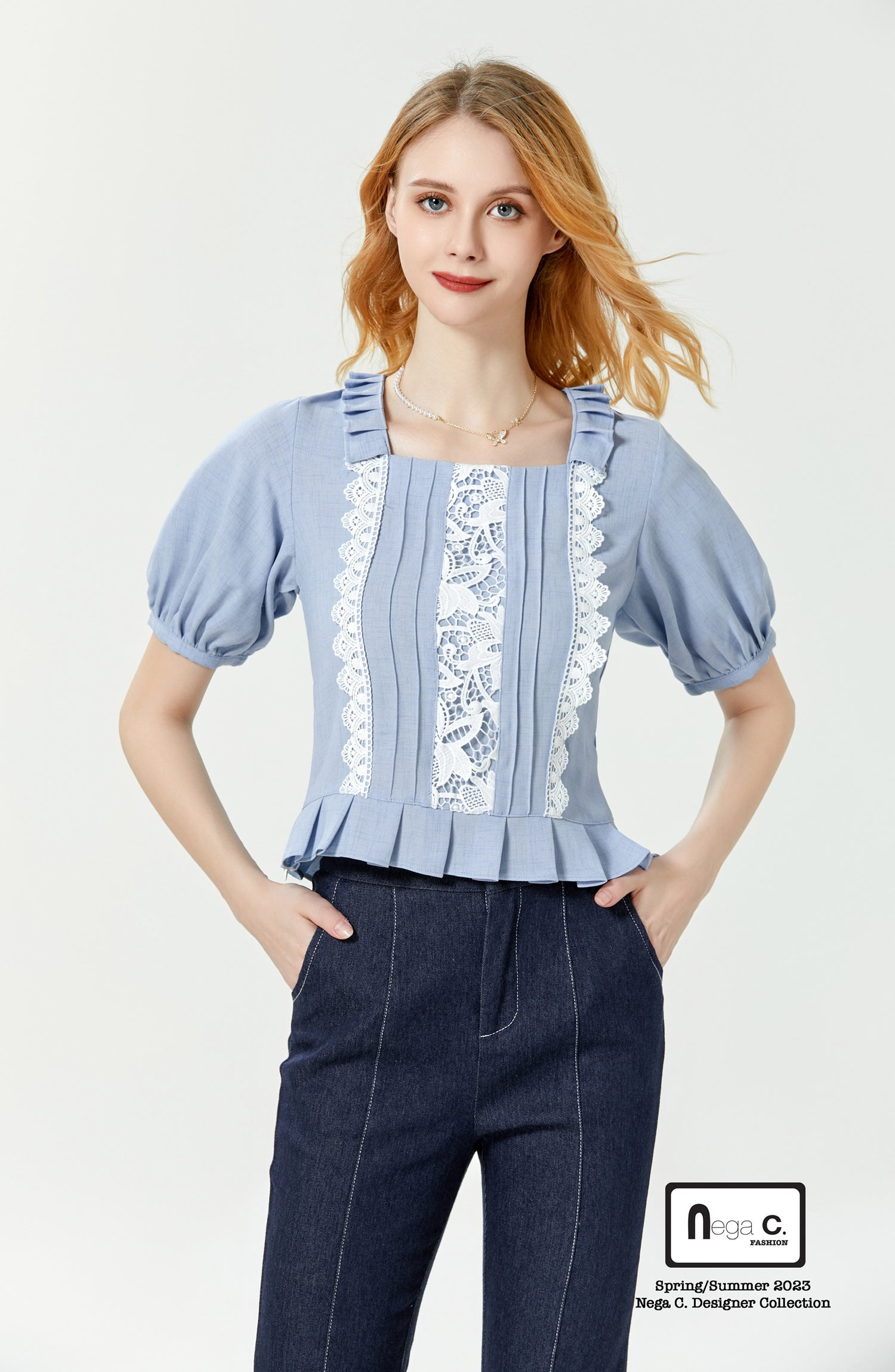 +Nega C. 可愛方領蕾絲壓摺衫腳上衣| 淺藍色| 有裡襯+