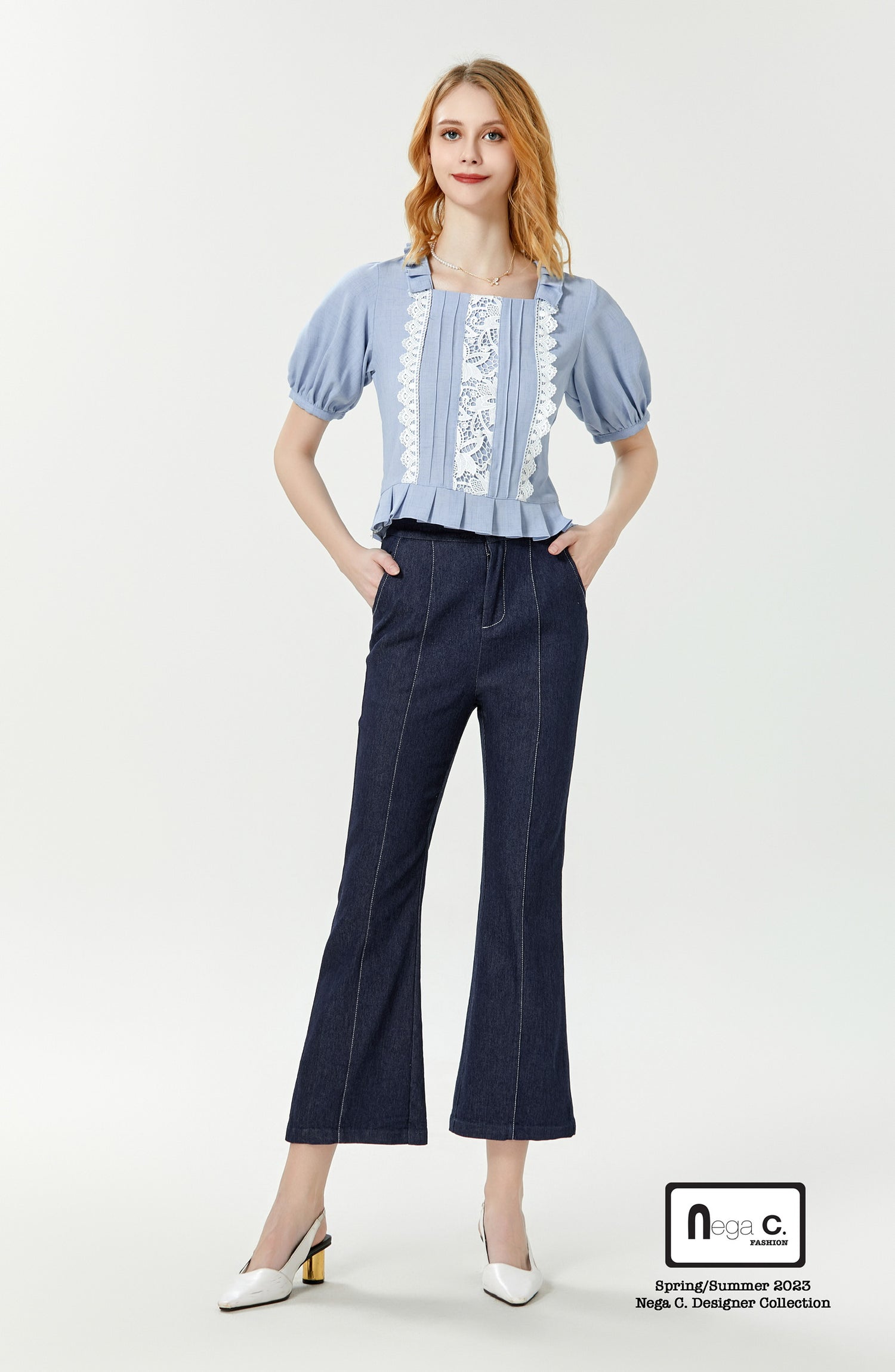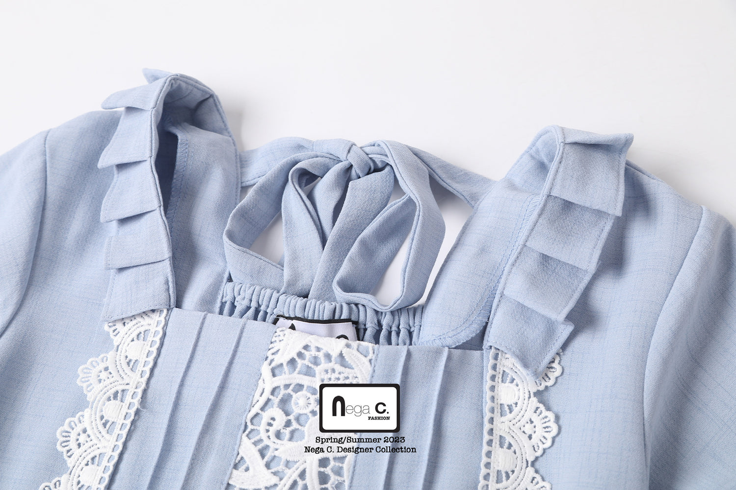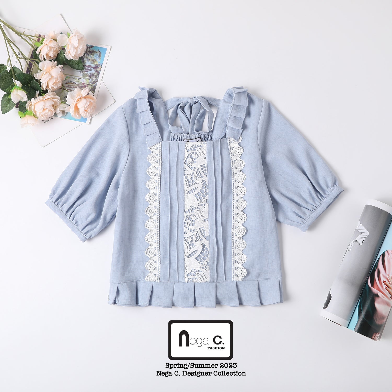 Nega C. 可愛方領蕾絲壓摺衫腳上衣| 淺藍色| 有裡襯