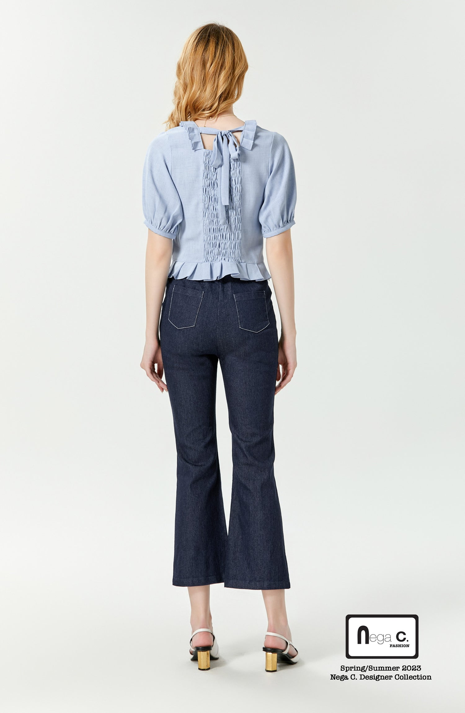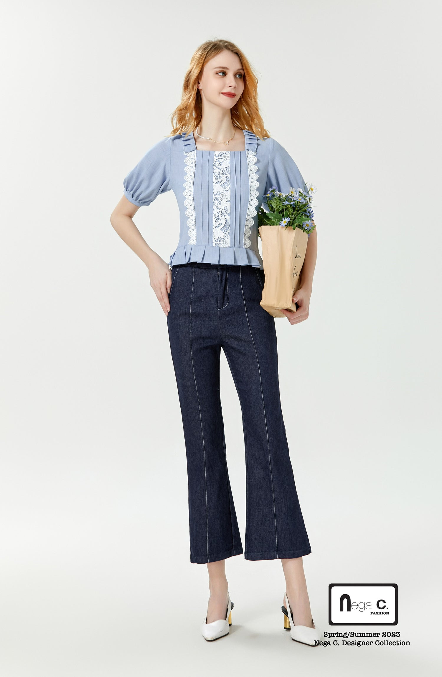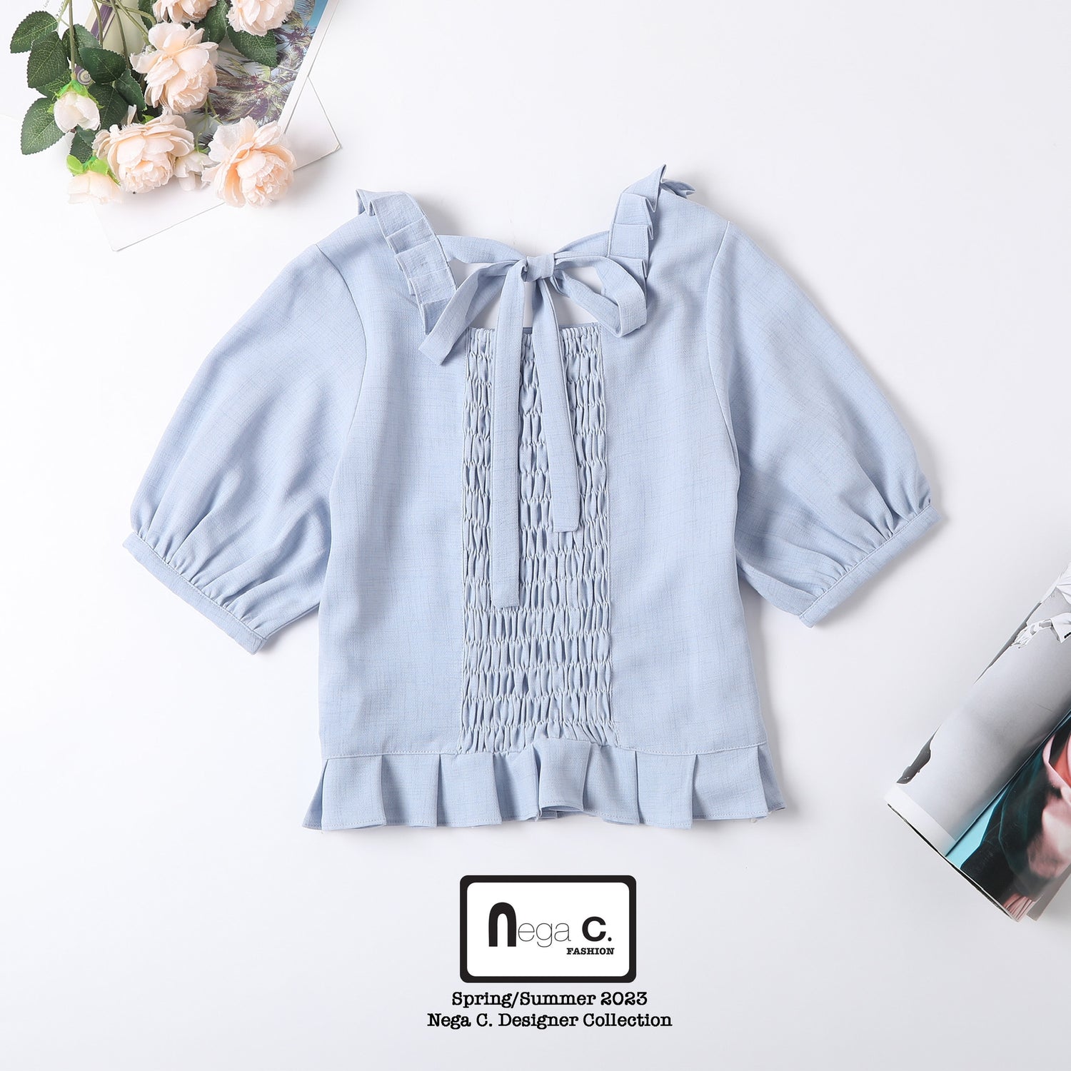 Nega C. 可愛方領蕾絲壓摺衫腳上衣| 淺藍色| 有裡襯