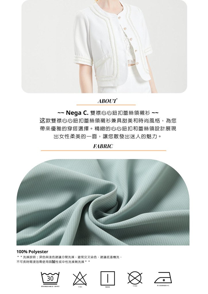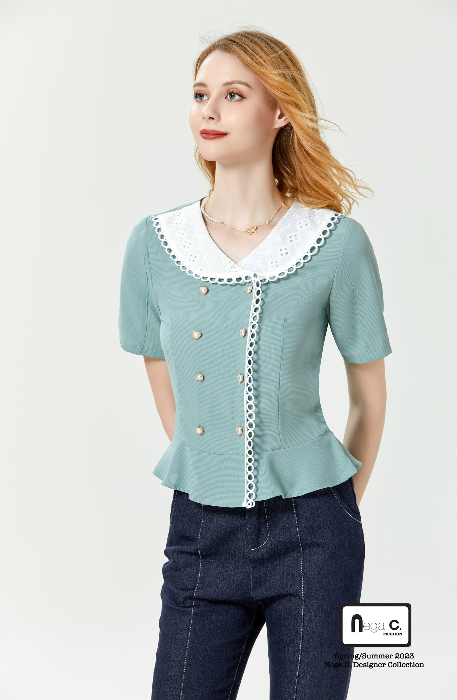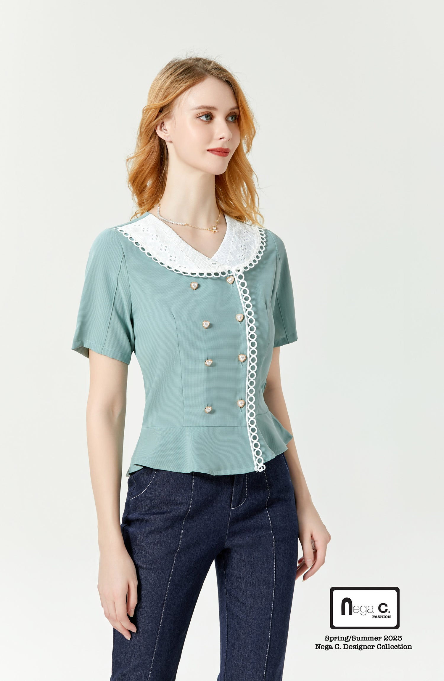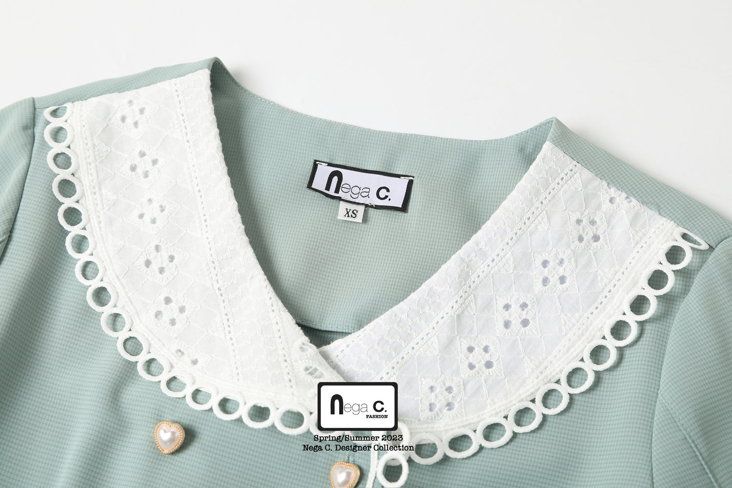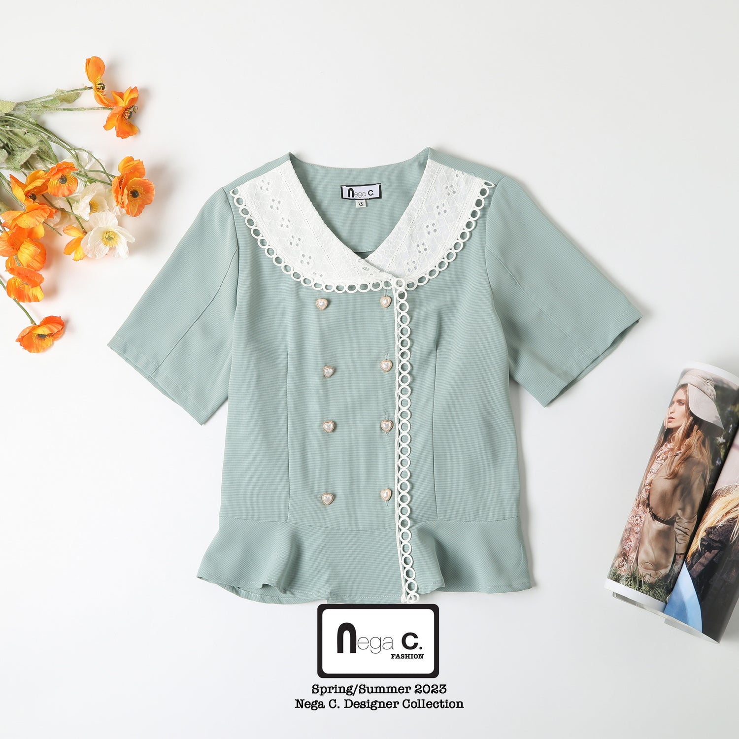 Nega C. 雙襟心心鈕扣蕾絲領襯衫| 淺綠色| 有裡襯