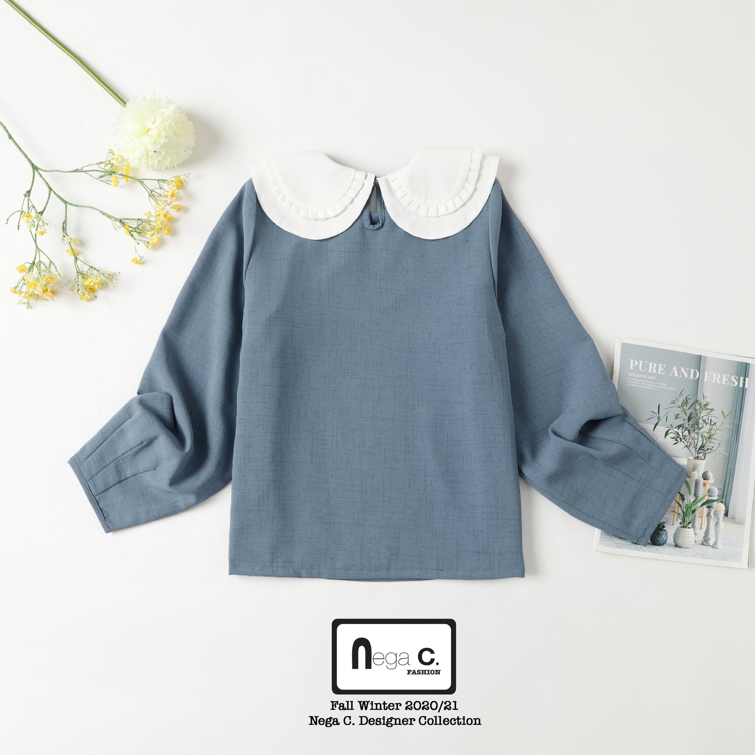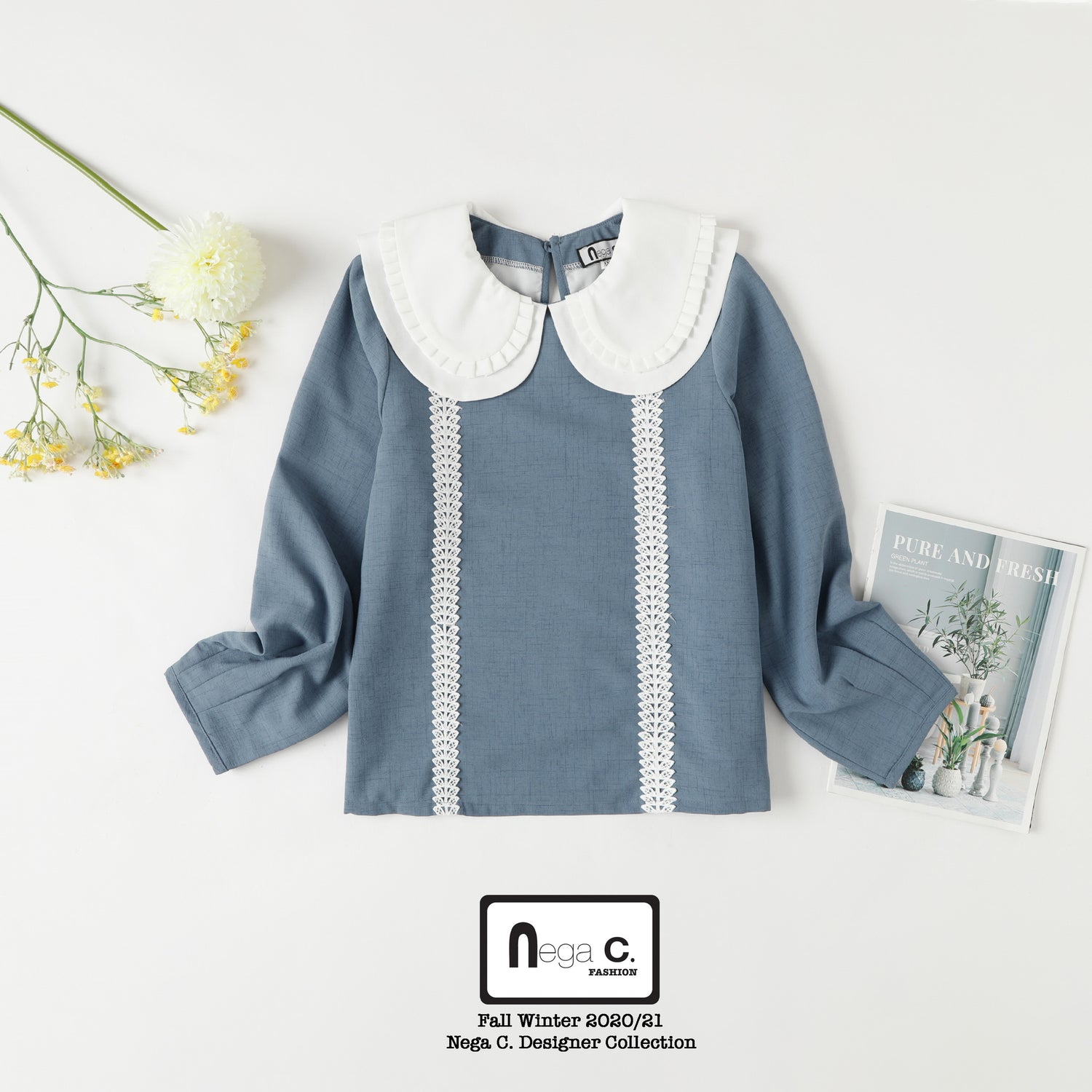 Nega C. เสื้อเชิ้ตลูกไม้คอกลมจับจีบบางสองชั้น |สีฟ้า|ซับในแบบเรียบเรียง|