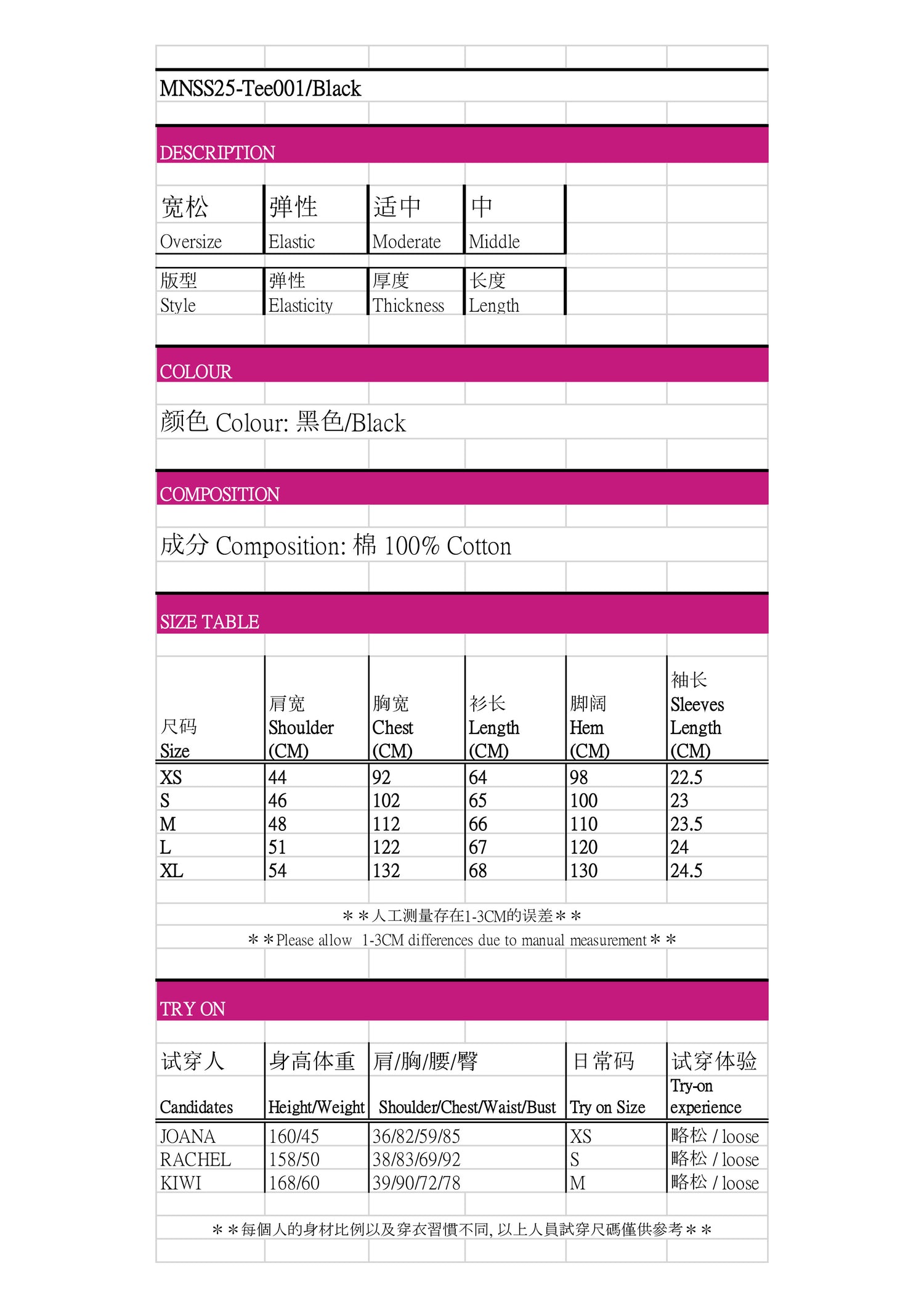 2. 产品为宽松版型,请务必留意尺码。