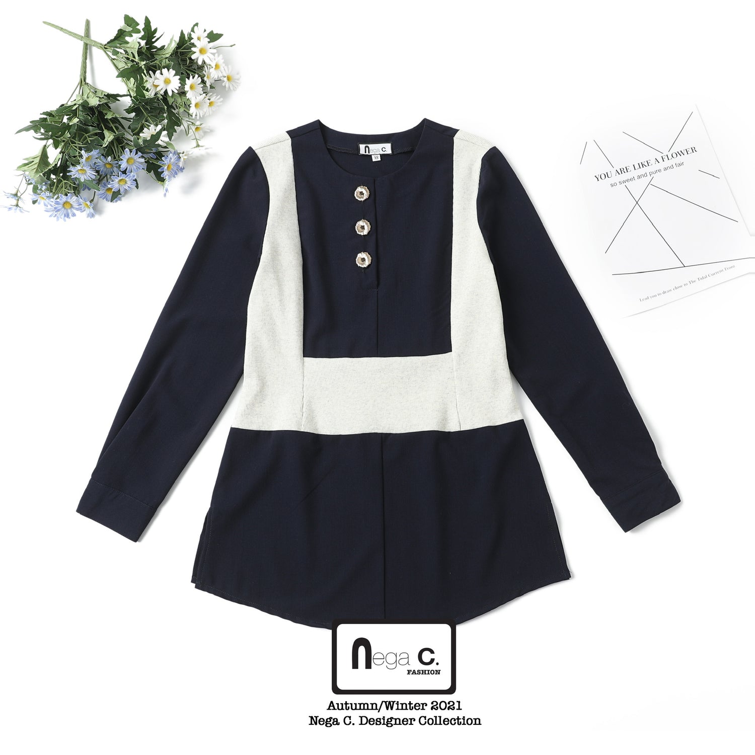 + Nega C. เสื้อคอกลมผ่ากลาง | สีน้ำเงินเข้ม | ยืดเล็กน้อย | Unlined+