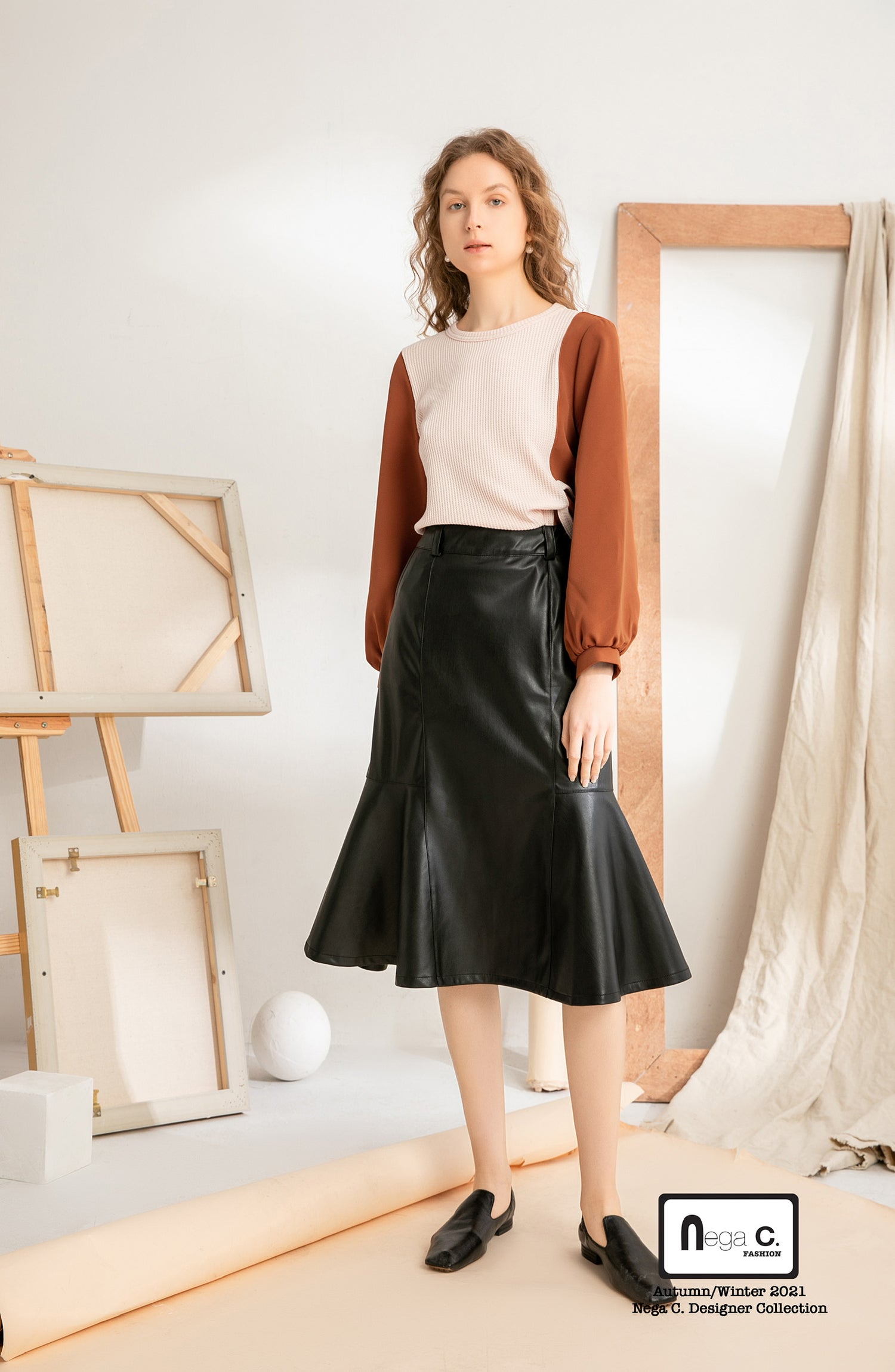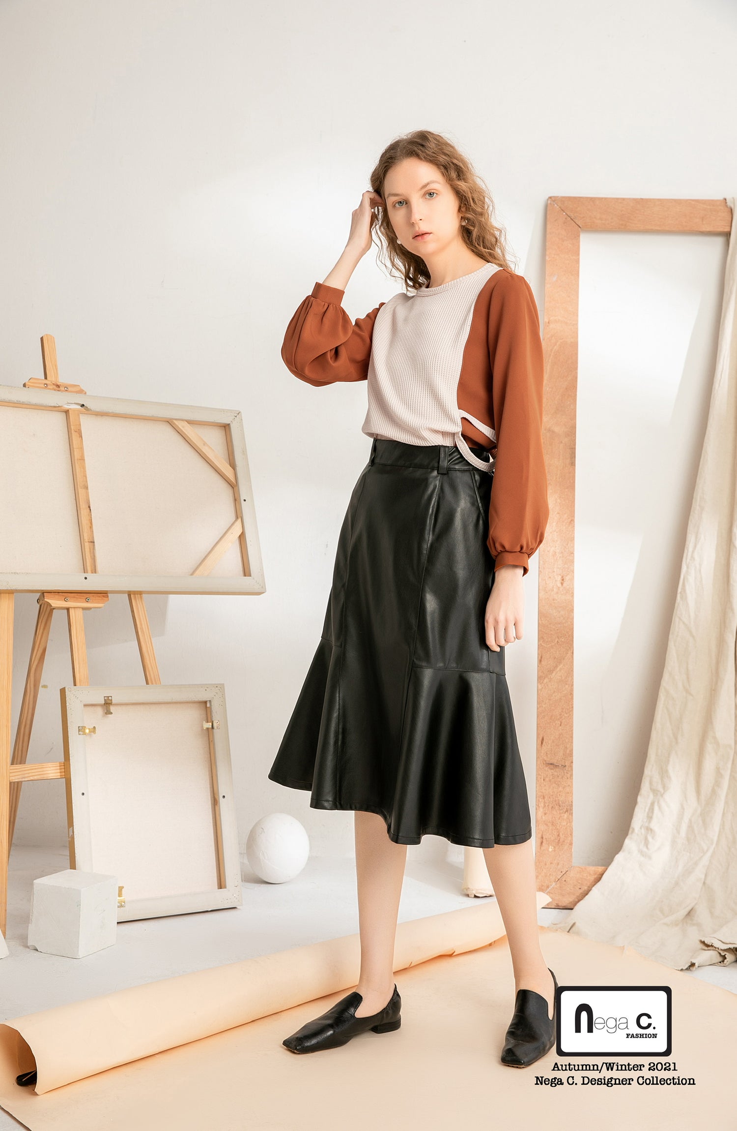 +Nega C. เสื้อพัฟเย็บปะติดปะต่อคอกลม |สีน้ำตาล|ยืดเล็กน้อย|ไม่มีซับใน+