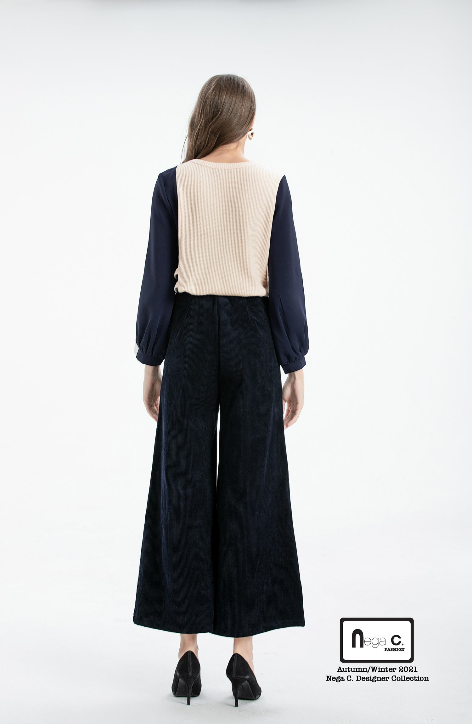 +Nega C. เสื้อพัฟเย็บปะติดปะต่อคอกลม | สีน้ำเงินเข้ม | ยืดเล็กน้อย | ไม่มีซับใน+