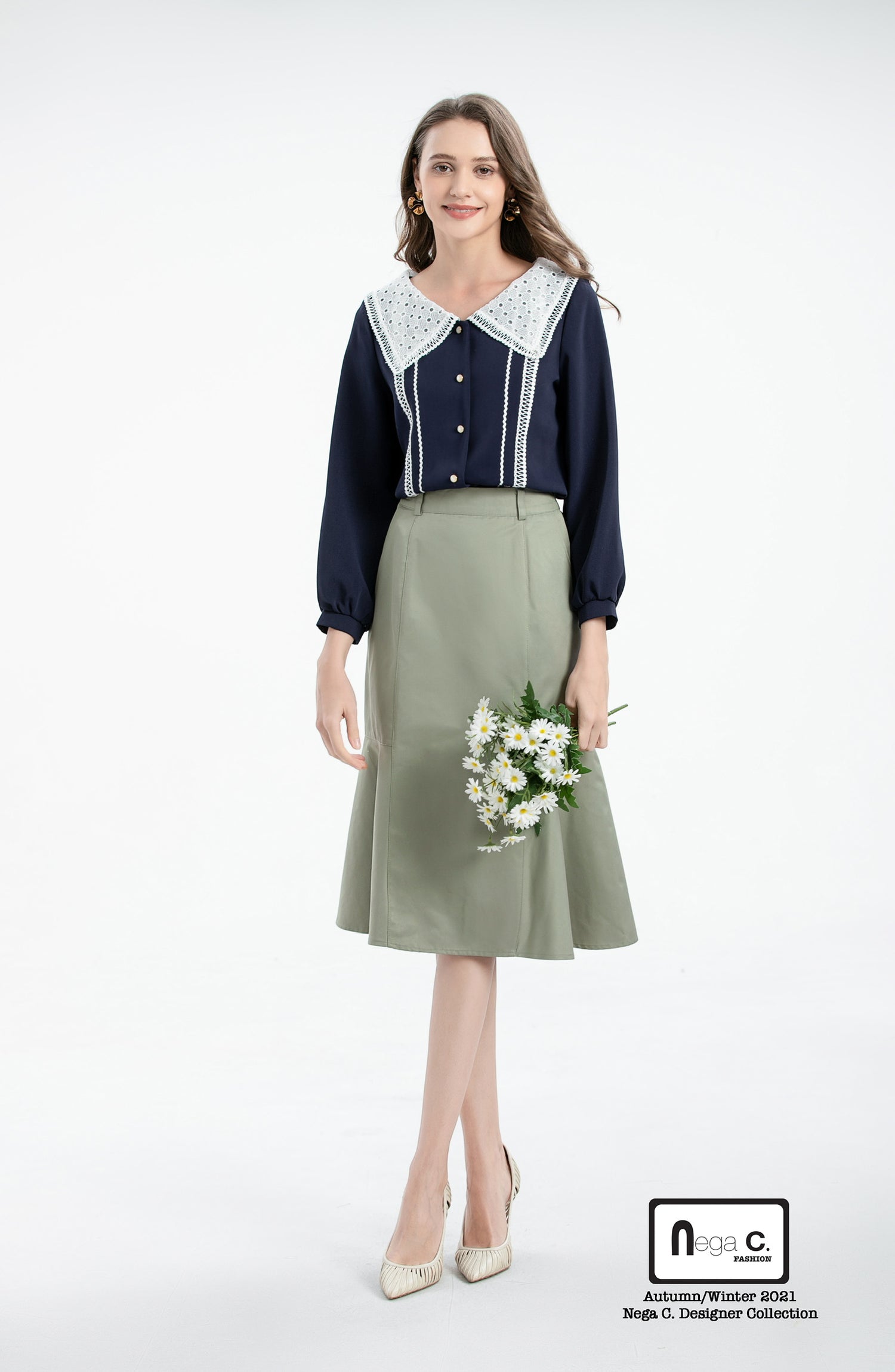 Nega C. เสื้อเชิ้ตคอปกใหญ่ลูกไม้|สีน้ำเงินเข้ม|ไม่ยางยืด