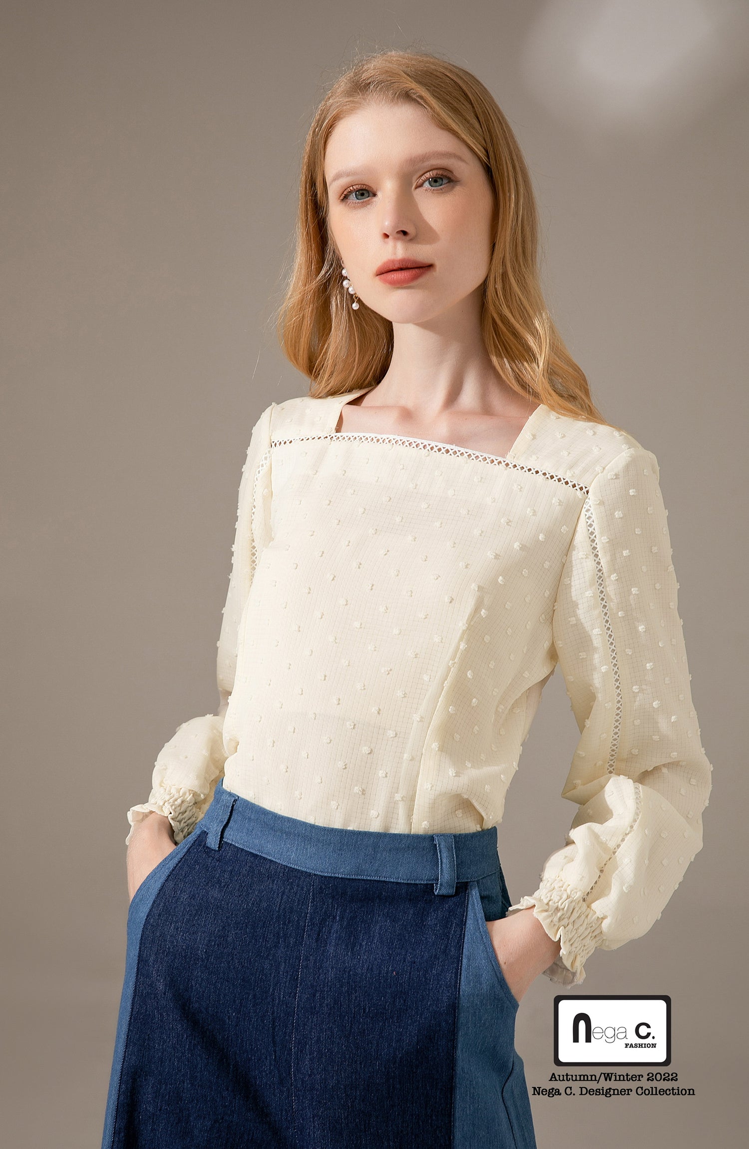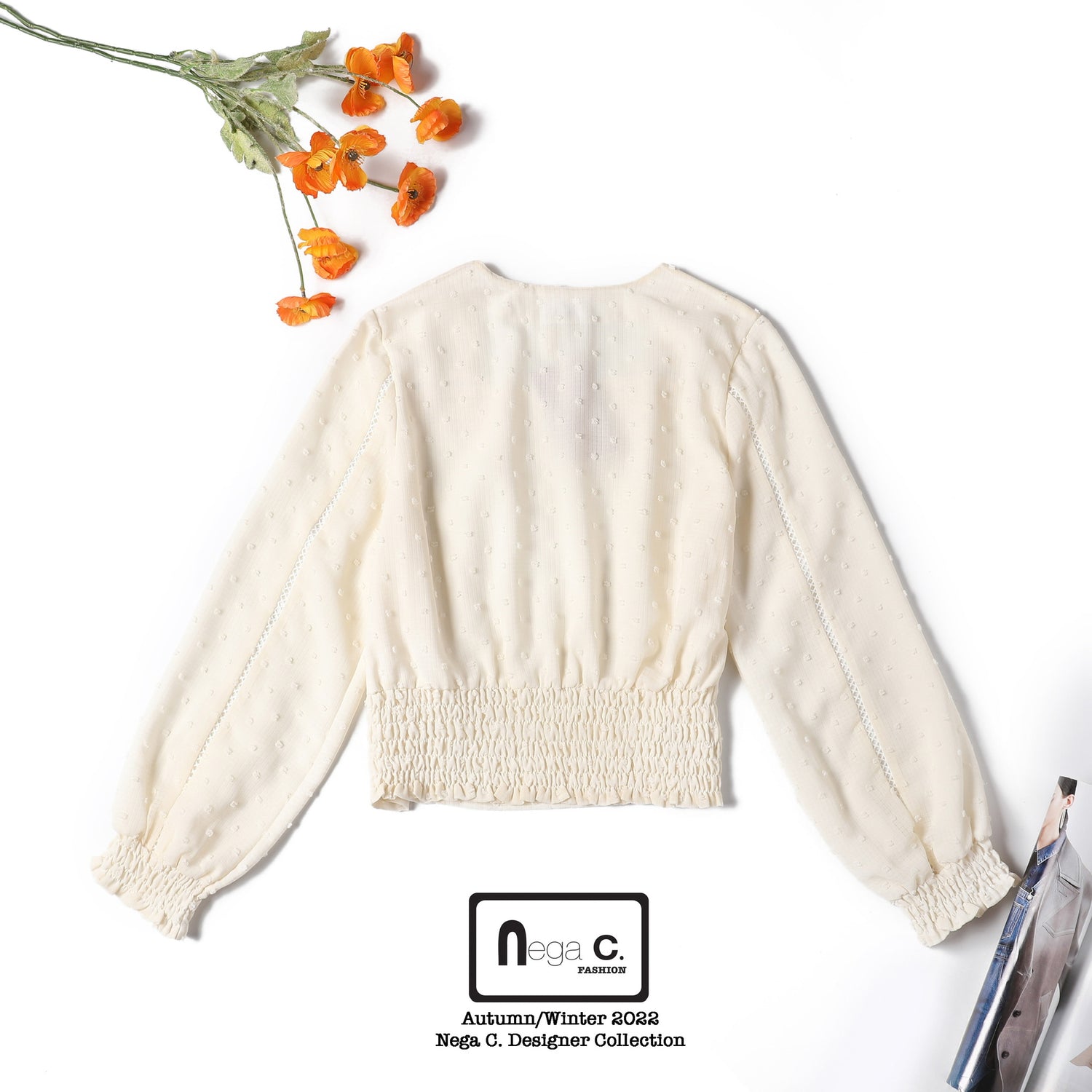 + Nega C. เสื้อลูกไม้คอเหลี่ยมลายจุด|สีแอปริคอท|ผ้าไม่ยืด|มีซับใน+
