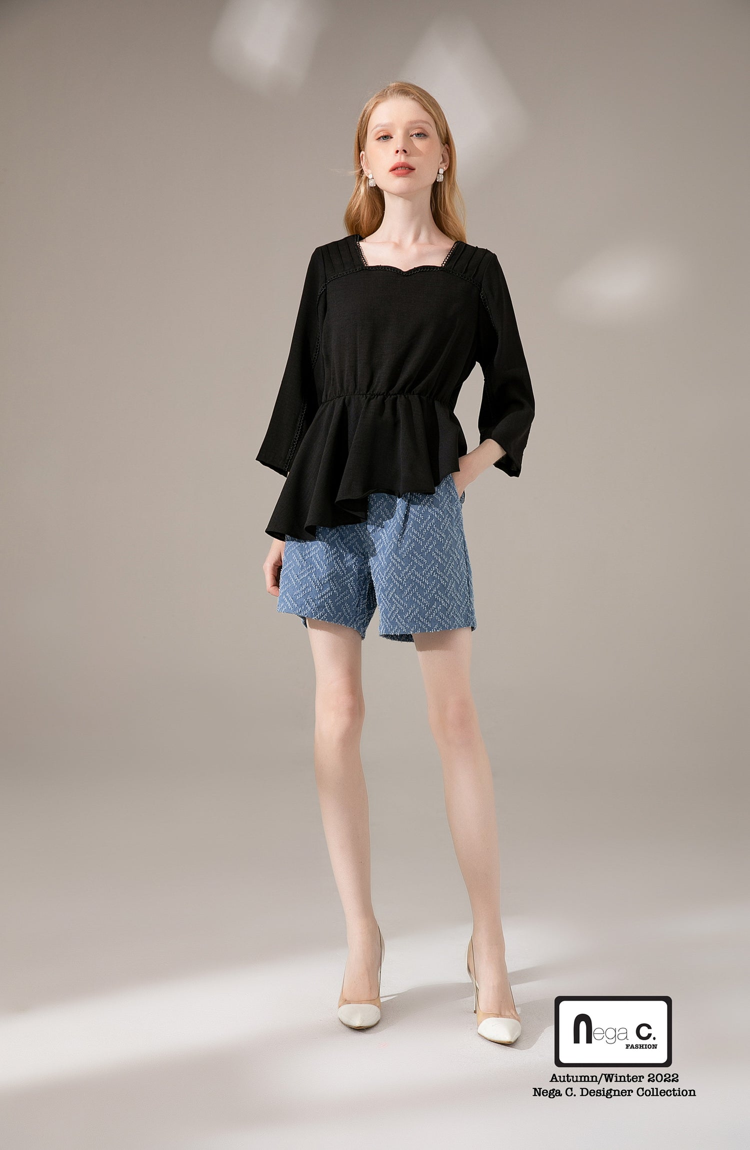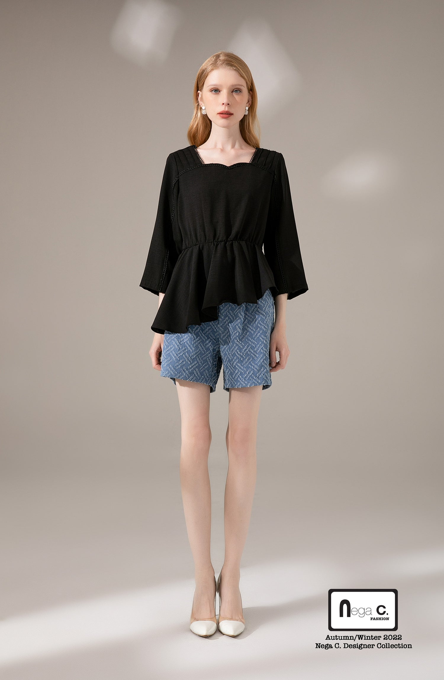 Nega C. เสื้อทูนิคระบายไม่สมมาตรคอ Sweetheart | สีดำ | ไม่ยืด | ไม่มีซับใน