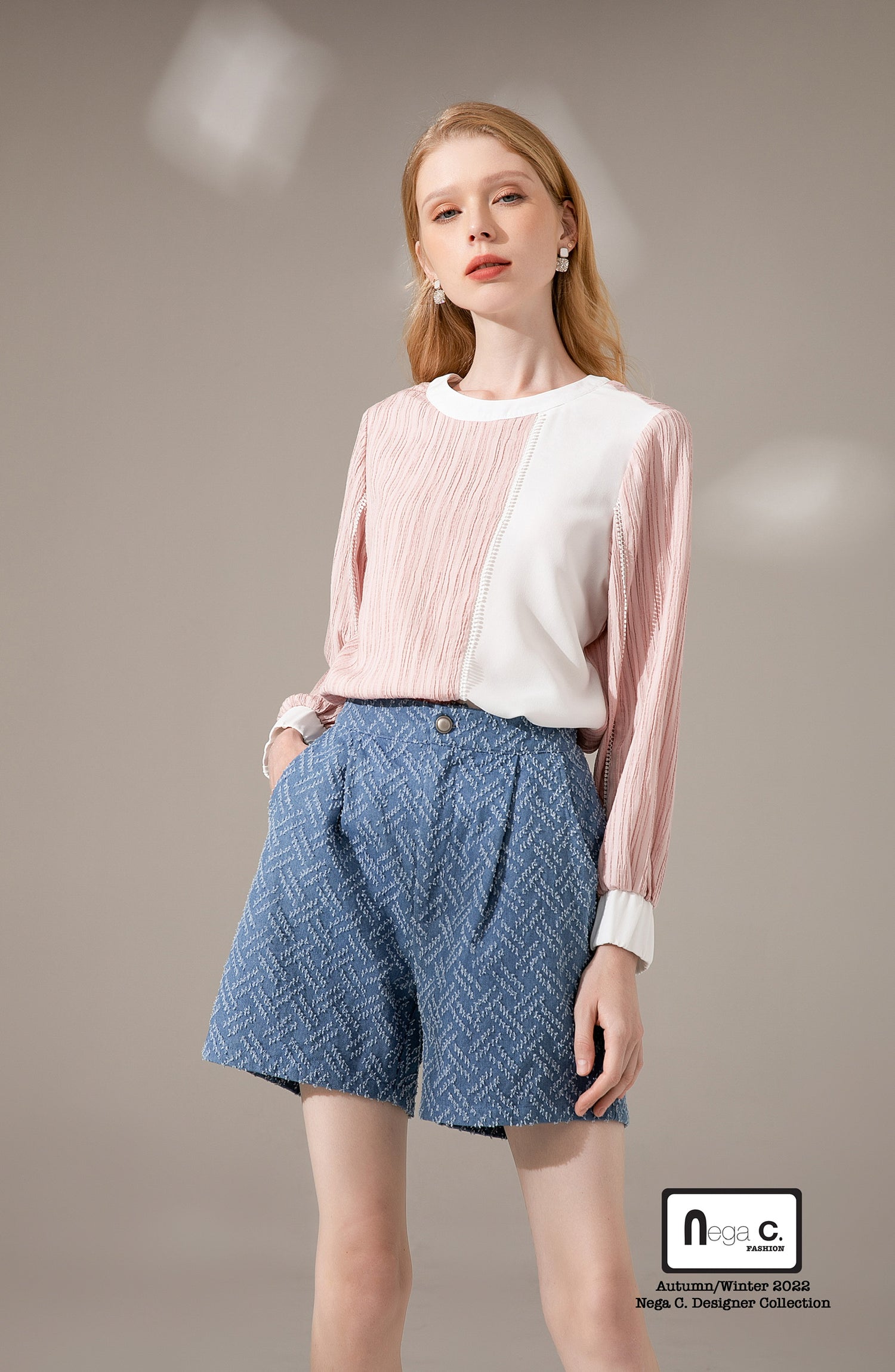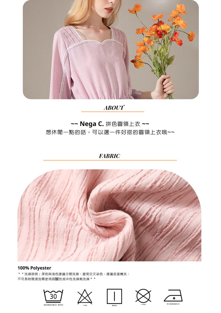 + Nega C. เสื้อคอกลมบล็อคสี|ชมพู|ยืดเล็กน้อย|ไม่มีซับใน+