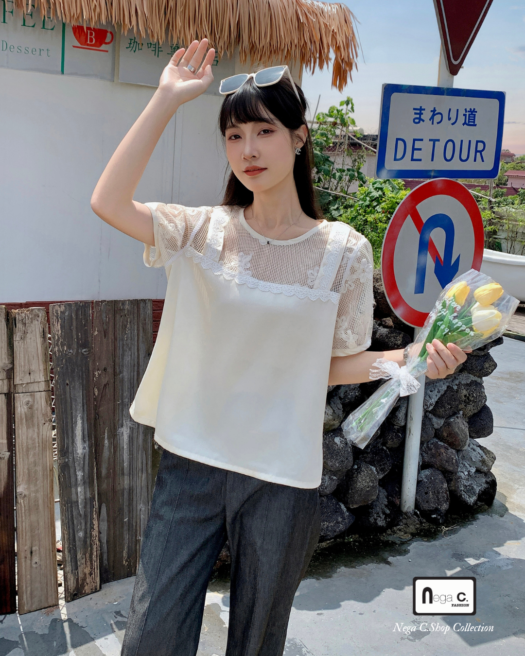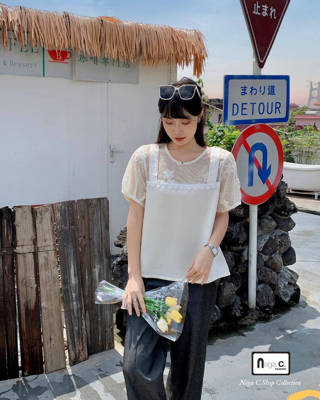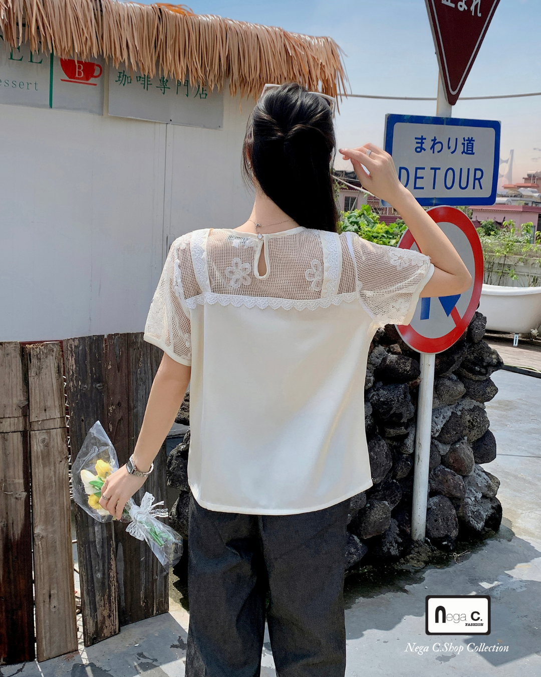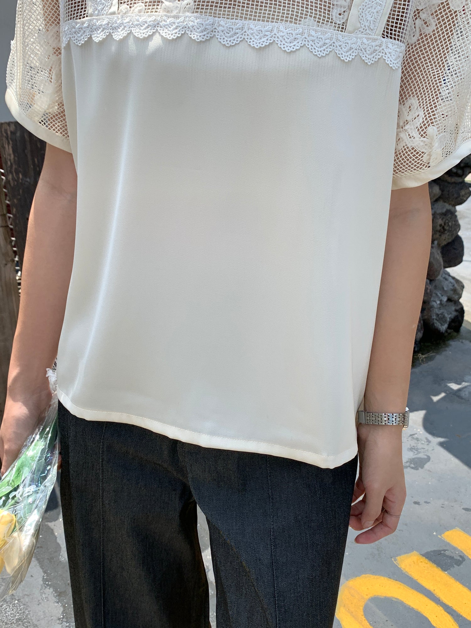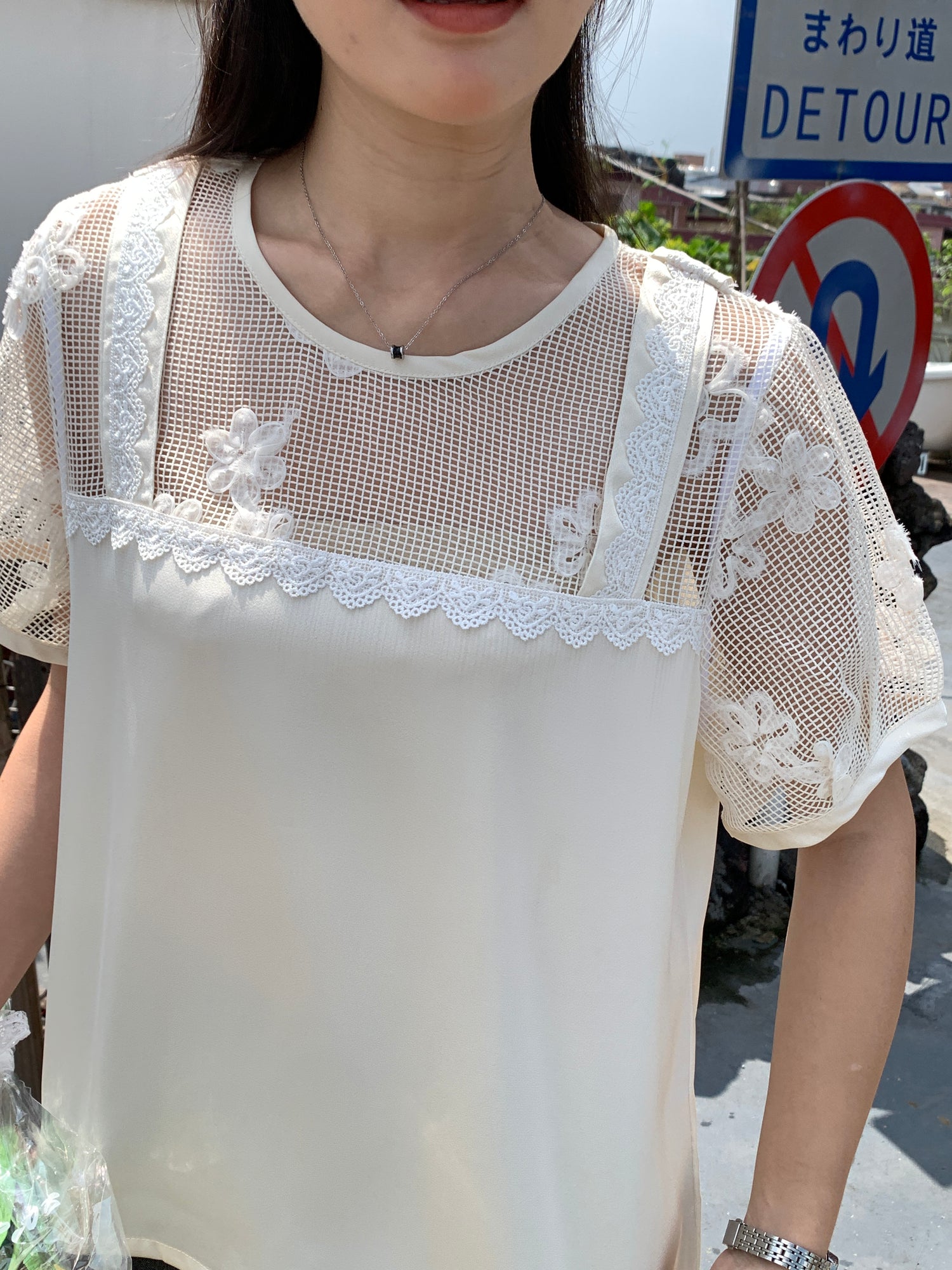 |優雅蕾絲拼接上衣|米色|無裡襯|無彈