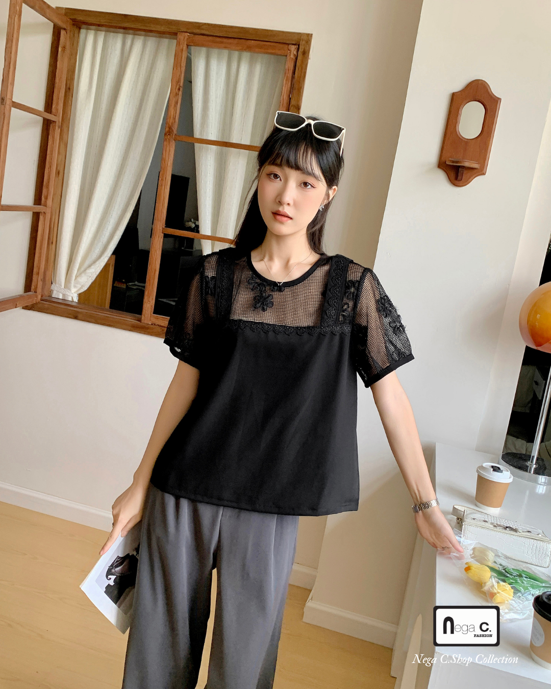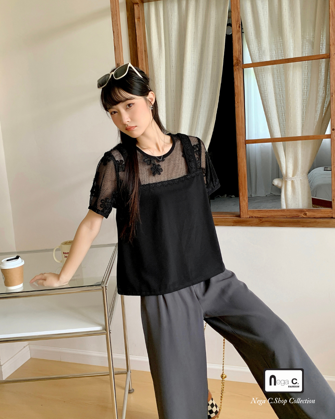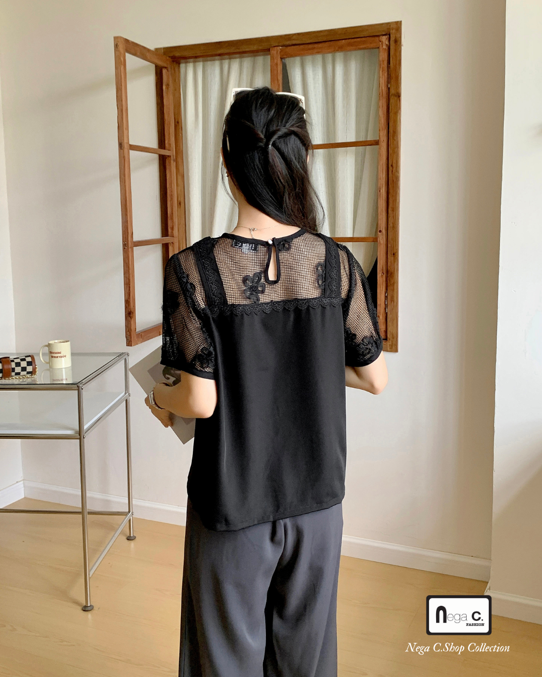 |優雅蕾絲拼接上衣|黑色|無裡襯|無彈