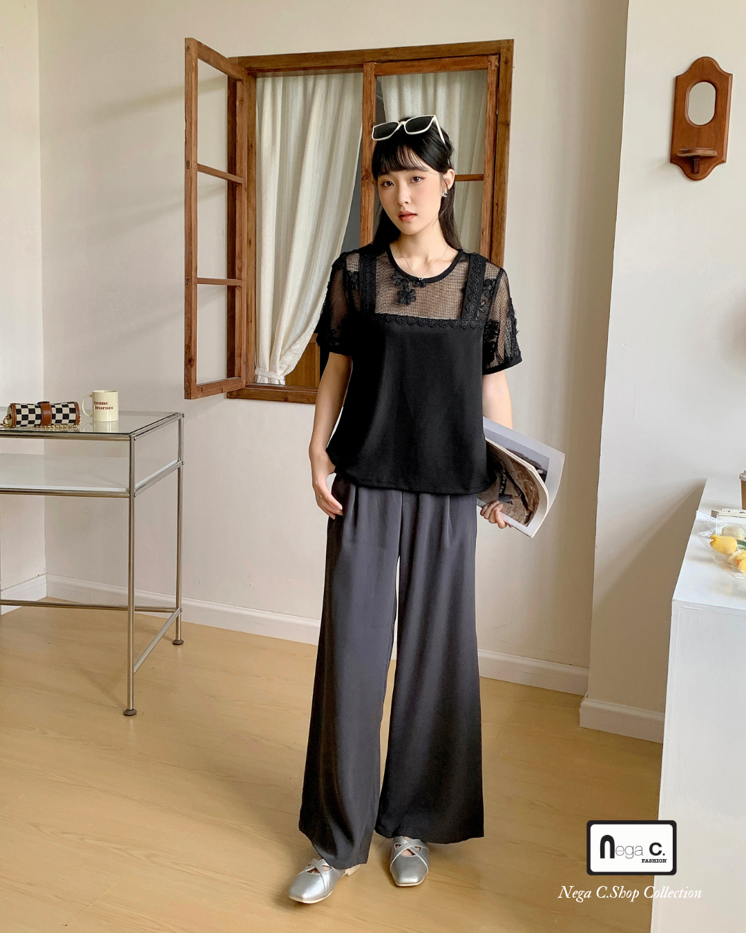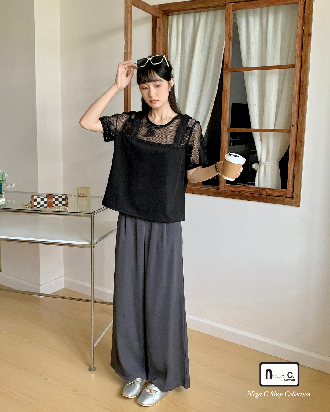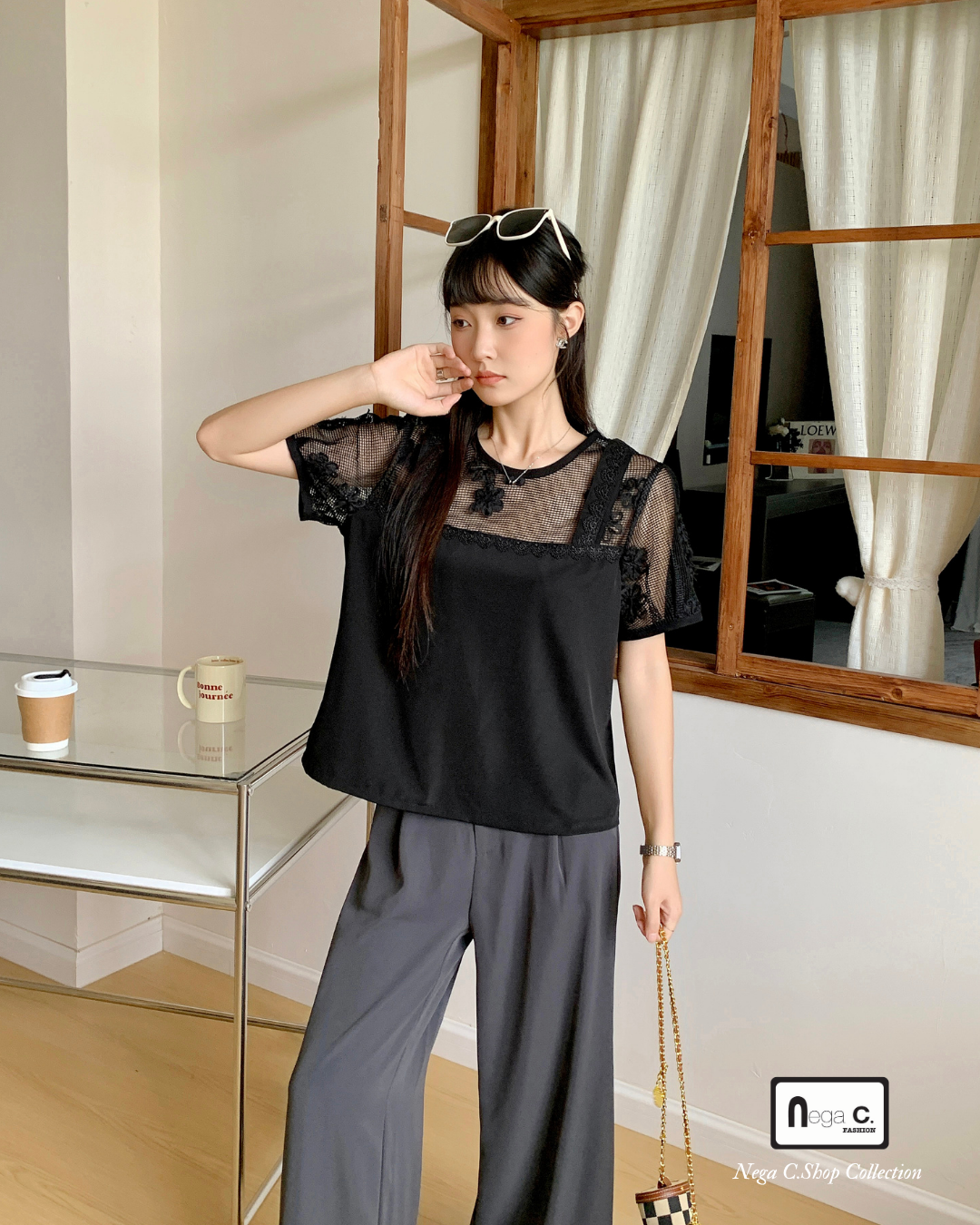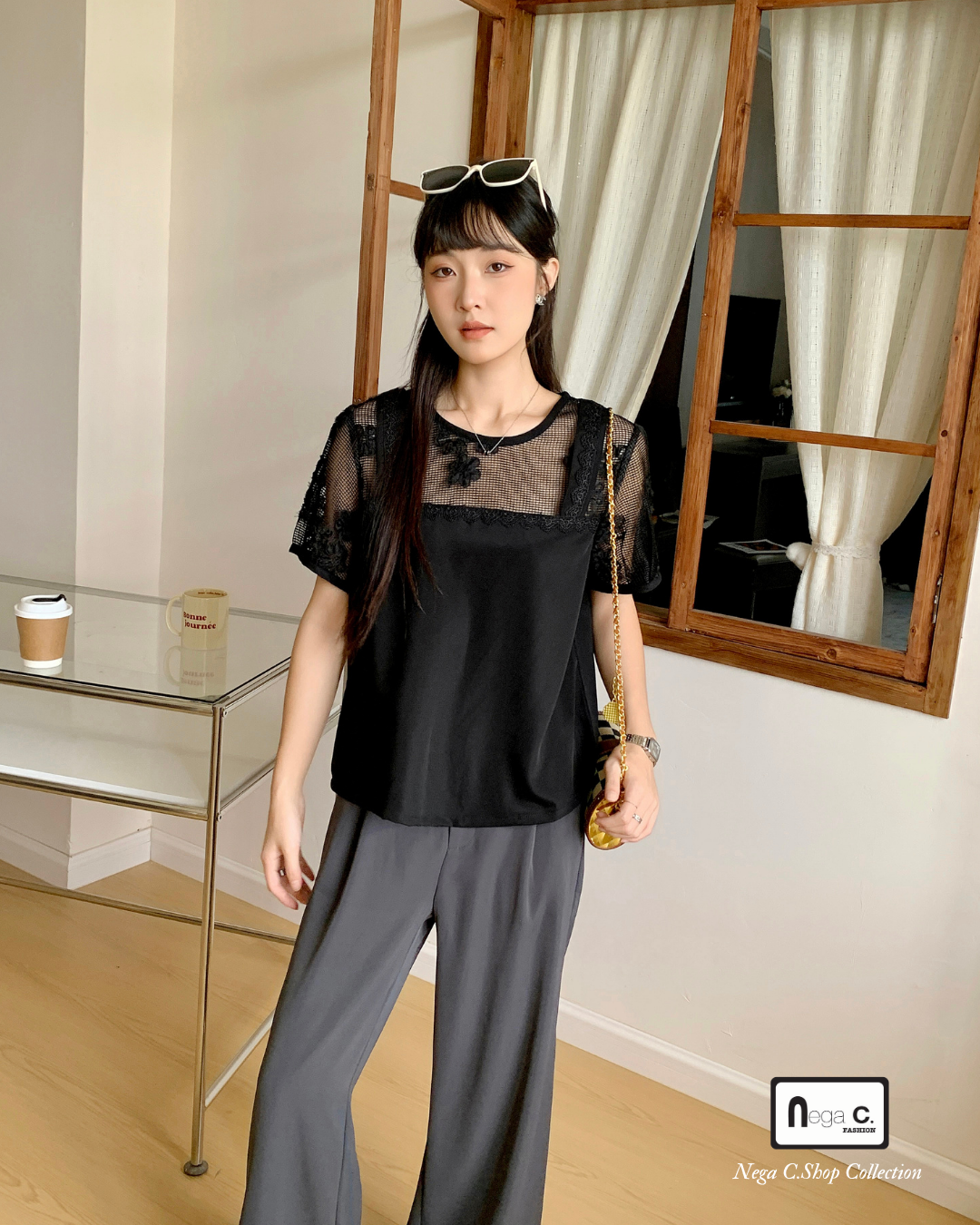 |優雅蕾絲拼接上衣|黑色|無裡襯|無彈