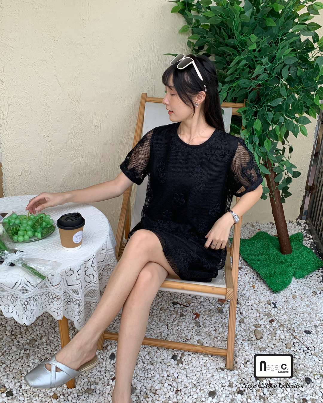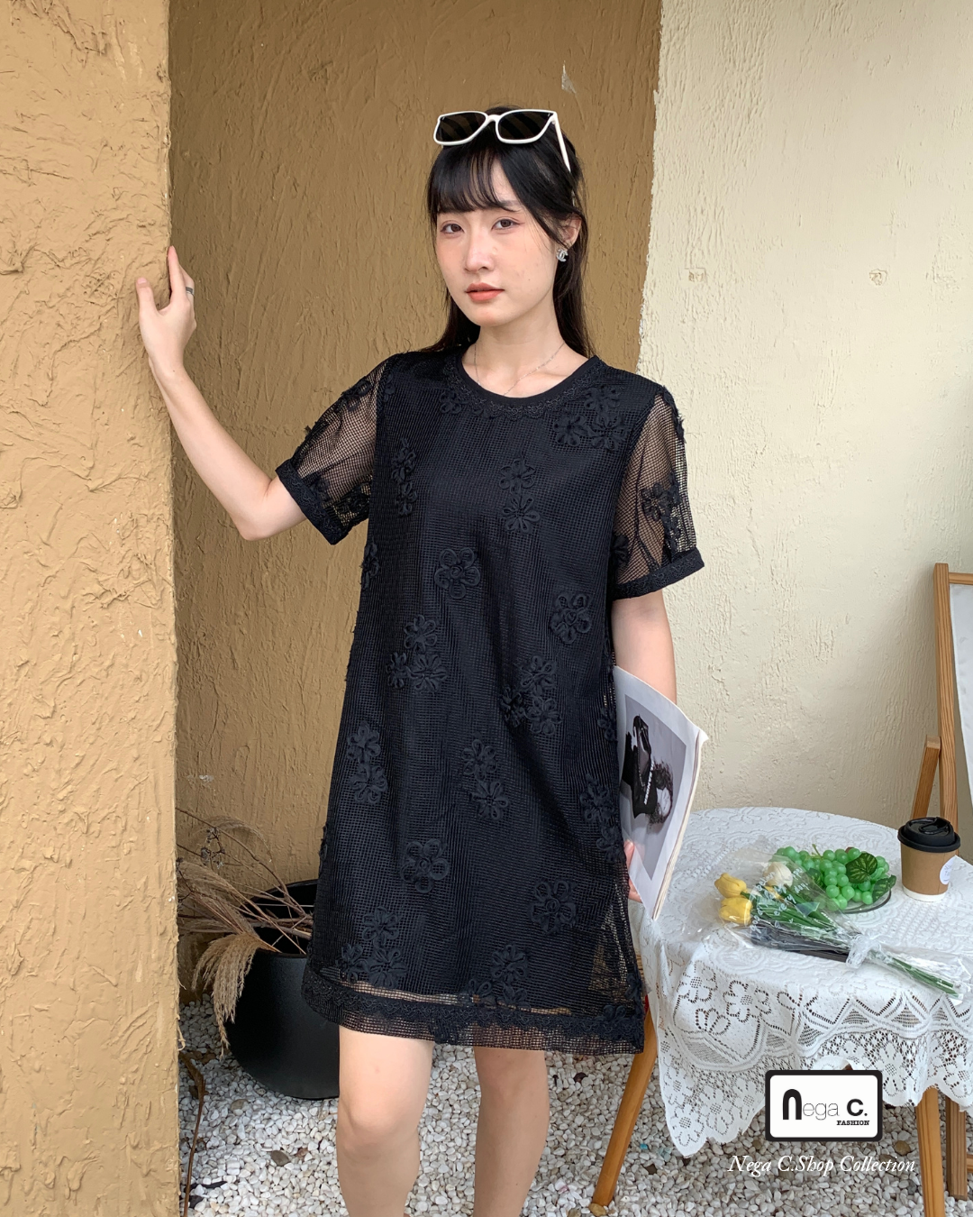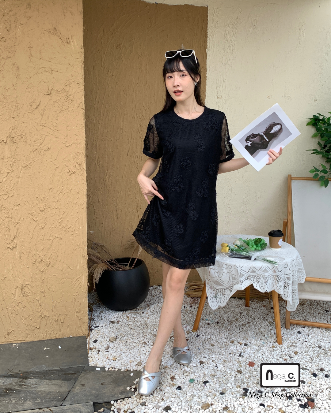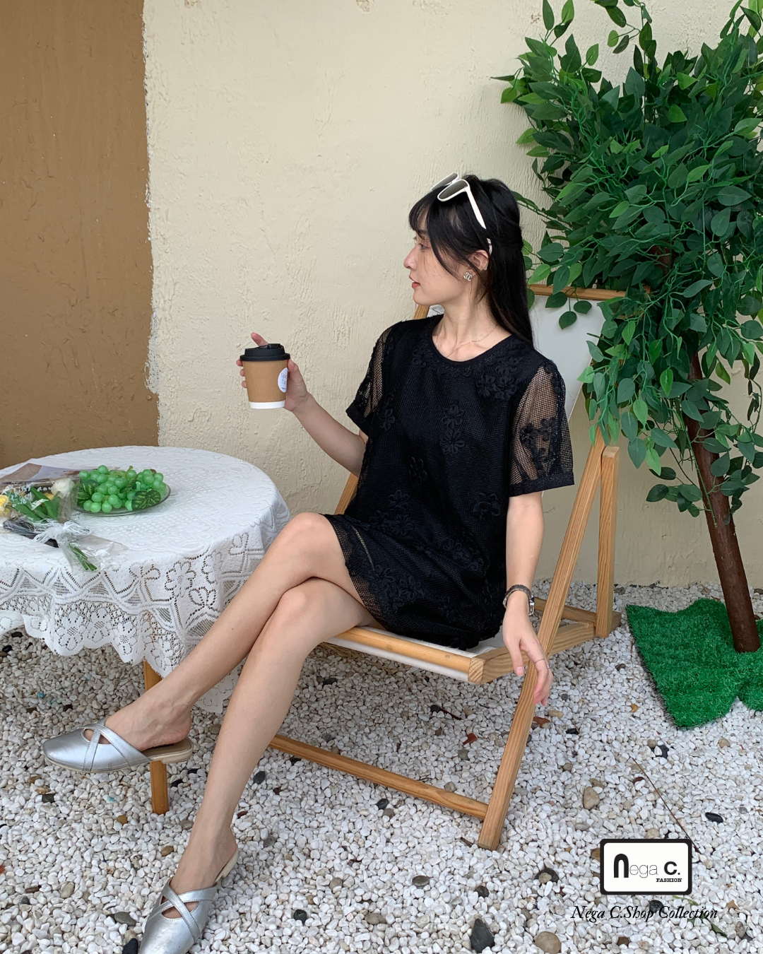 | 圓領蕾絲A型連身裙|黑色|有裡襯|無彈