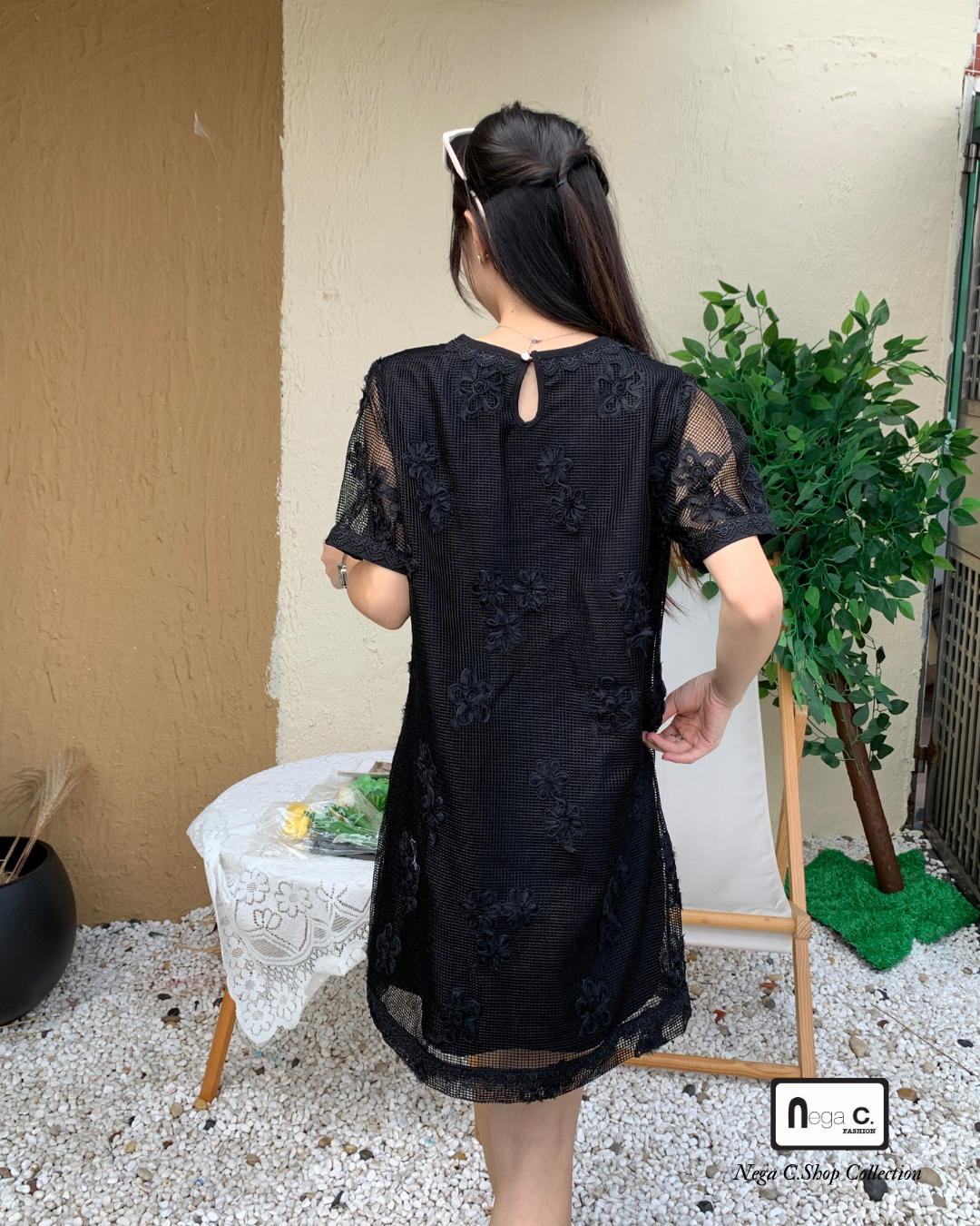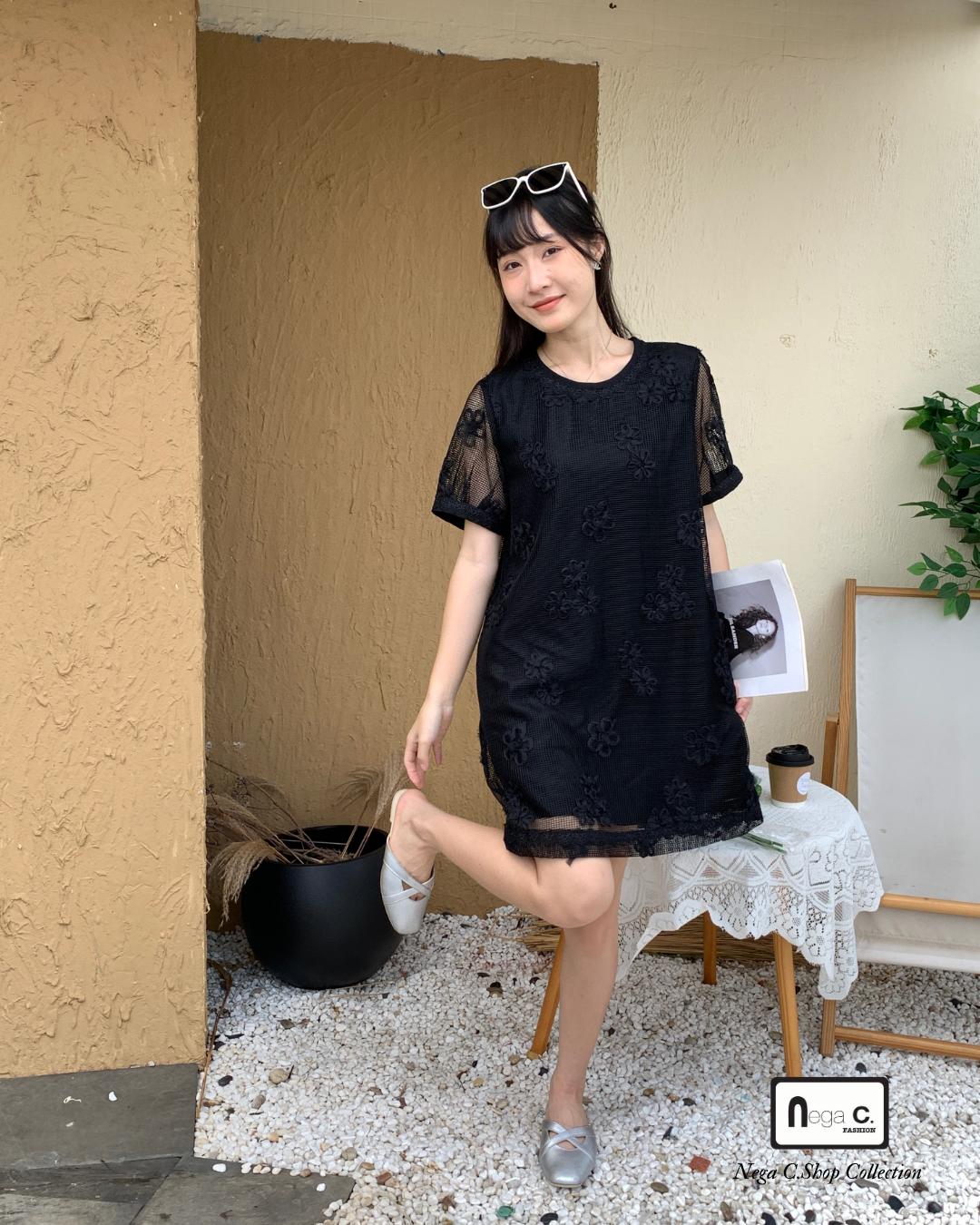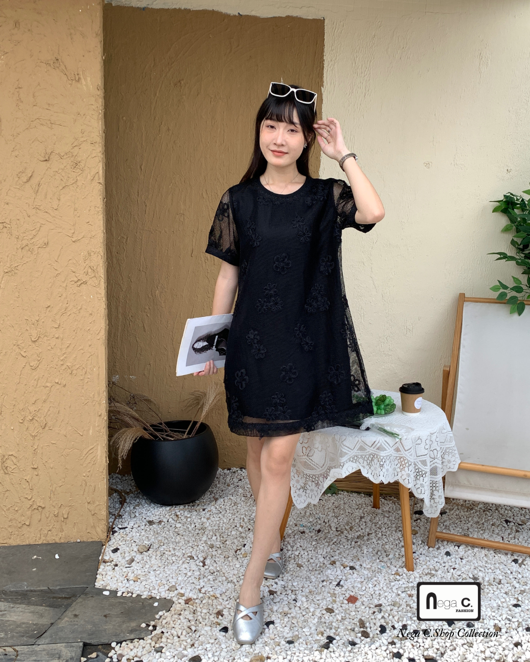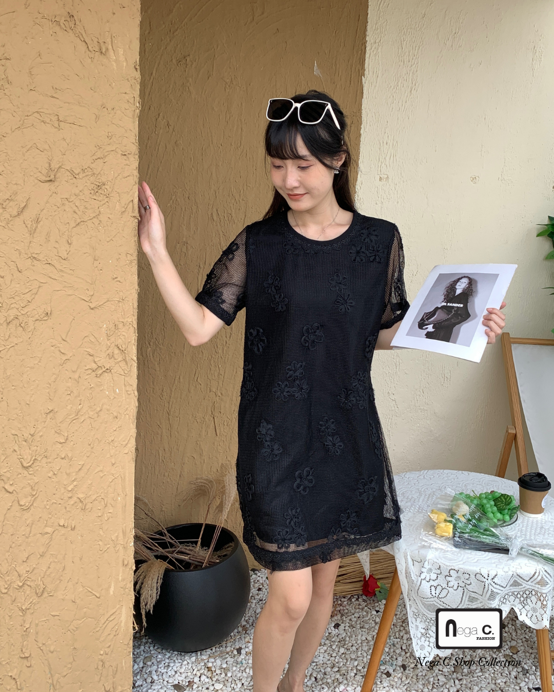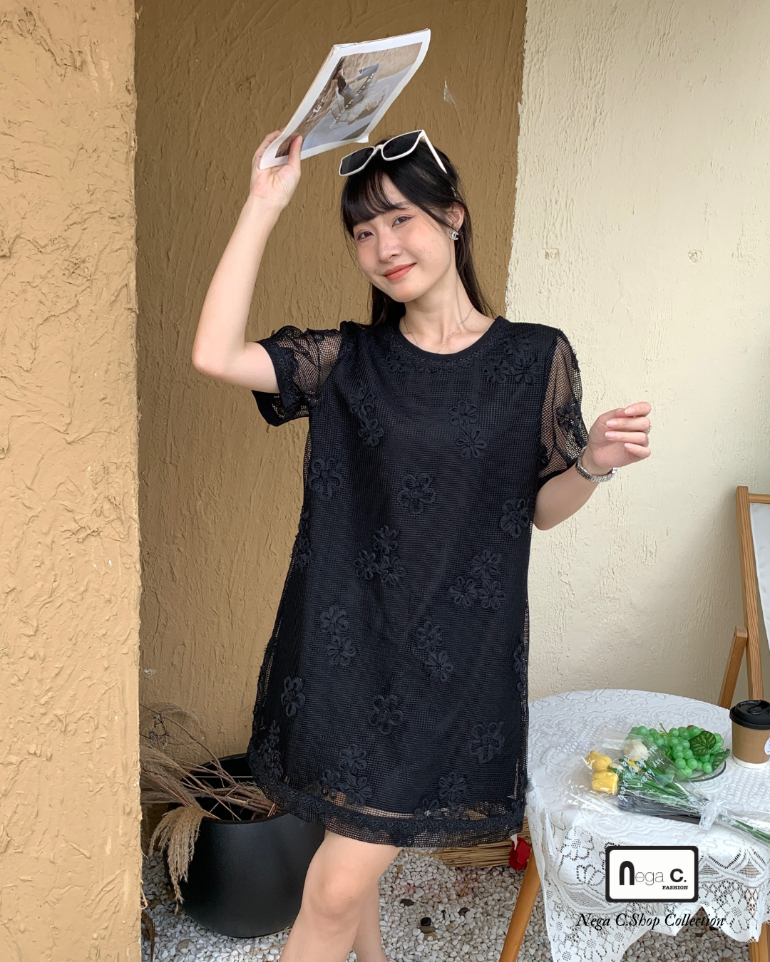 | 圓領蕾絲A型連身裙|黑色|有裡襯|無彈