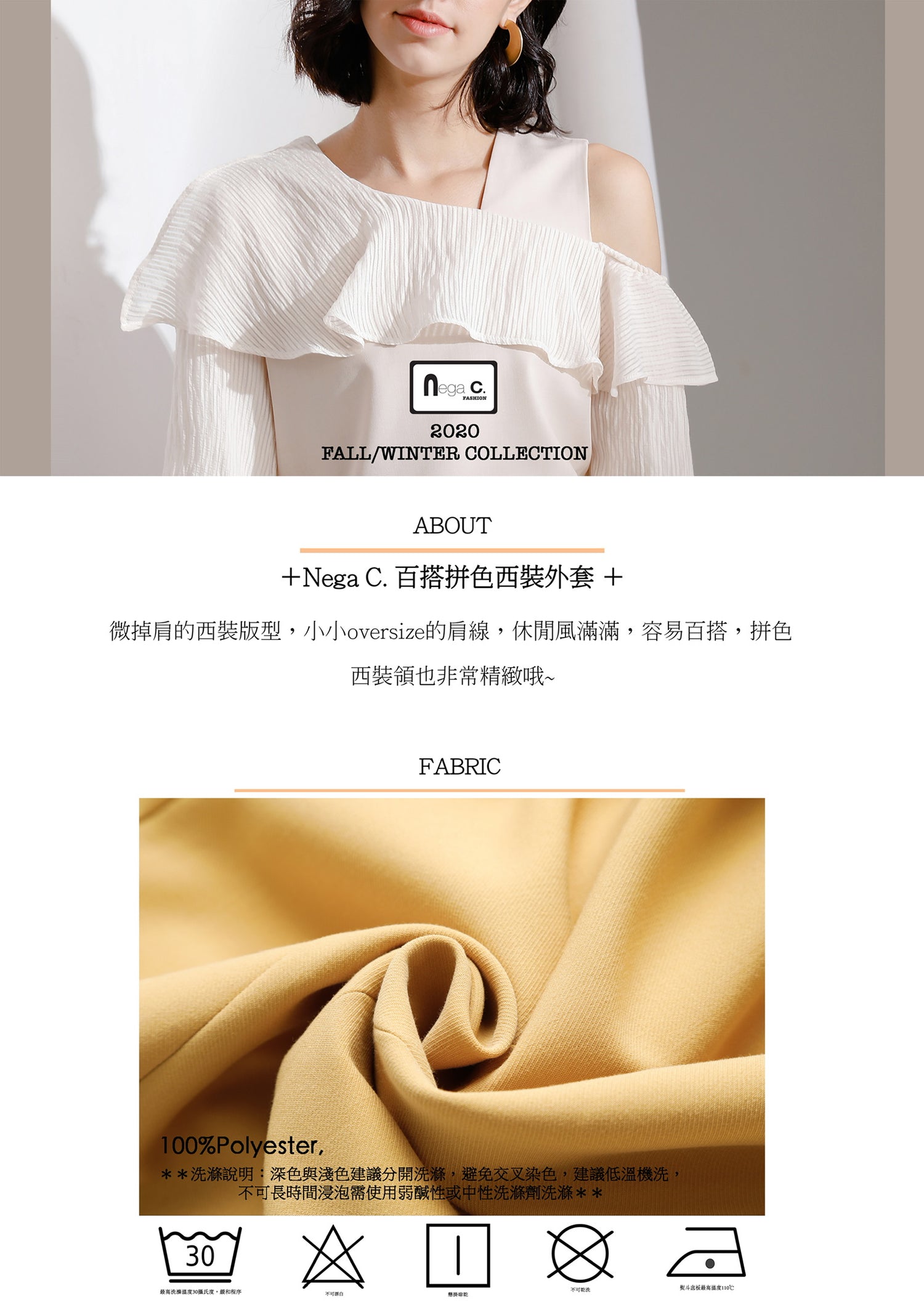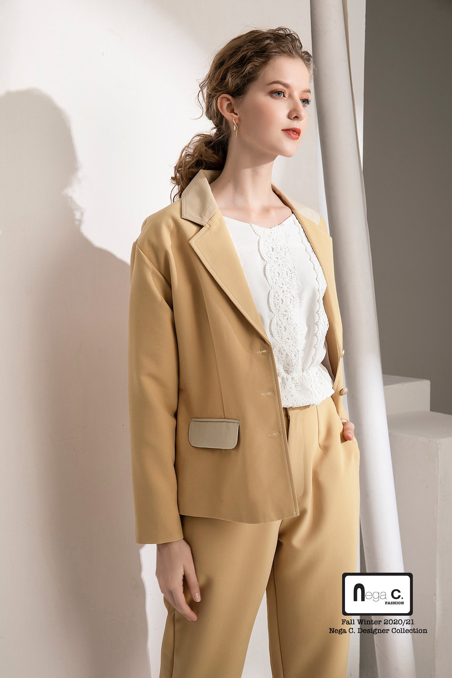 สไตล์ ชุดสูท มี ไหล่ตกเล็กน้อย และ มี สาย ไหล่ ขนาดใหญ่ เล็ก ๆ เต็มไปด้วยสไตล์ ลำลอง และ แมตช์ได้ง่าย คอปกสูท แบบ บล็อค สี ก็ ประณีต มากเช่น กัน ~
