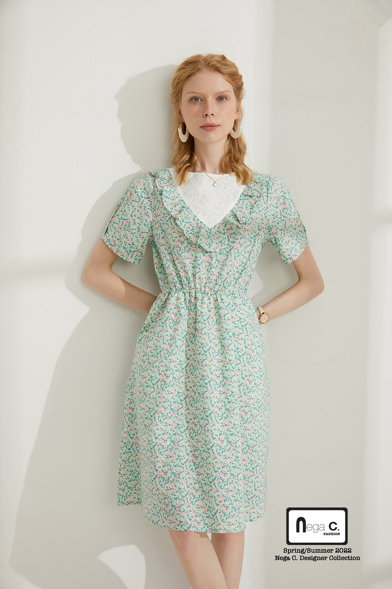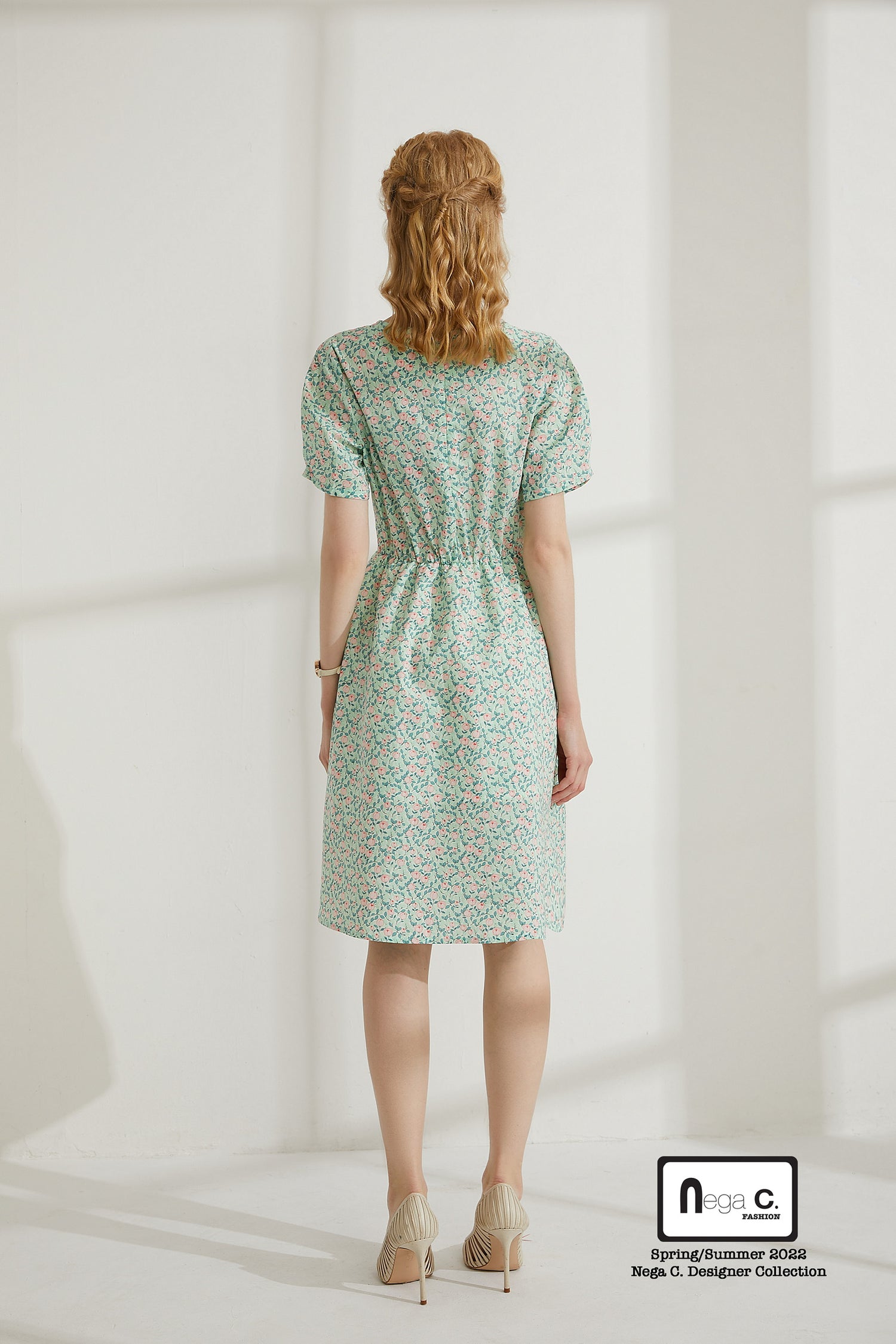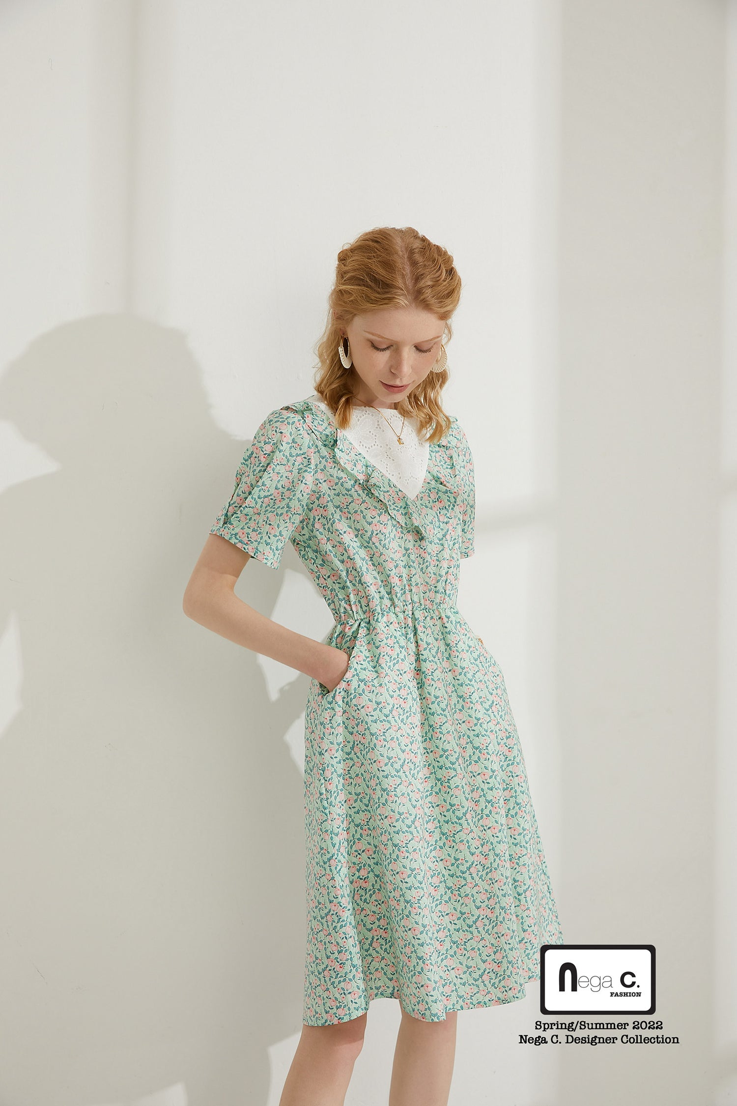 Nega C. เดรสคอกลมเย็บปะติดปะต่อลายดอกไม้ | สีเขียว | มีซับใน