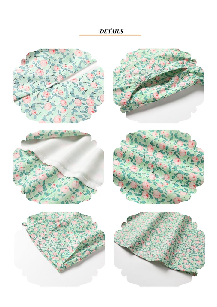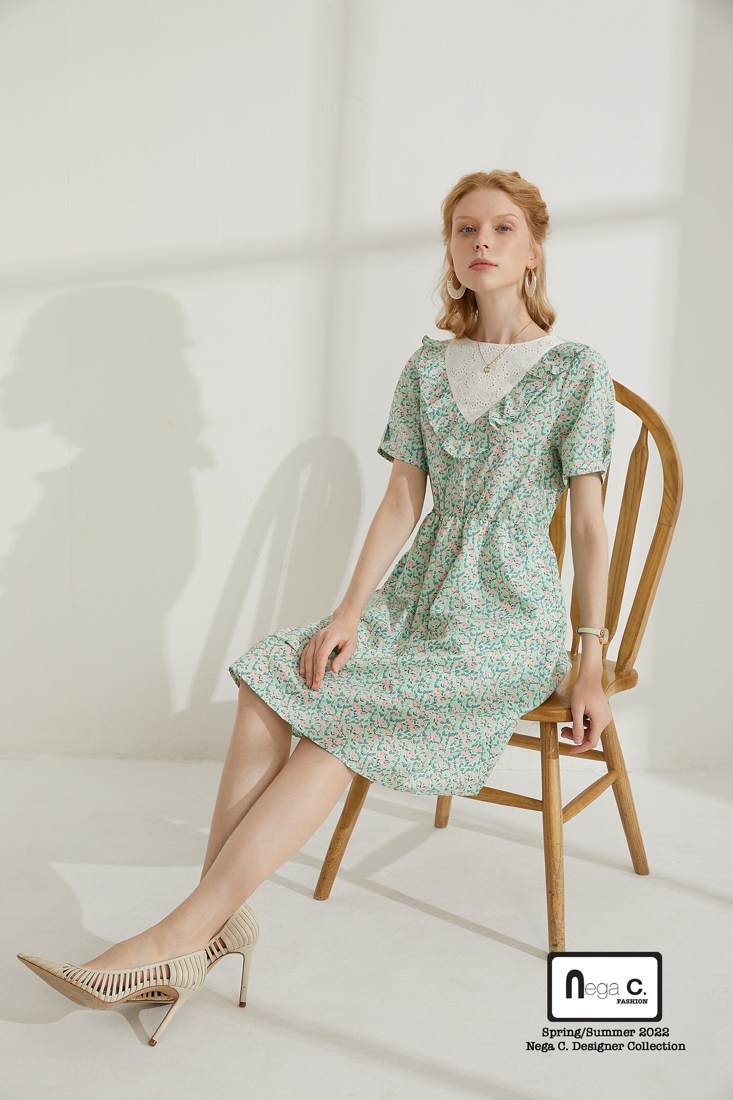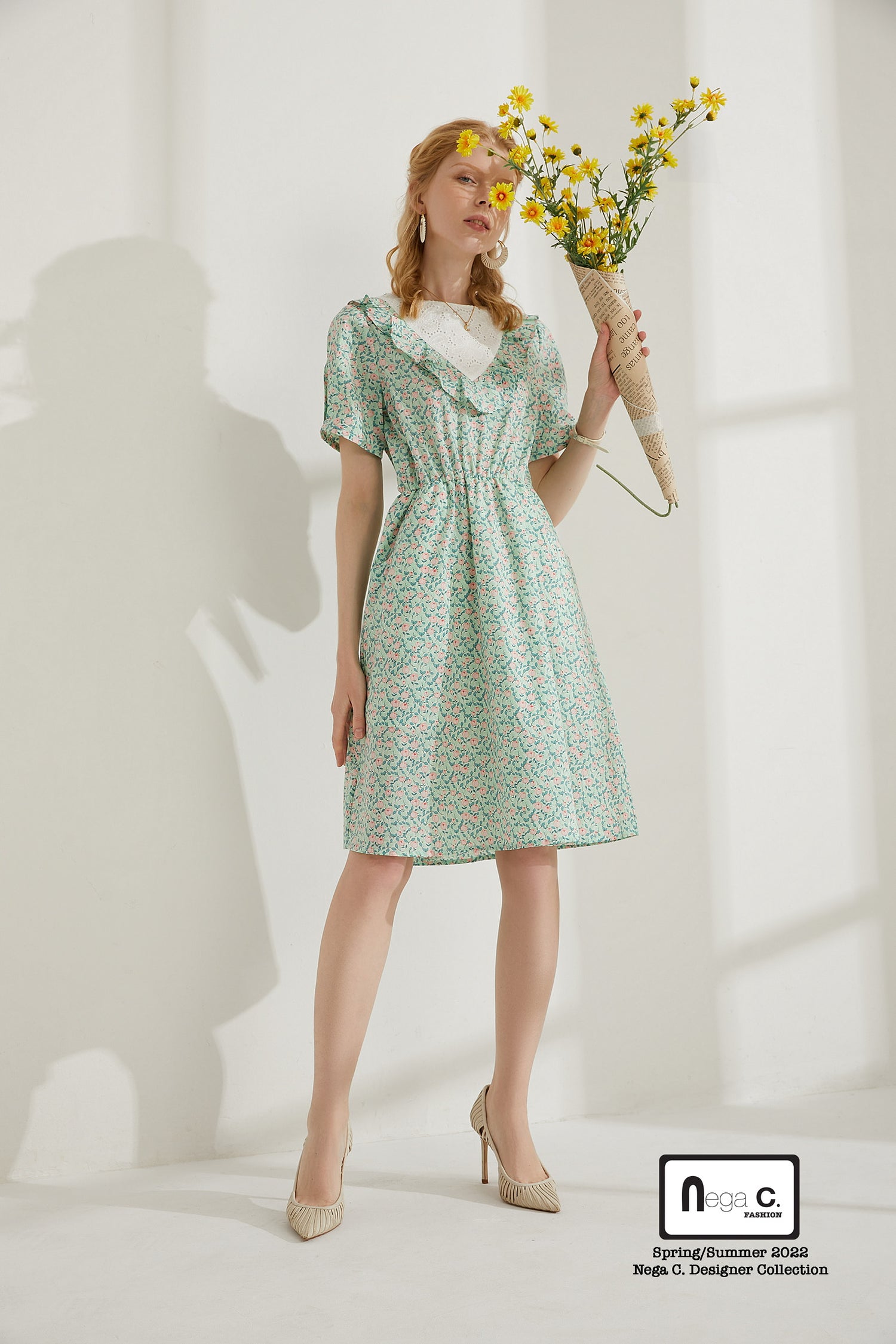 Nega C. เดรสคอกลมเย็บปะติดปะต่อลายดอกไม้ | สีเขียว | มีซับใน