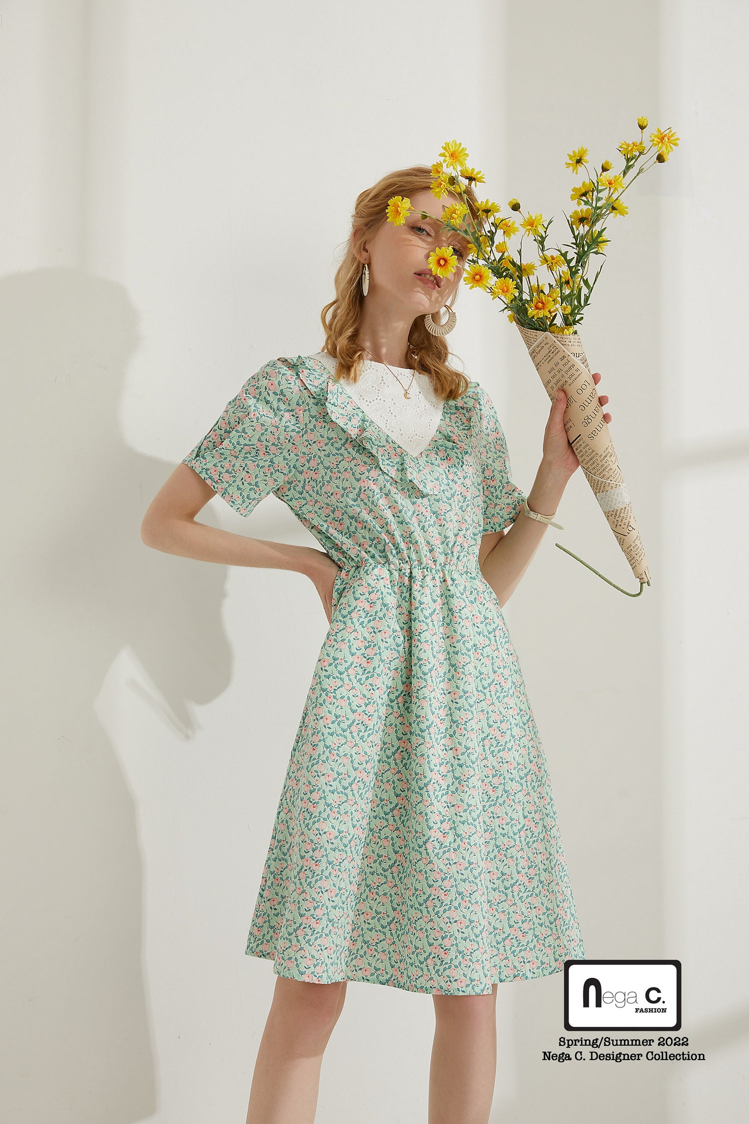 +Nega C. ชุดเดรสลายดอกไม้คอกลม+