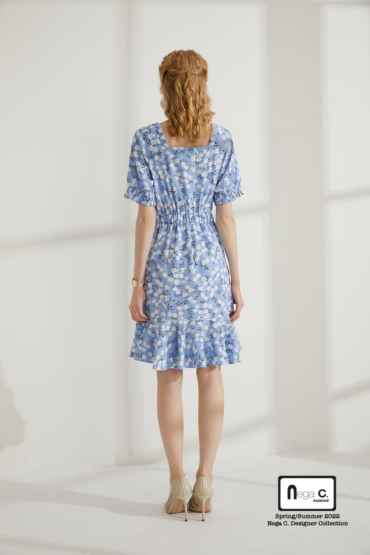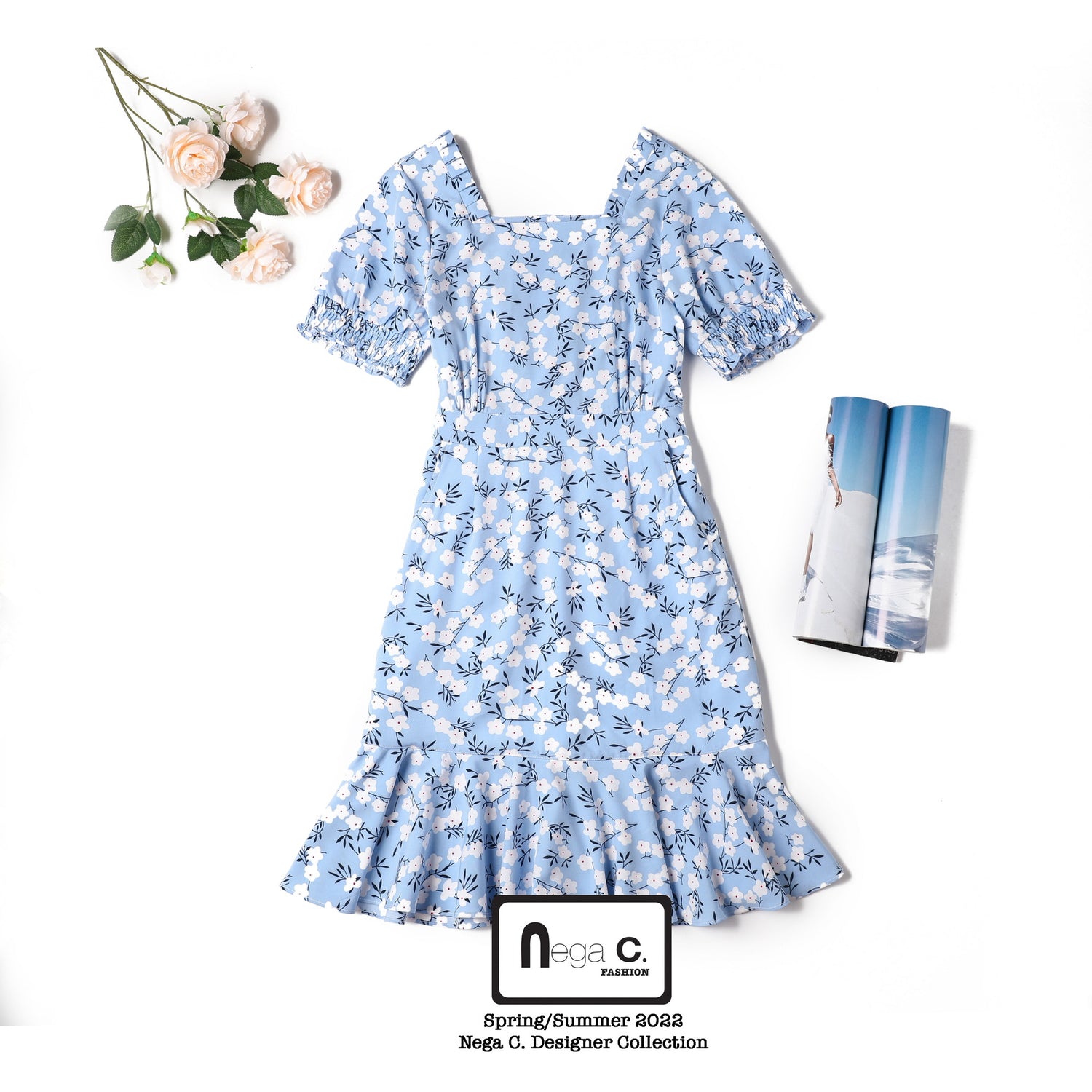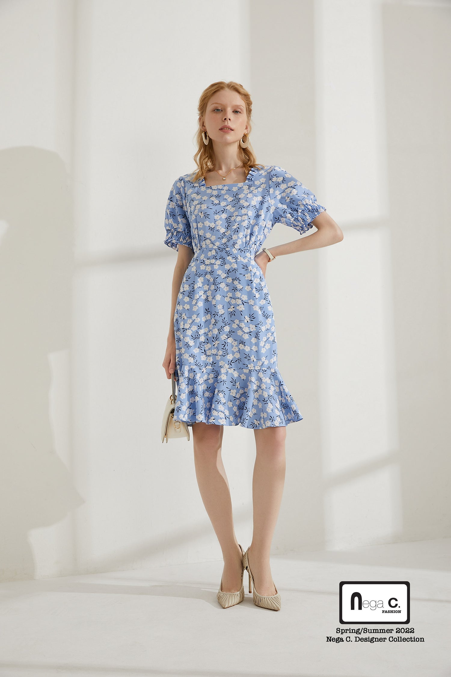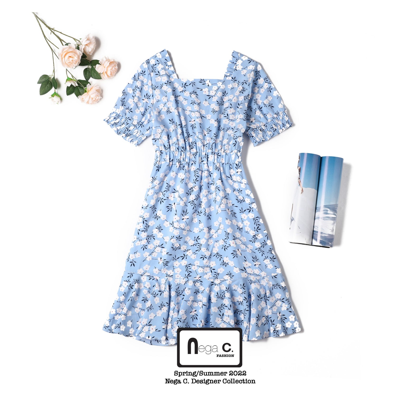 Nega C. เดรสคอเหลี่ยมลายดอกไม้เล็กสีขาว | ฟ้าอ่อน | มีซับใน