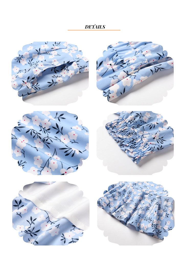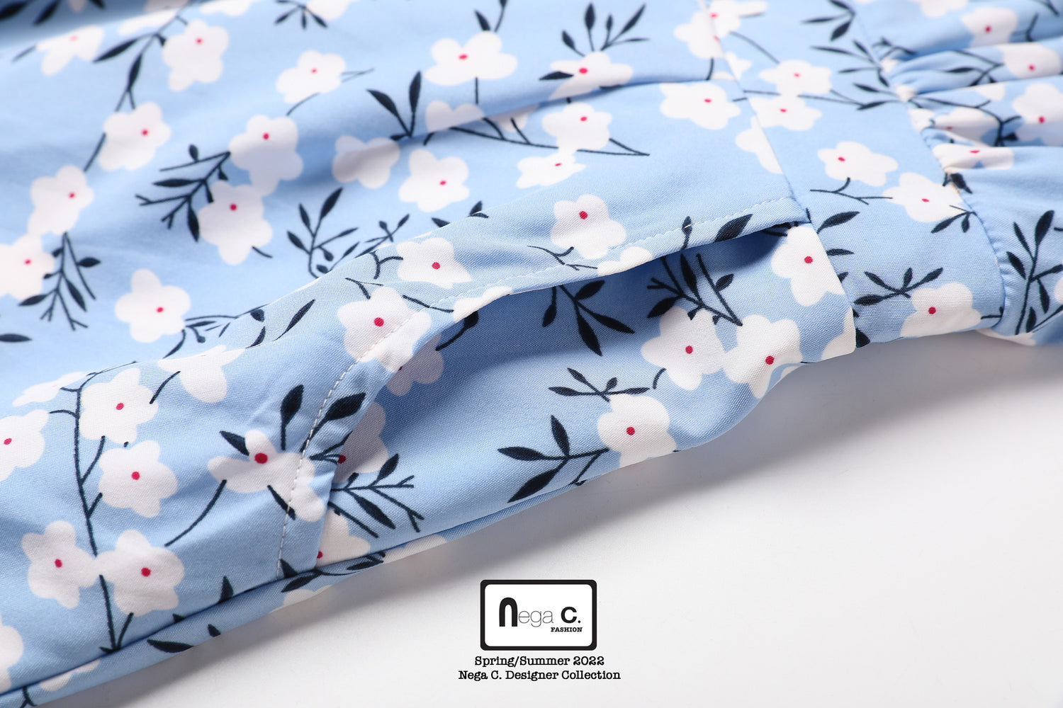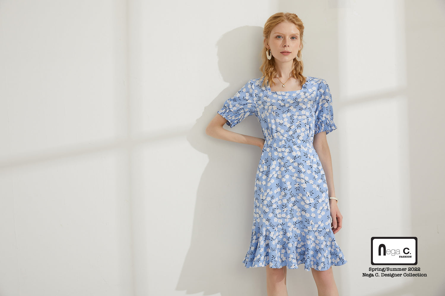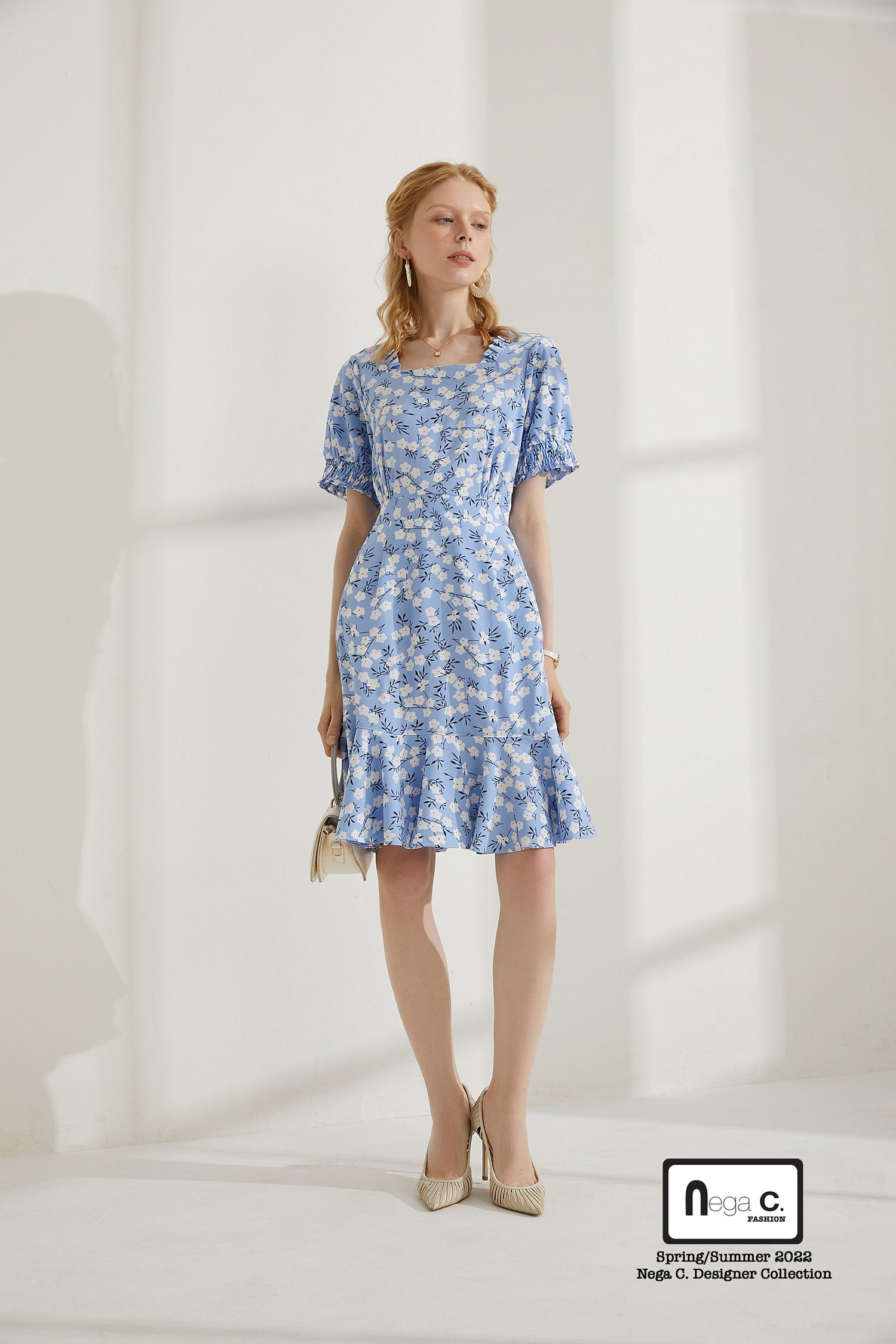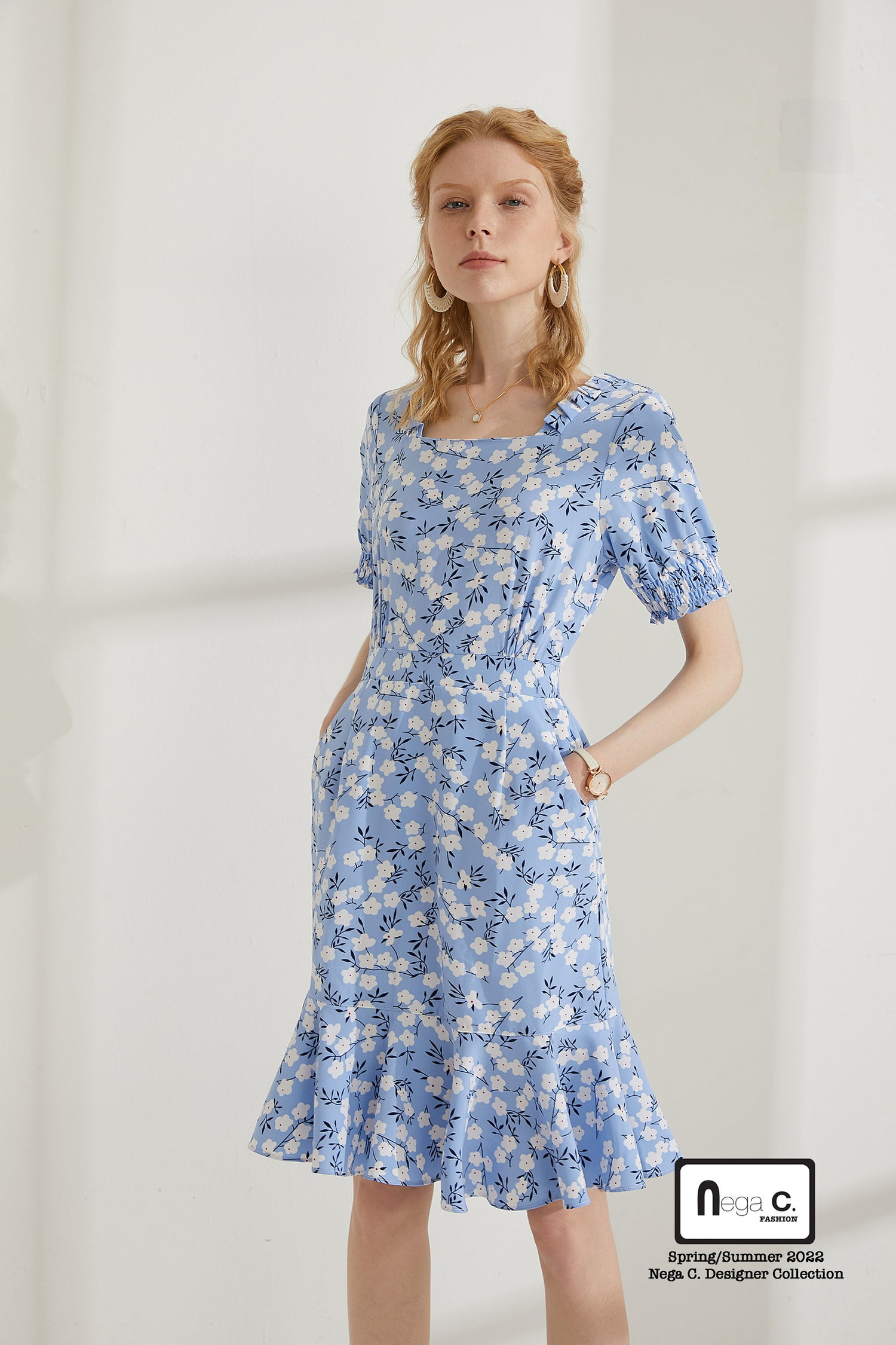 Nega C. เดรสคอเหลี่ยมลายดอกไม้เล็กสีขาว | ฟ้าอ่อน | มีซับใน