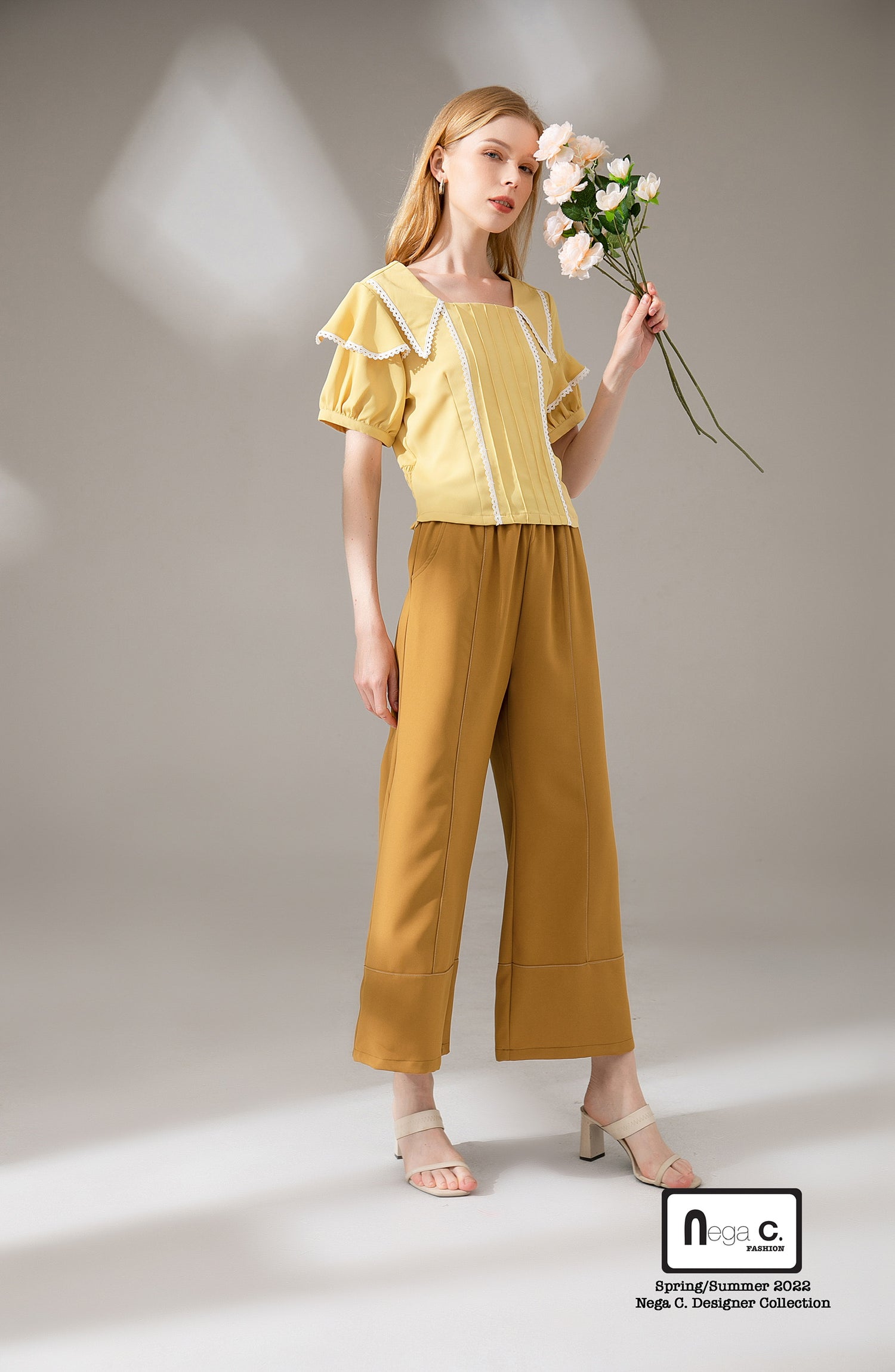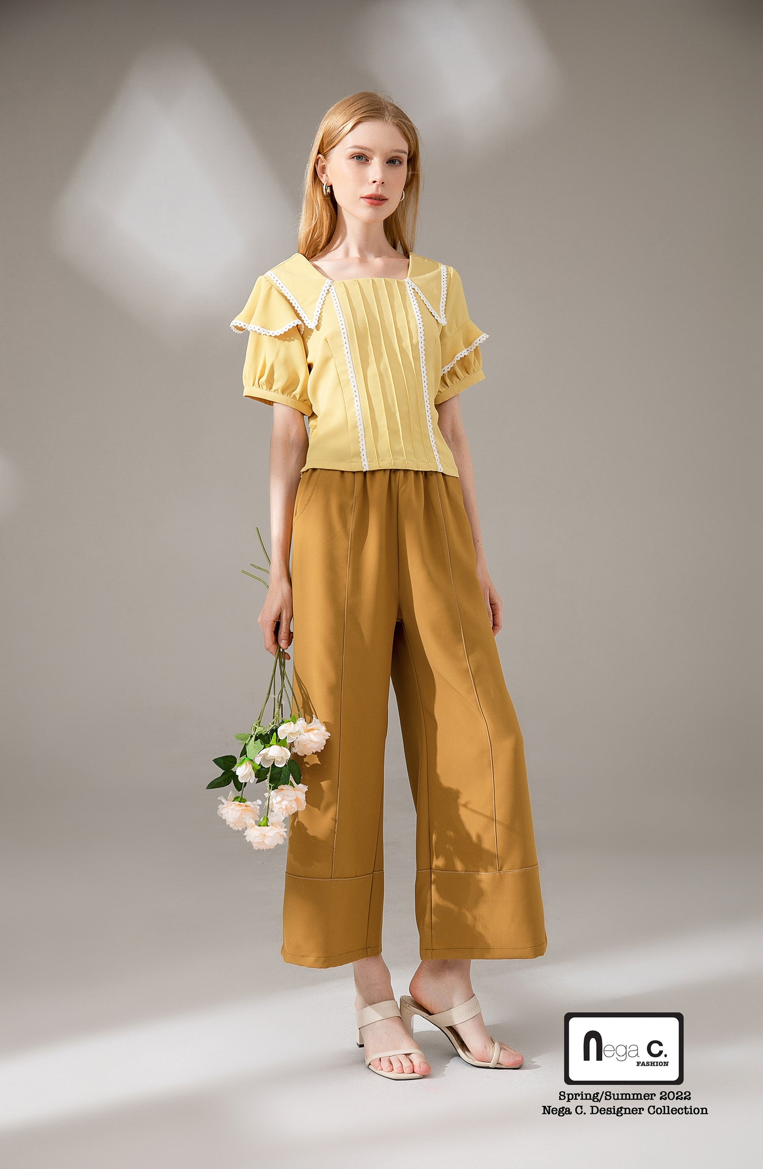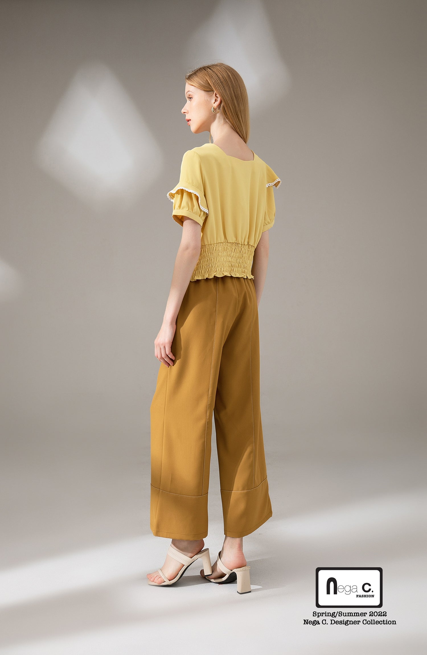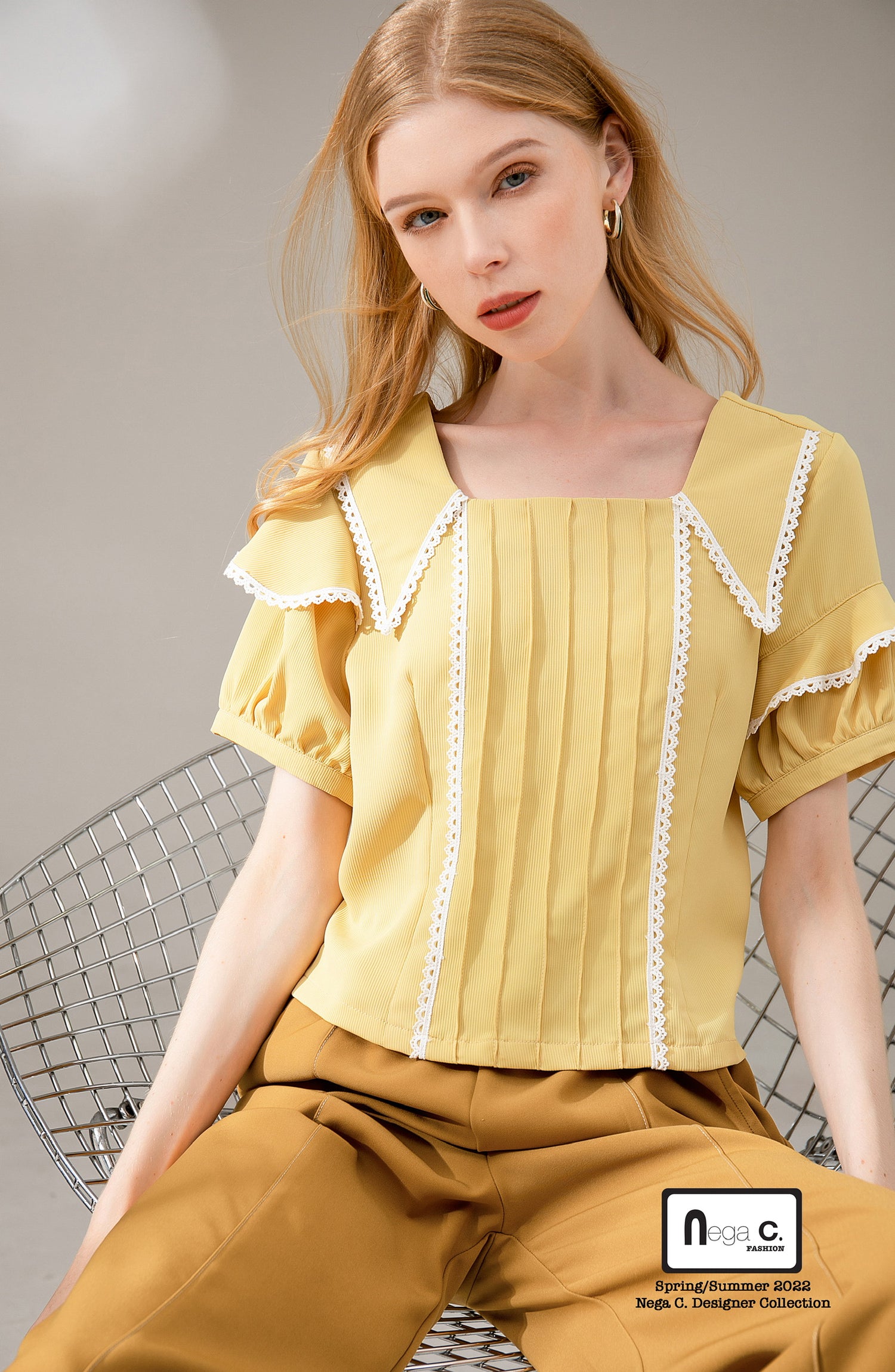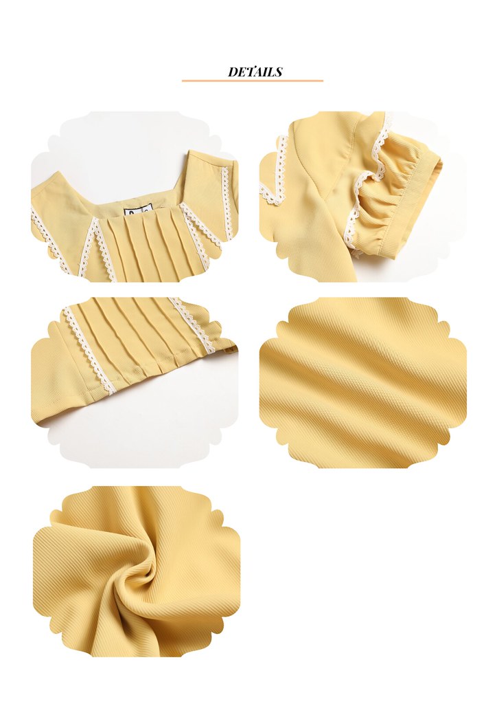 Nega C. เสื้อลูกไม้คอเหลี่ยมเอวสั้น|เหลือง|ไม่ยางยืด|ไม่มีซับใน