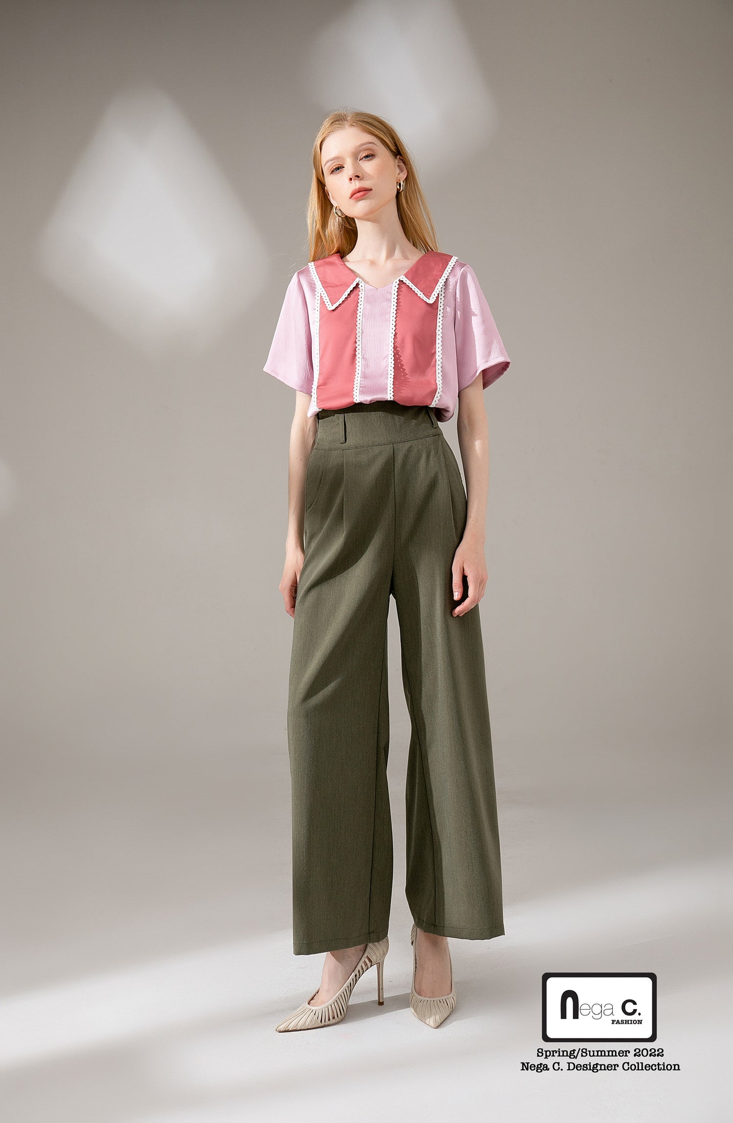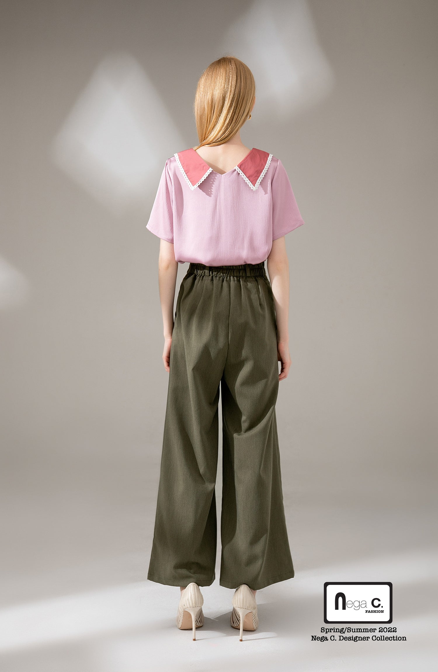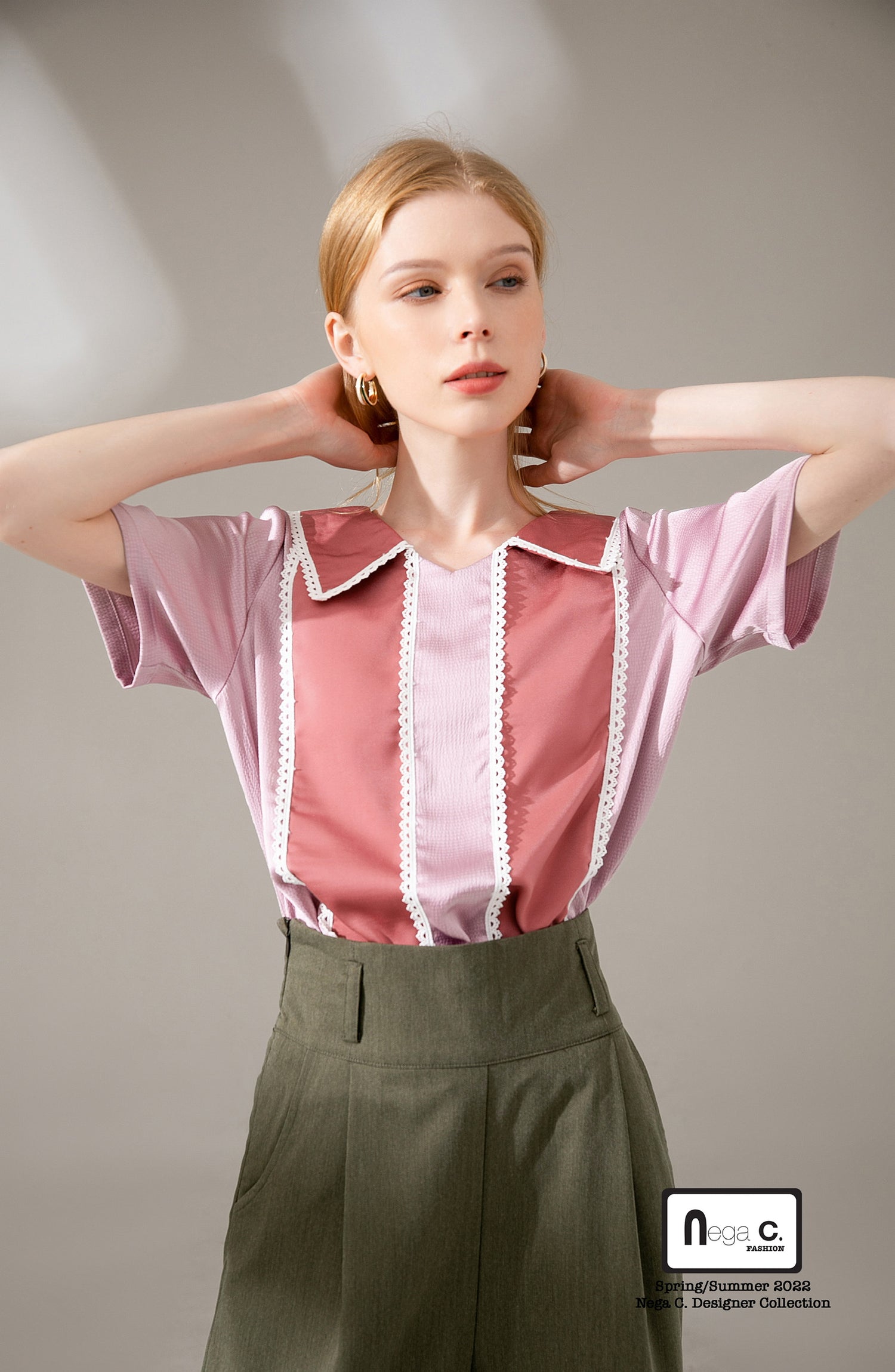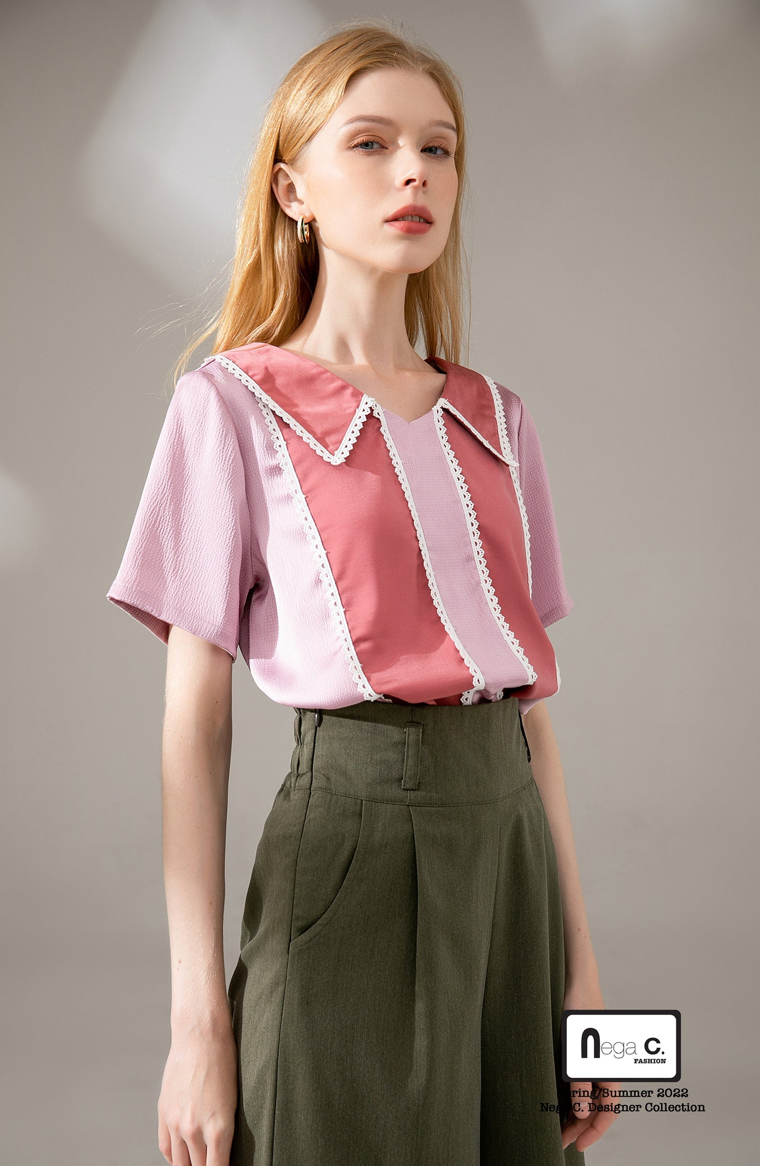 Nega C. Color block เสื้อลูกไม้คอวี | ชมพู | ผ้าไม่ยืด | ไม่มีซับใน
