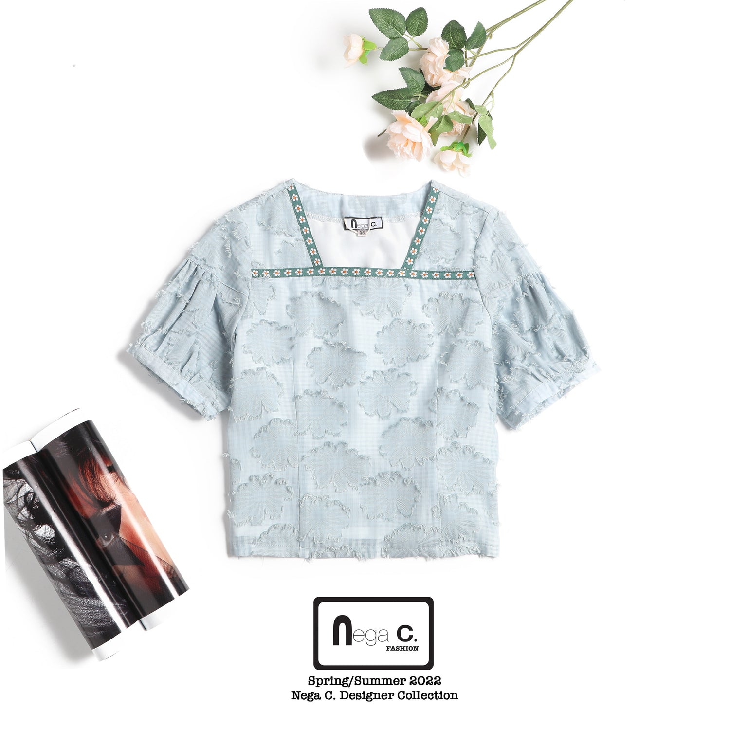 เสื้อแขนสั้นพัฟลายดอกไม้ | สีน้ำเงิน | ซับครึ่งตัว | ไม่ยืดหยุ่น