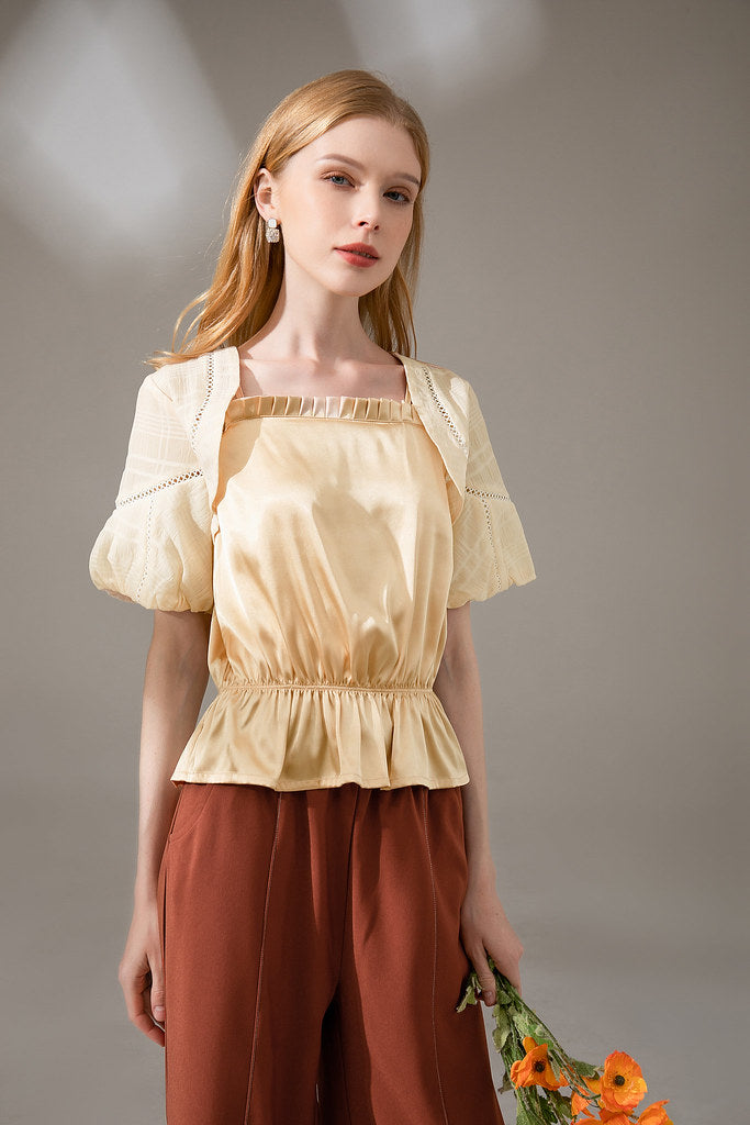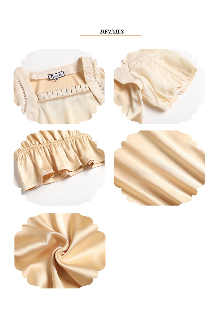 + Nega C. เสื้อทูนิคคอเหลี่ยมเย็บปะติดปะต่อ | แอปริคอท | ครึ่งตัว | ไม่ยืด+