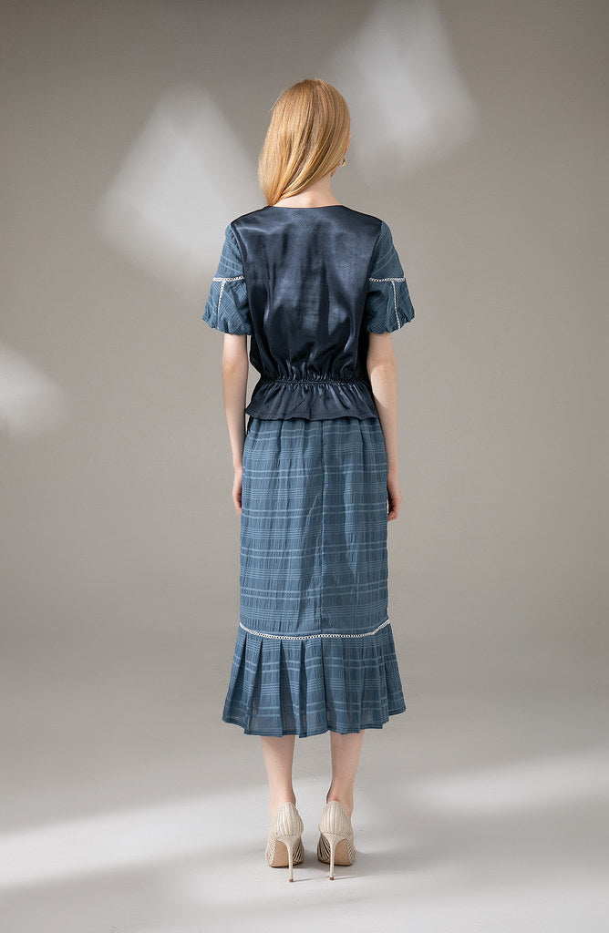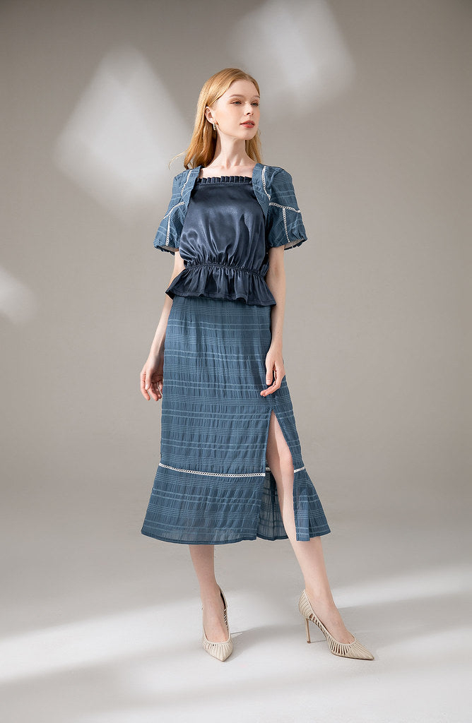 Nega C. เสื้อทูนิคคอเหลี่ยมงานเย็บปะติดปะต่อ | สีน้ำเงินเข้ม | มีซับในครึ่งตัว | ไม่ยืด