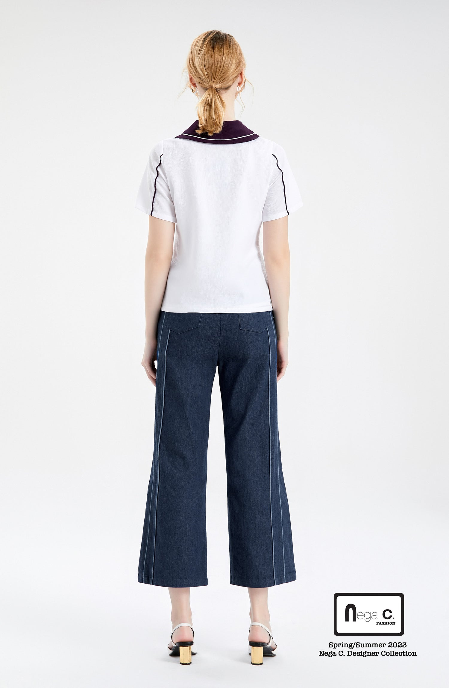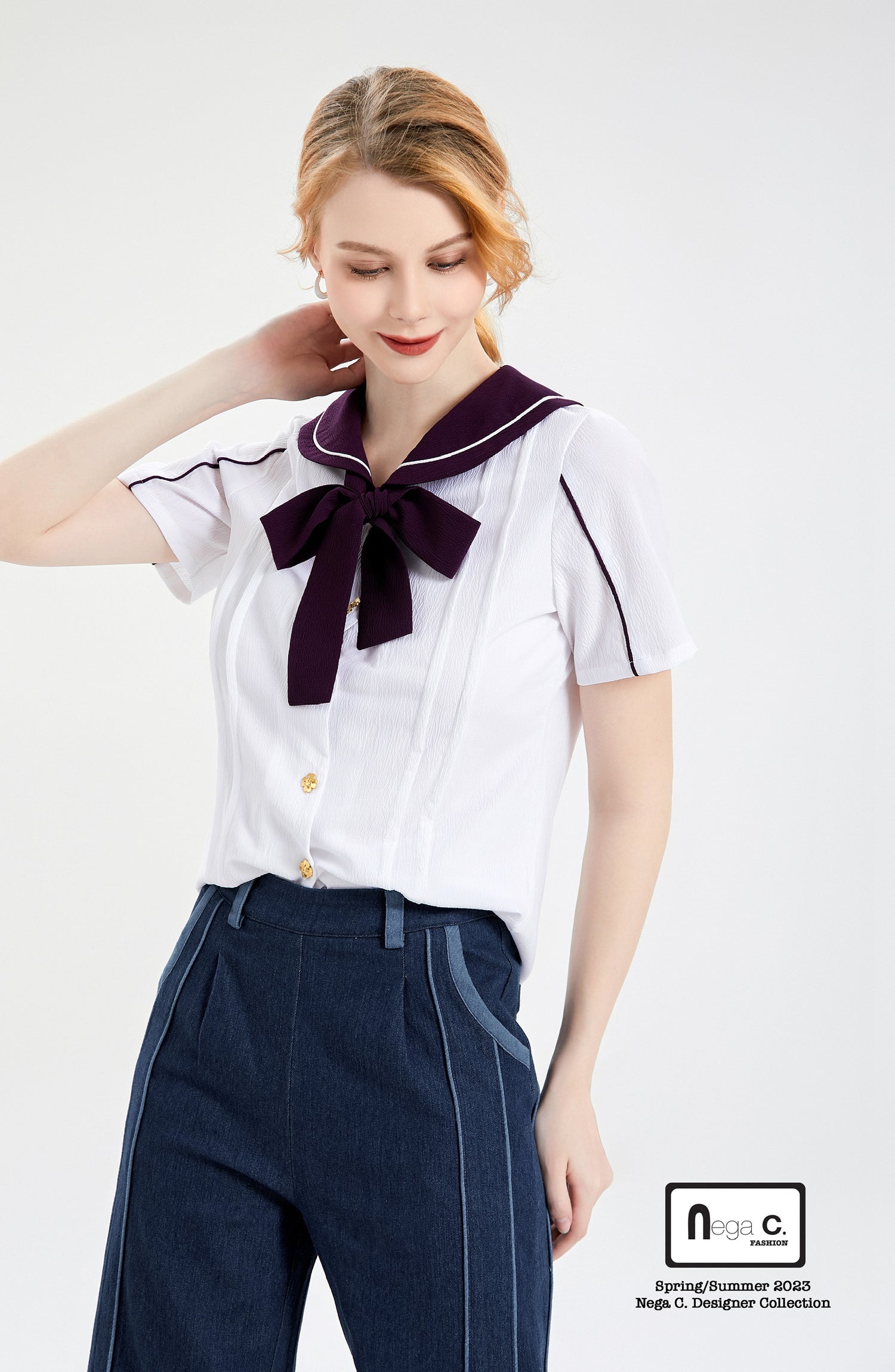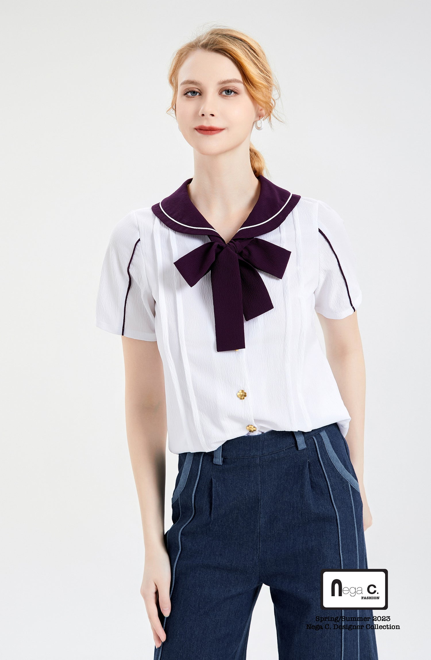ไม่ว่าจะจับคู่กับยีนส์หรือกระโปรง เชิ้ตคอปกกะลาสีสีม่วงและสีขาวก็จะทำให้คุณโดดเด่น การออกแบบคลาสสิกและสไตล์ที่เป็นเอกลักษณ์ช่วยเพิ่มความเป็นไปได้ให้กับการแต่งตัวของคุณ