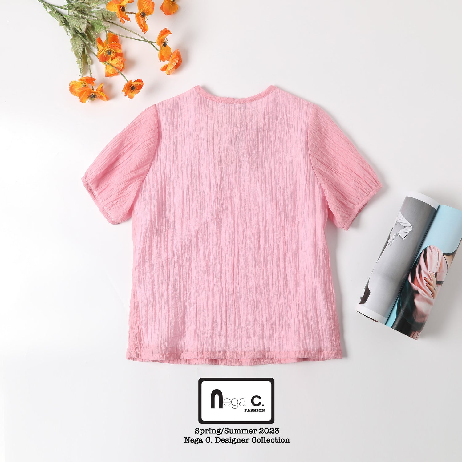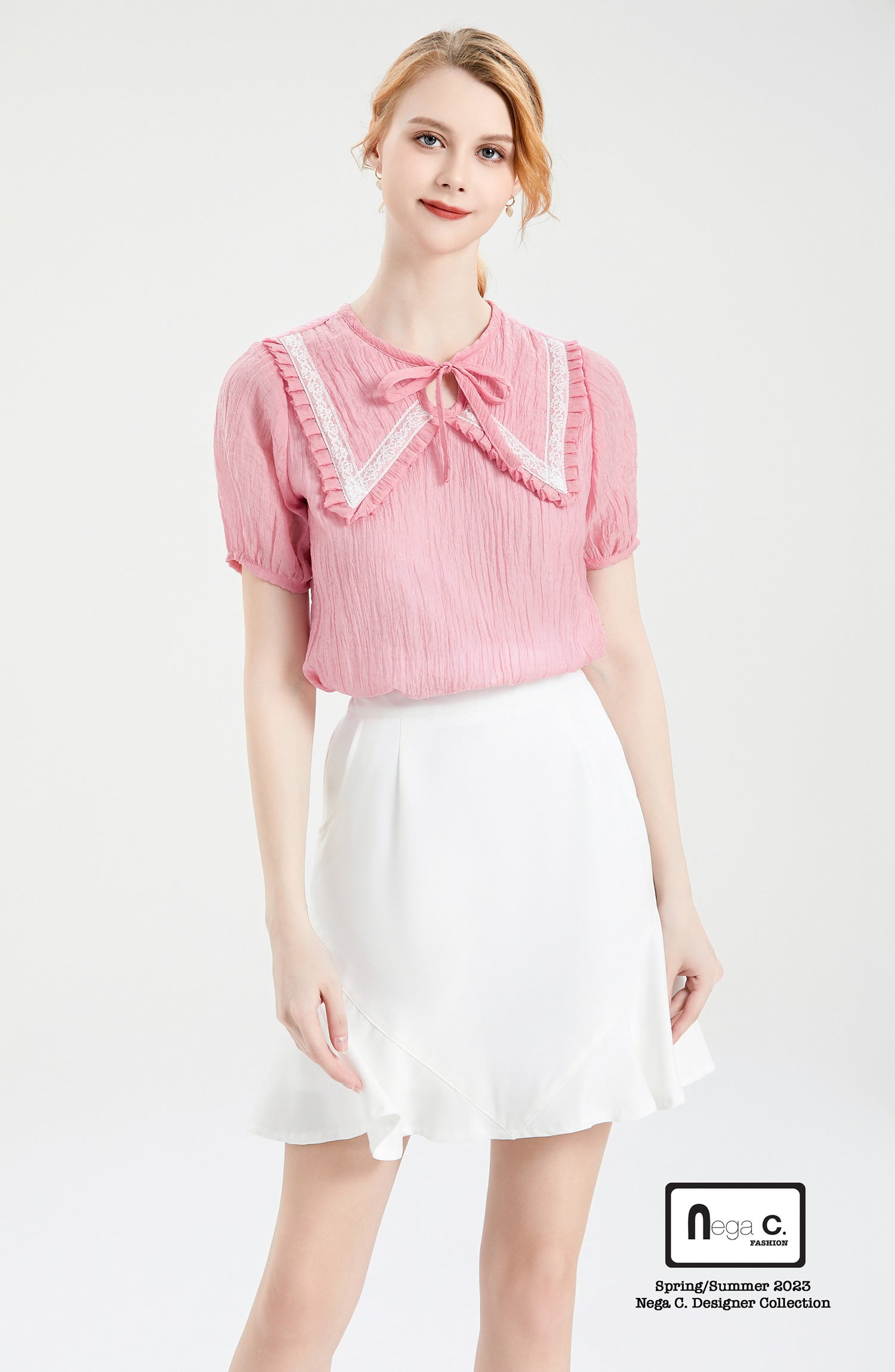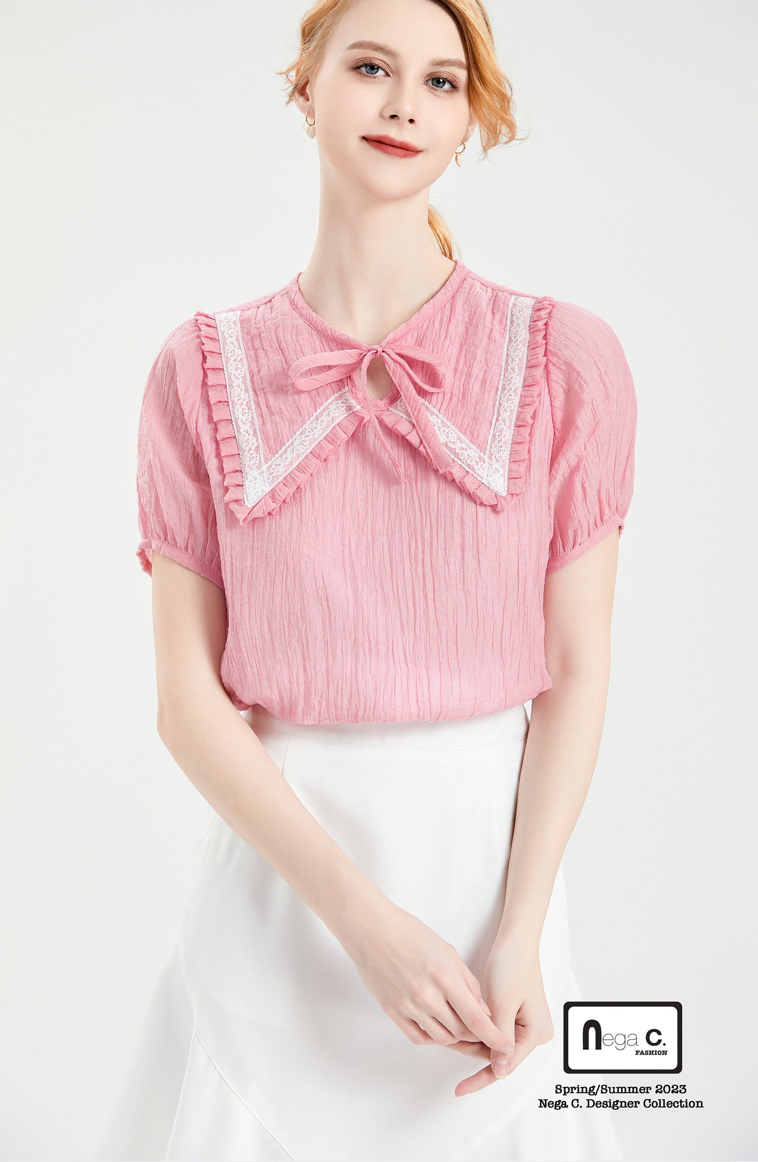 + Nega C. เสื้อลูกไม้พับคอกลม | ชมพู | ไม่ยืดหยุ่น | มีซับใน +