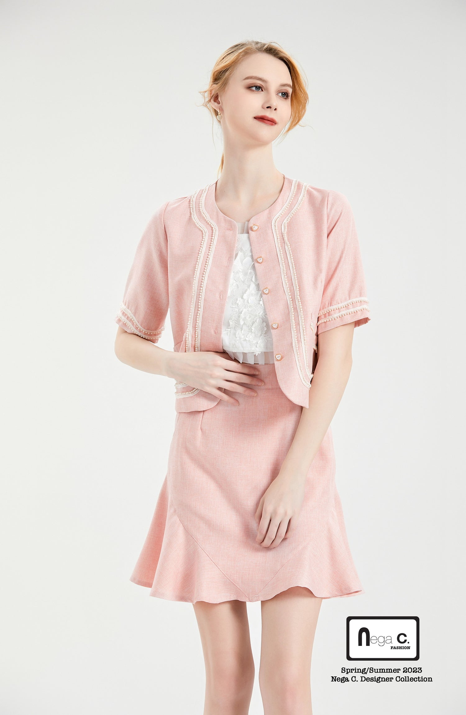+ Nega C. เสื้อแจ็คเก็ตแขนสั้นมุกคอกลม | สีชมพู | ไม่ยืดหยุ่น | มีซับใน +