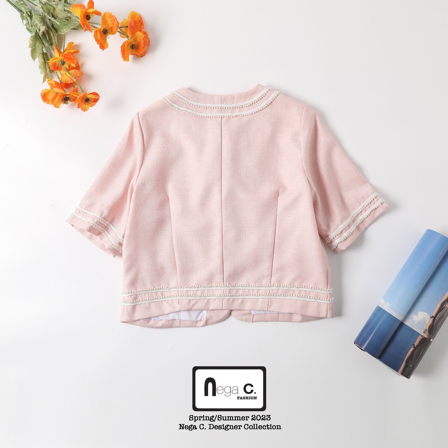 Nega C. เสื้อแจ็คเก็ตแขนสั้นมุกคอกลม |สีชมพู |มีซับใน