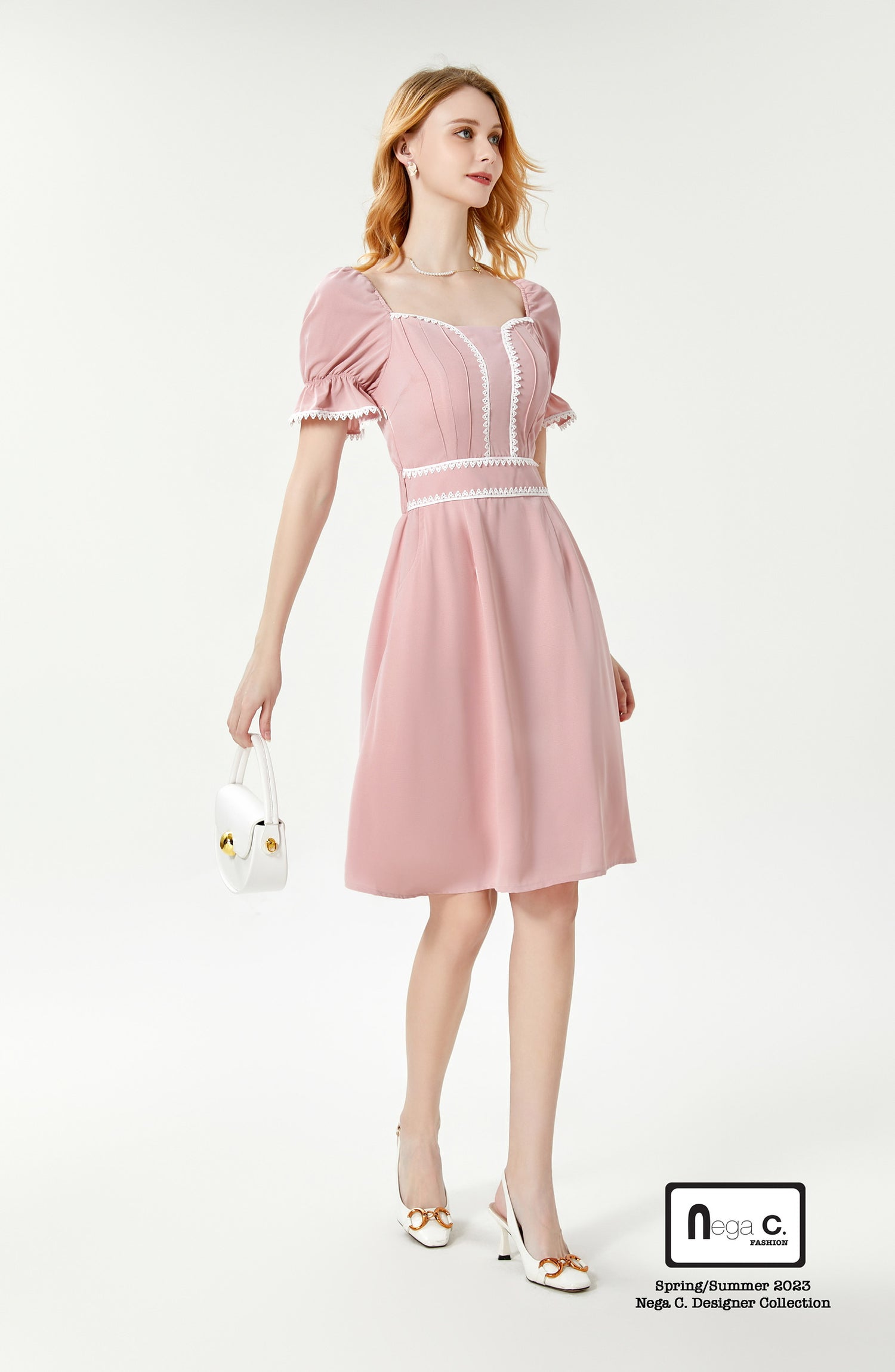 Nega C. Sweetheart Neck Lace Slim Waist Dress | สีชมพู | มีซับใน