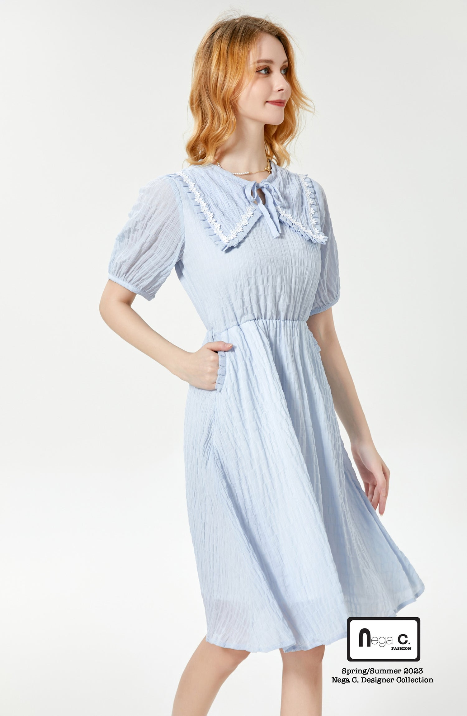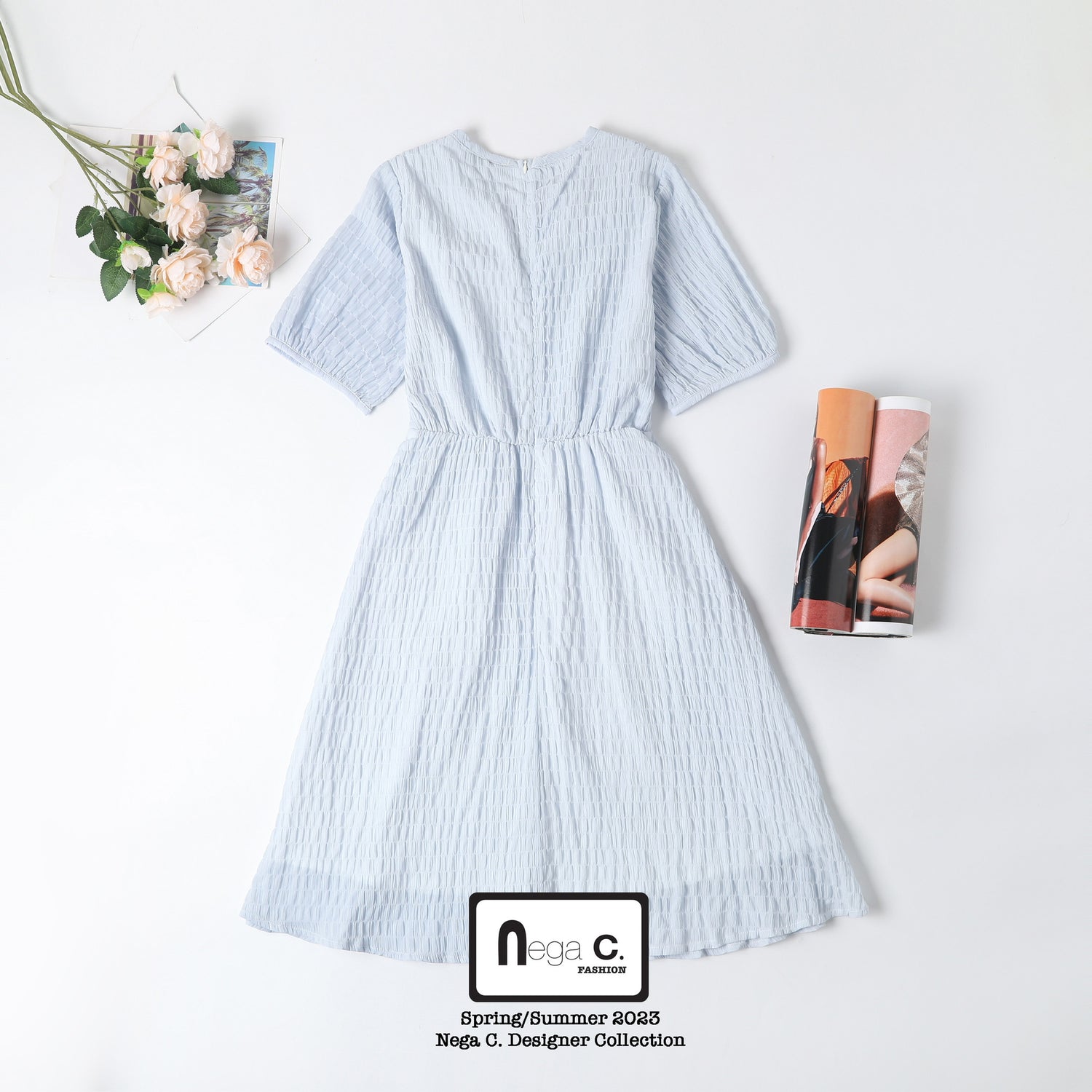 +Nega C. เดรสคอกลมจับจีบเอวผีเสื้อ | สีฟ้าพาวเดอร์ | มีซับใน +