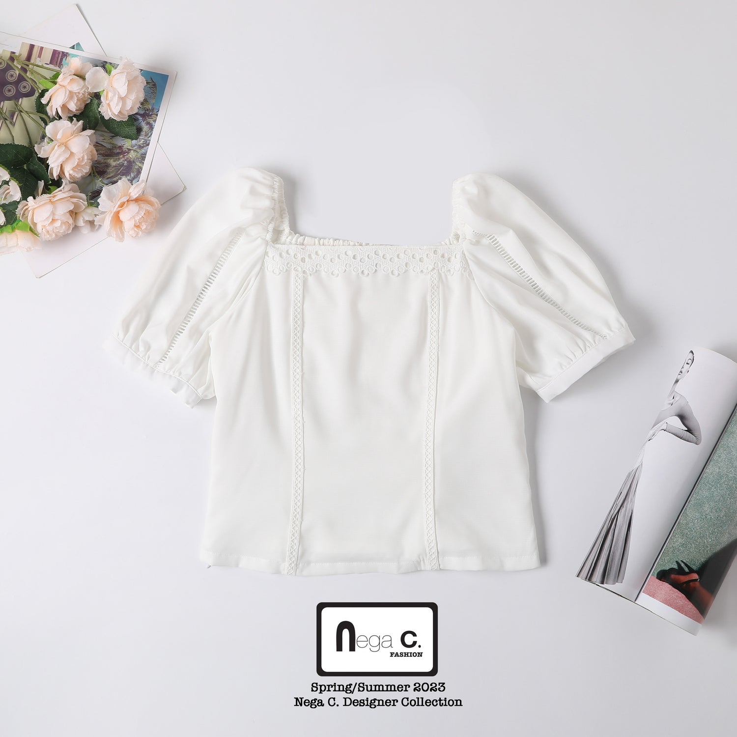 +Nega C. เสื้อลูกไม้คอเหลี่ยมแขนพอง | สีขาว | มีซับใน +