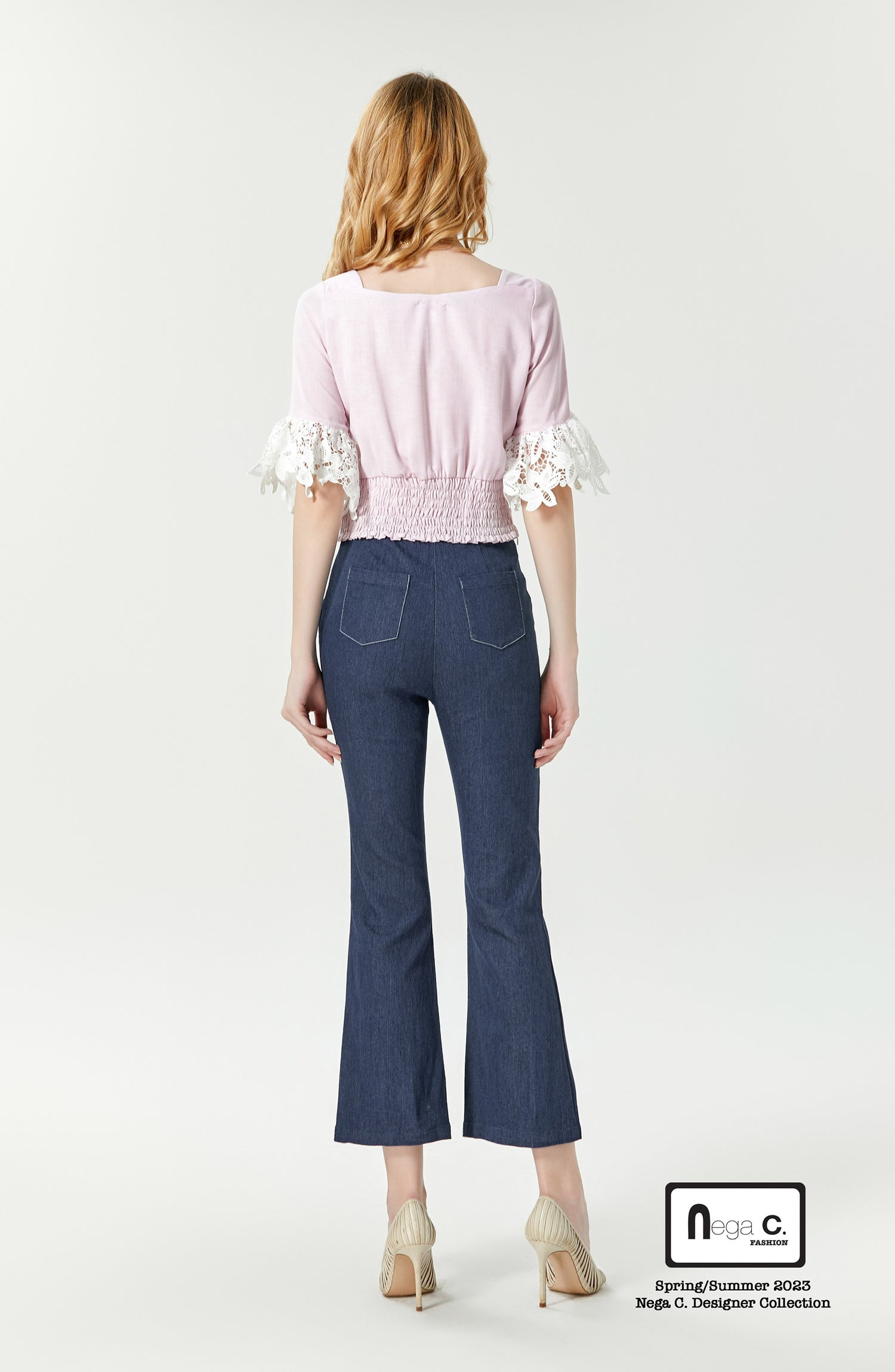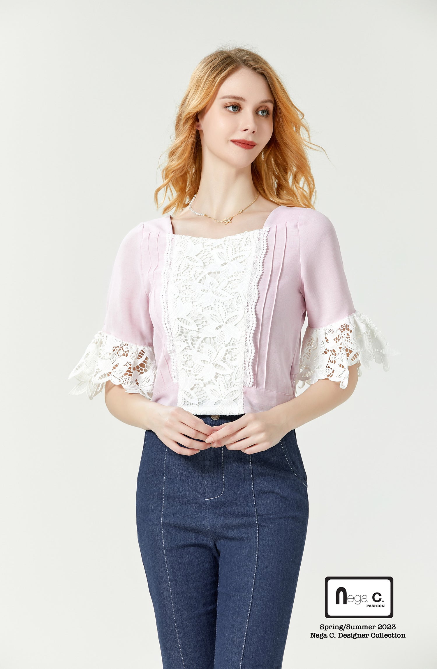 Nega C. เสื้อคอเหลี่ยมลูกไม้เย็บปะติดปะต่อแขนกระดิ่ง | สีชมพู | มีซับใน