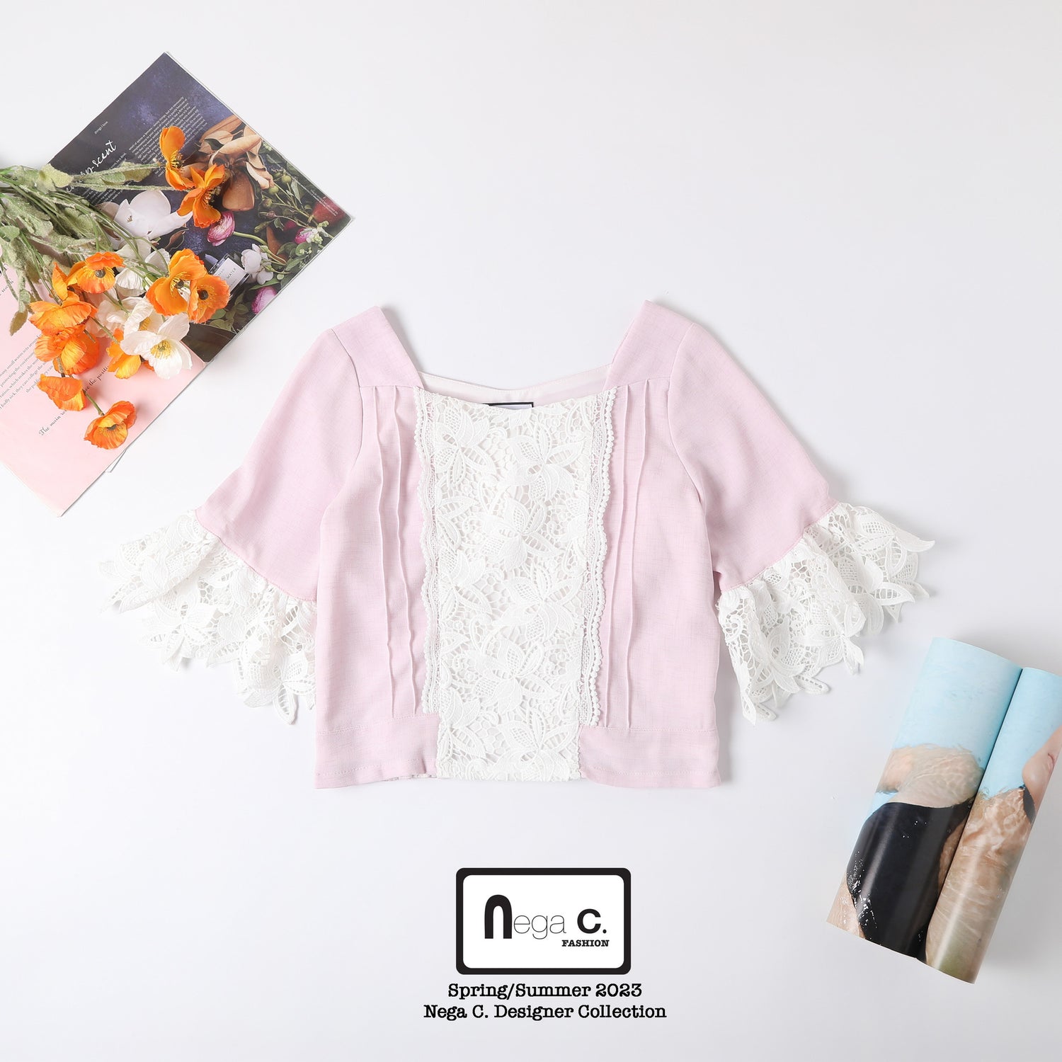 +Nega C. เสื้อคอเหลี่ยมลูกไม้เย็บปะติดปะต่อแขนกระดิ่ง | สีชมพู | มีซับใน +