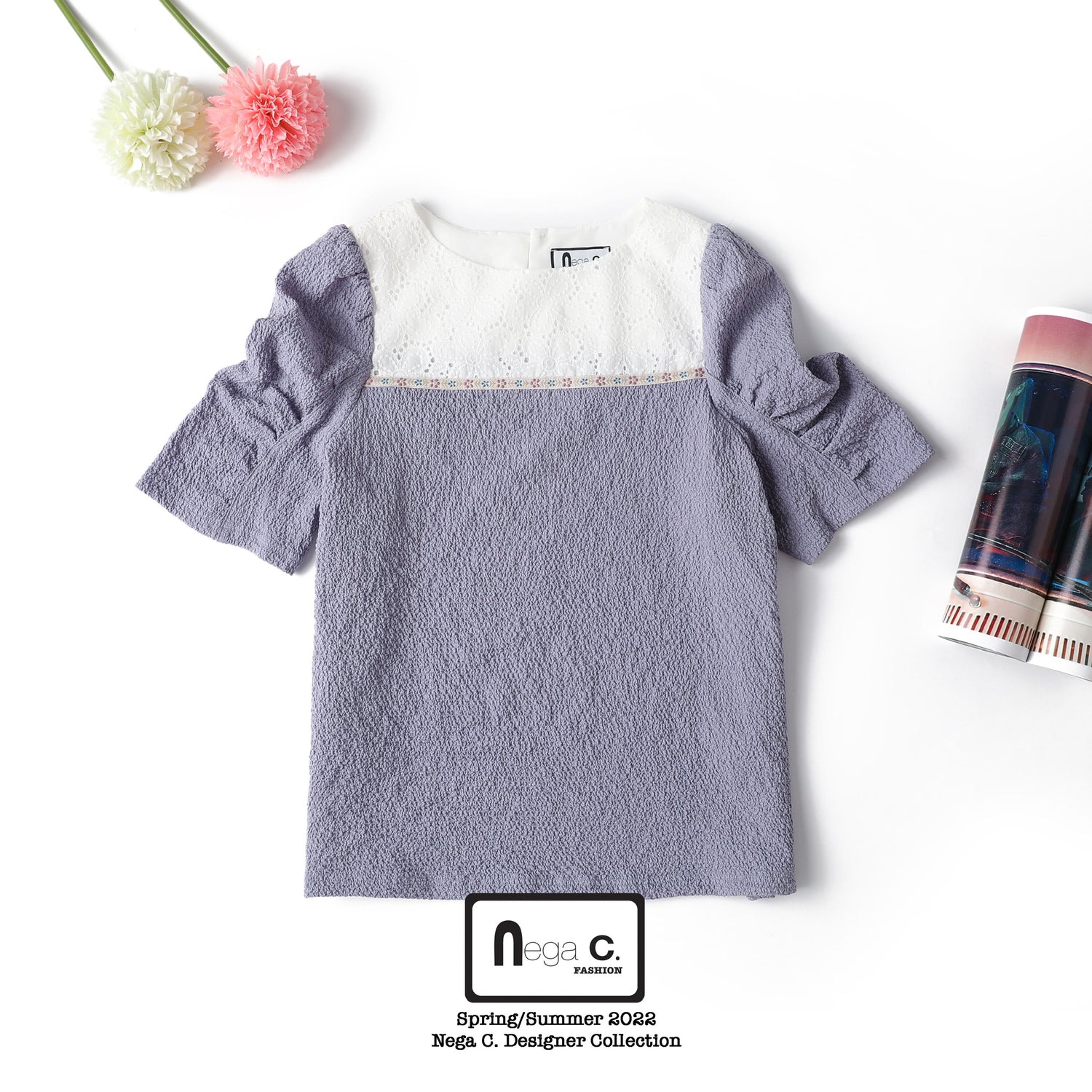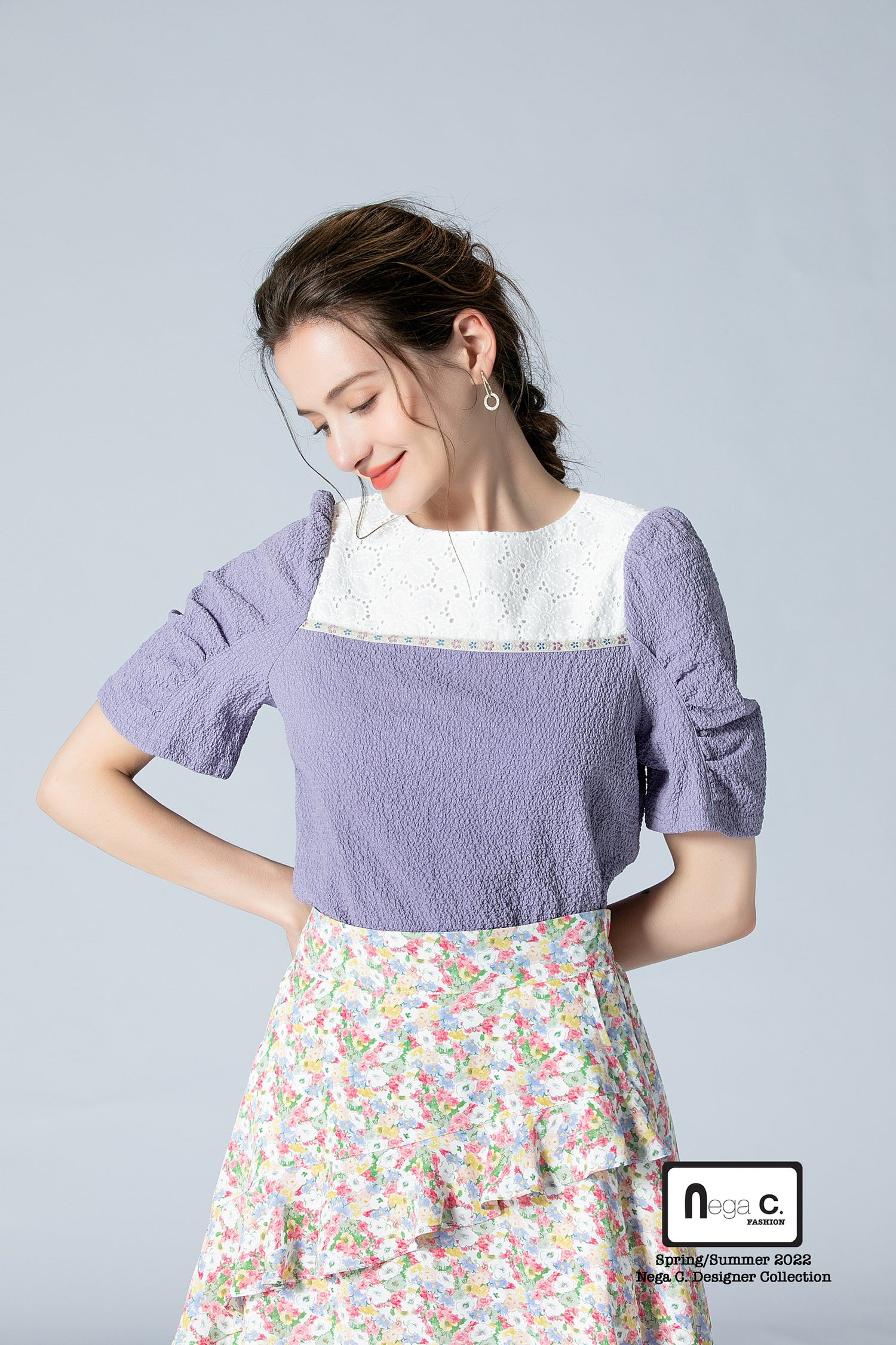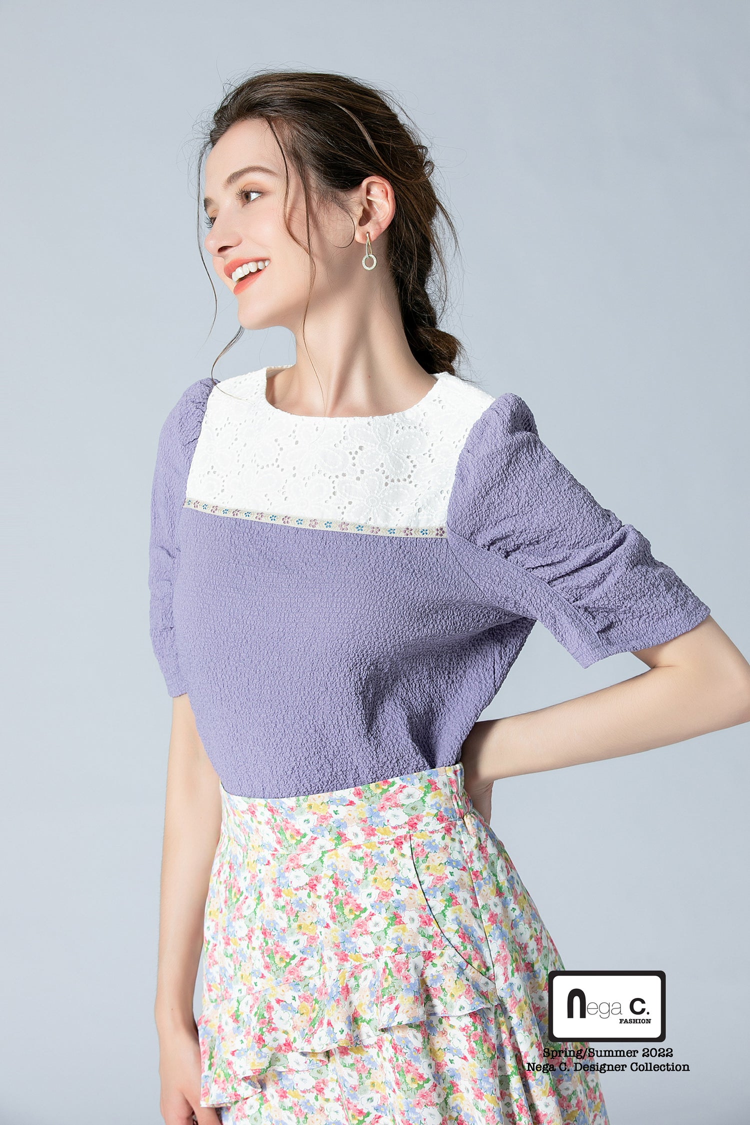 Nega C. เสื้อแขนพัฟลูกไม้เย็บปะติดปะต่อ|สีม่วง|ไม่มีซับใน