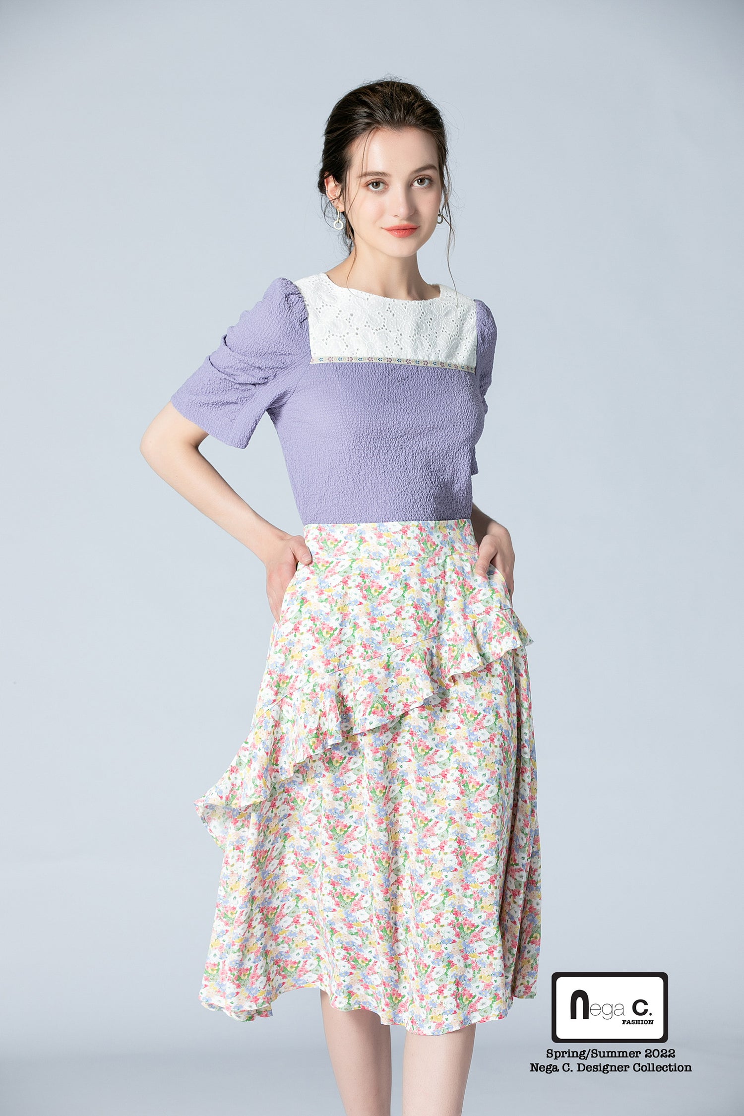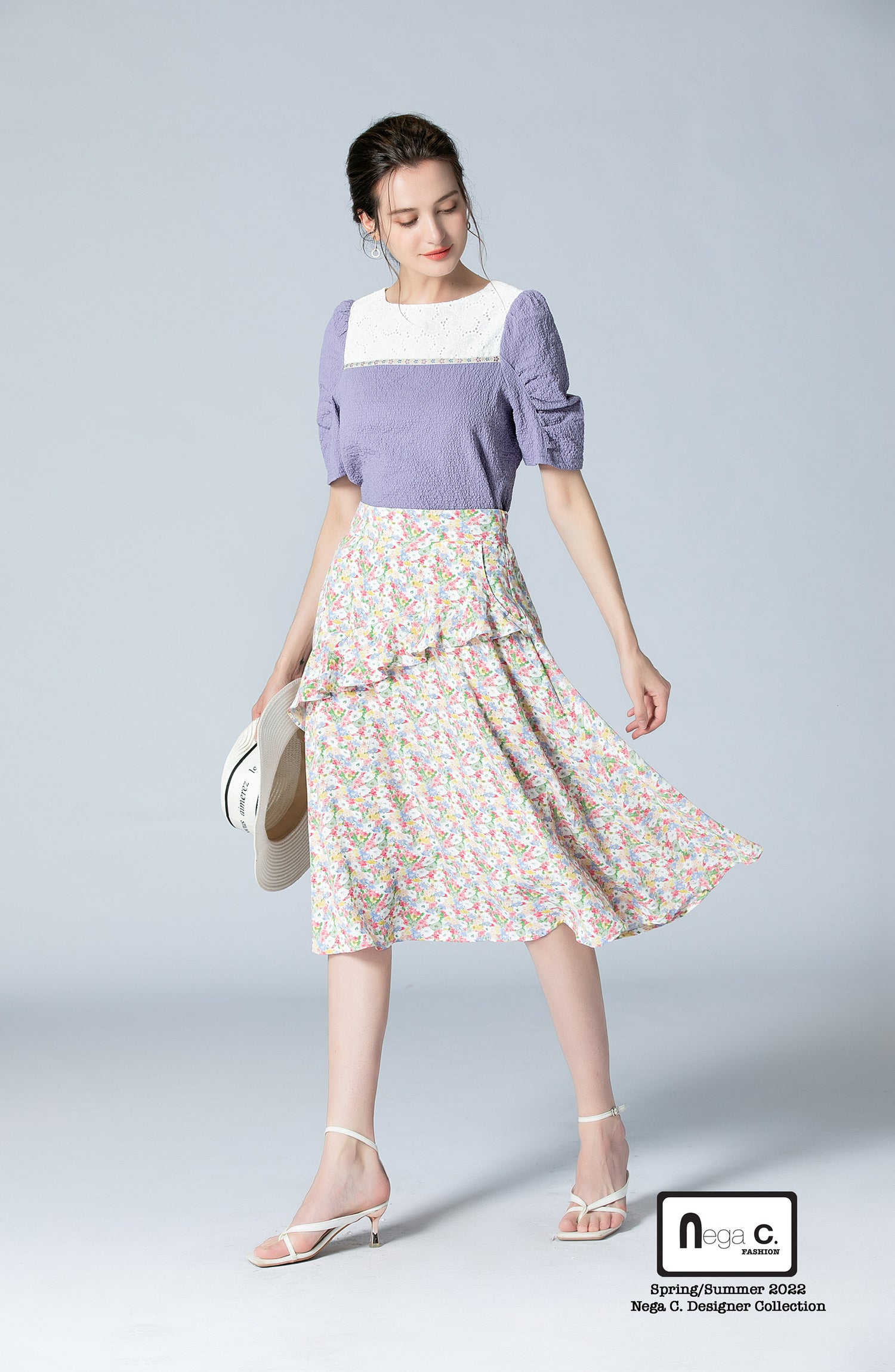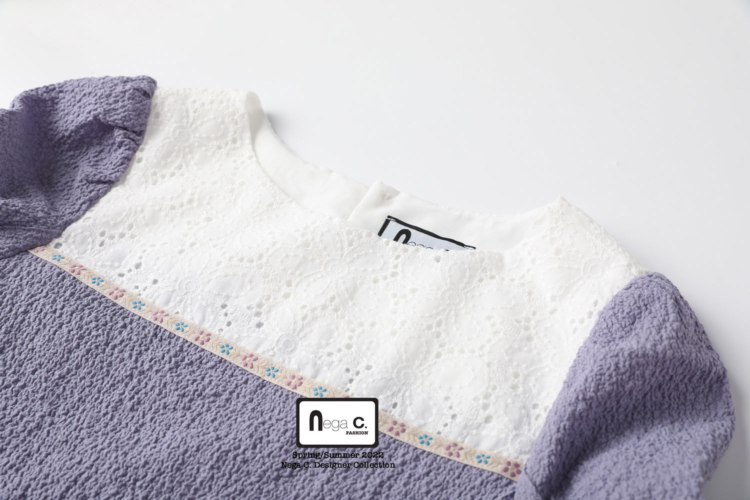 Nega C. เสื้อแขนพัฟลูกไม้เย็บปะติดปะต่อ|สีม่วง|ไม่มีซับใน